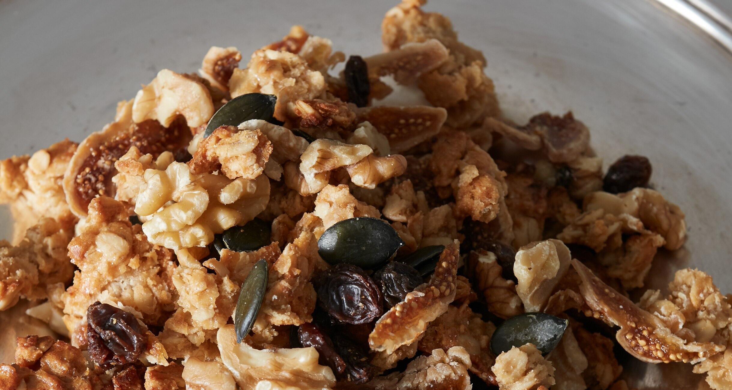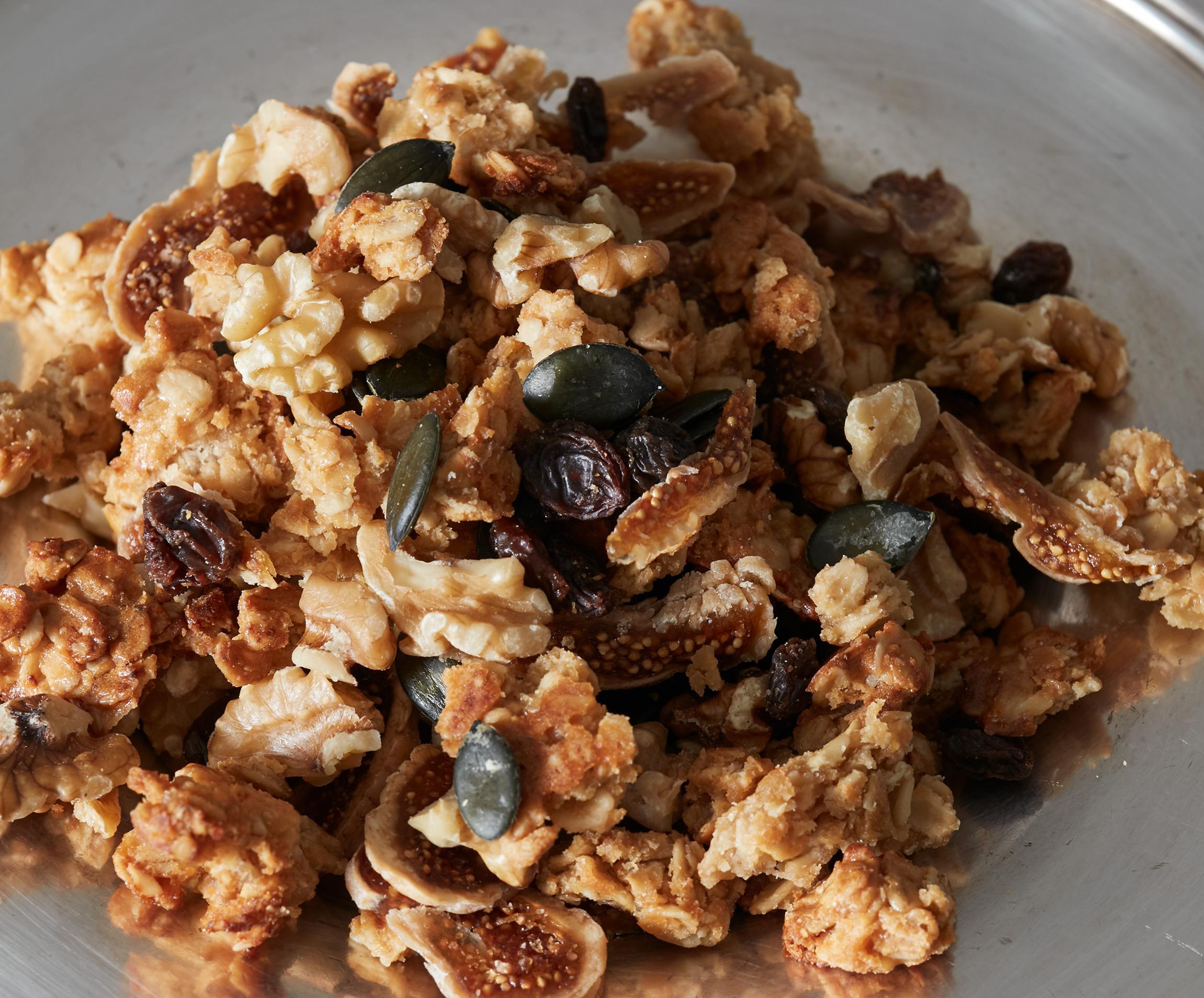 焼き上がったら天板ごと出してそのまま完全に冷まして好みの大きさにほぐし、ボウルに入れてドライフルーツやナッツを混ぜる。保存容器または袋に入れて保存。