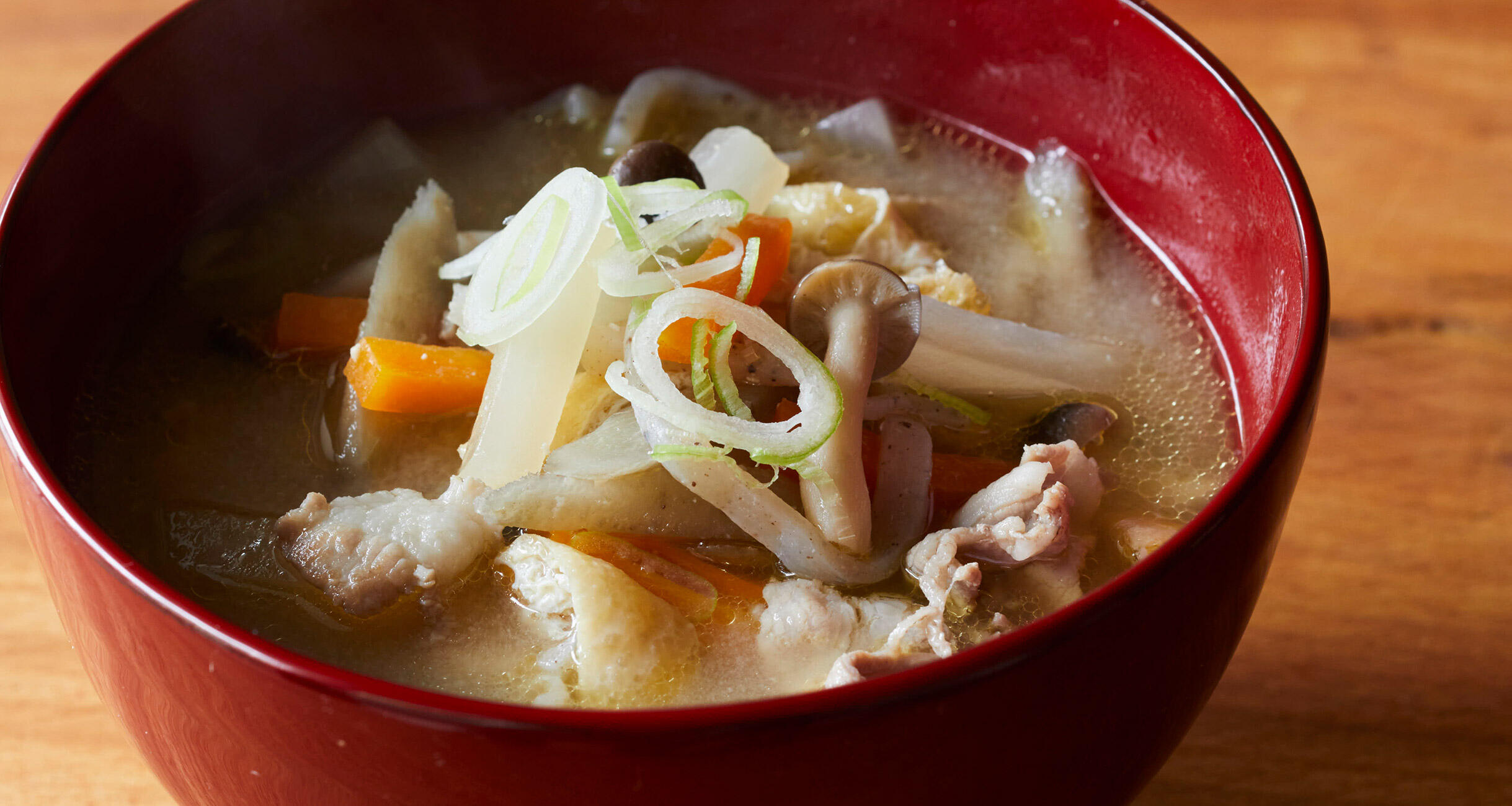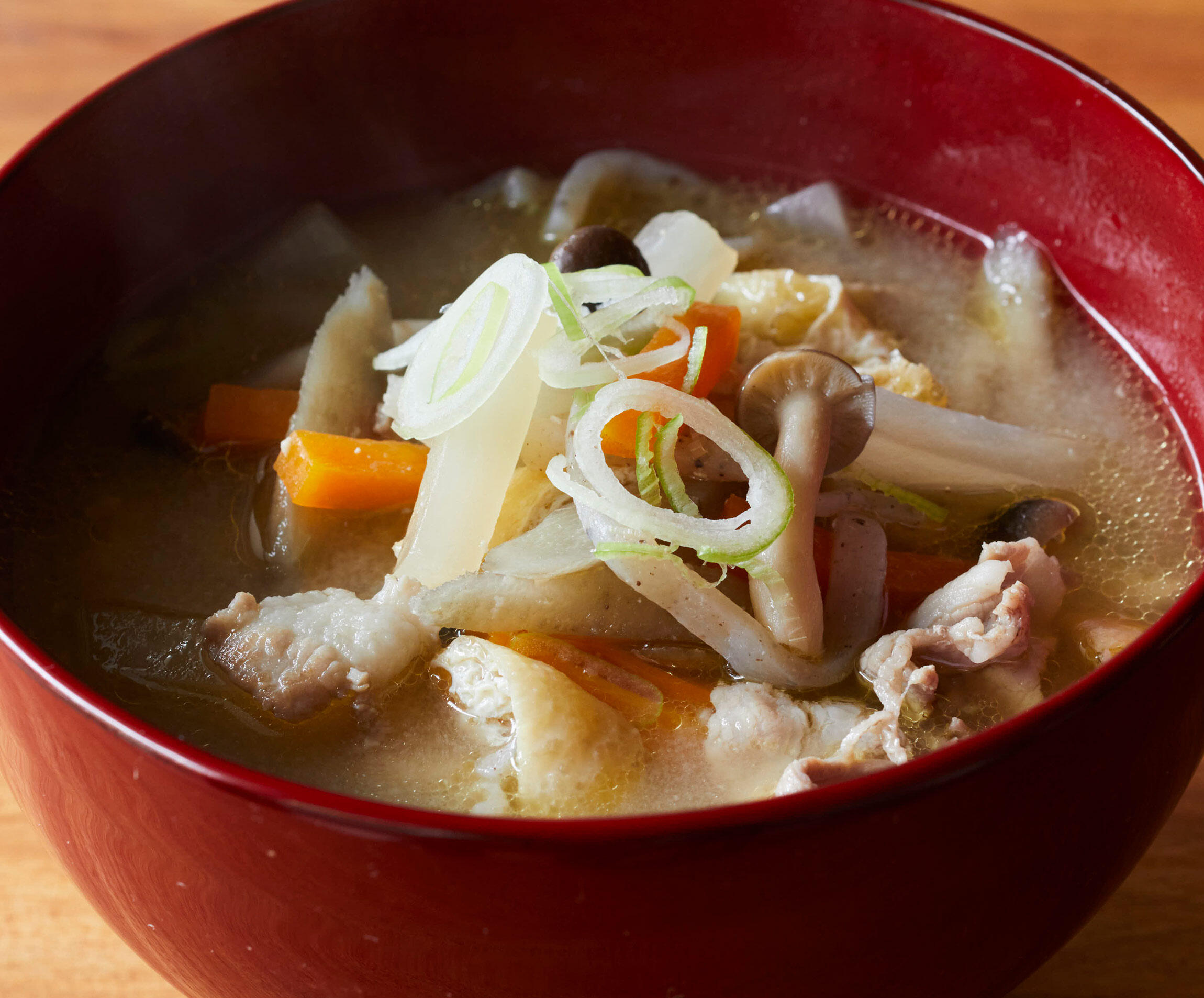野菜はごぼう、にんじん、大根などをたっぷり。豚肉と根菜から出る旨味でだしいらず。温かい汁物は体を芯から温めてくれます。