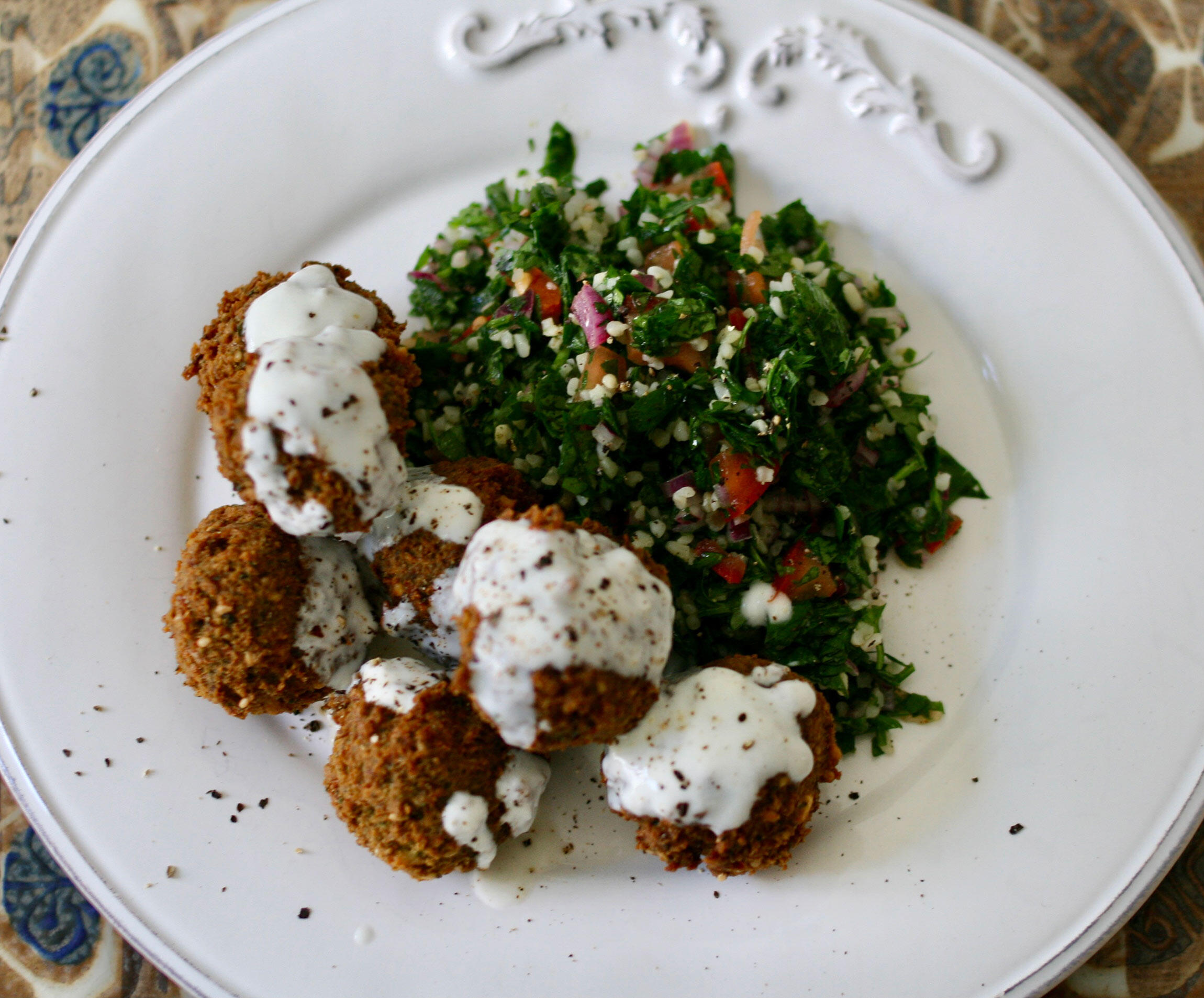 プレートにタブレとファラフェルを並べ、ファラフェルにヨーグルトソースをかけて召し上がれ。
