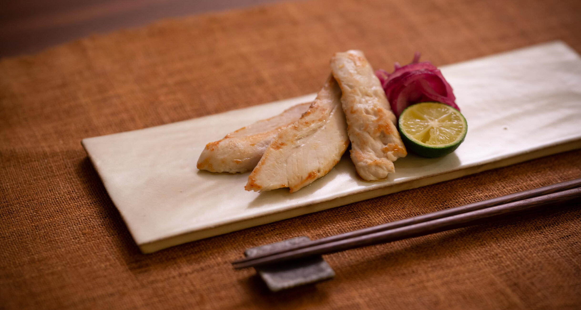 焼き方のポイントは、中火で八割方火を入れること。厚みを半分にすると火の通りが早く、全体に白くなって、うっすら焼き色がついたら完成です。これだけで十分おいしいのですが、今回はつくり置きした紫玉ねぎのマリネを添えました。見た目にきれいな上、甘酸っぱさが味のアクセントになります。多めにつくって常備しておくといろいろな料理のあしらいになり、冷蔵庫で保存すれば1週間は持ちます。
