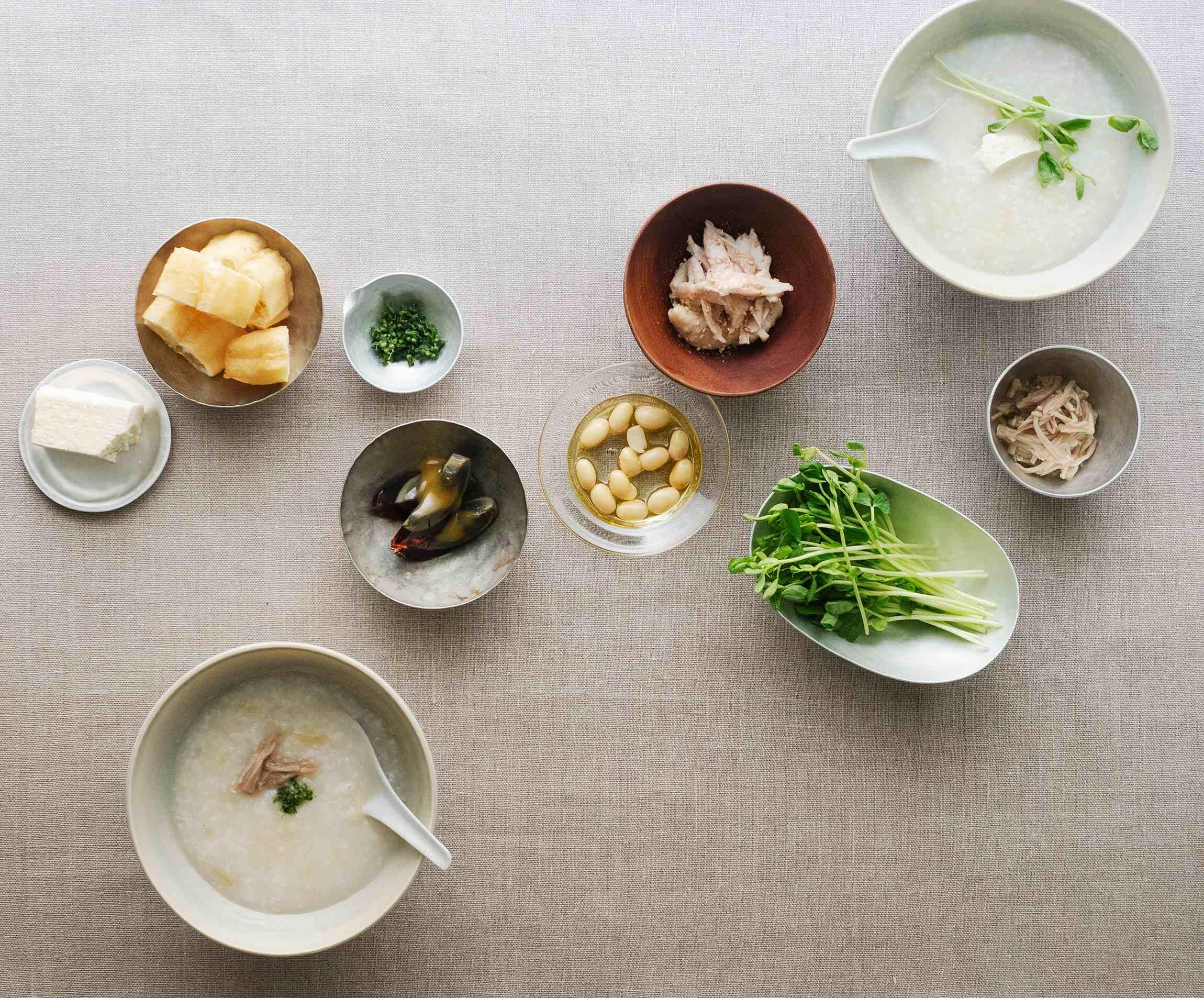 起き抜けのからだにやさしいのは、なんといっても朝粥です。鶏手羽からとったスープでお粥を炊き、取り出した鶏手羽の肉は裂いて胡麻油と塩で和えれば、ぴったりの添え物に。ピータンやなめ茸、塩漬け豆腐といった常備菜や、フレッシュな豆苗を添えて、少しずつ味を変えながらいただきます。添え物はガラスや、坂野友紀さん作の金属の小さな器に入れてたくさん並べると、軽やかで楽しげ。お粥の碗には金属と相性のいい青磁を選び、朝の清々しさを演出して。