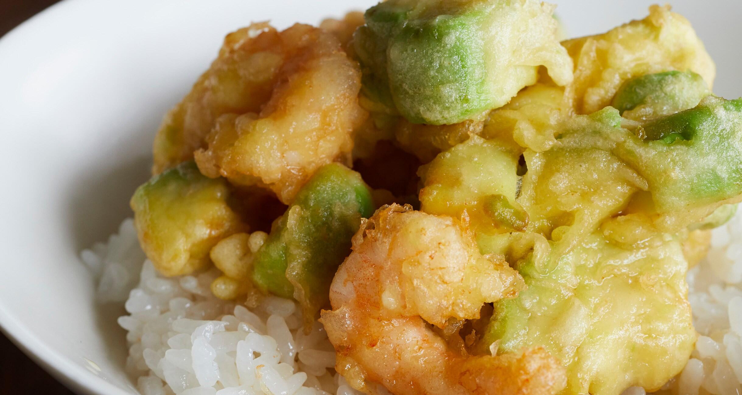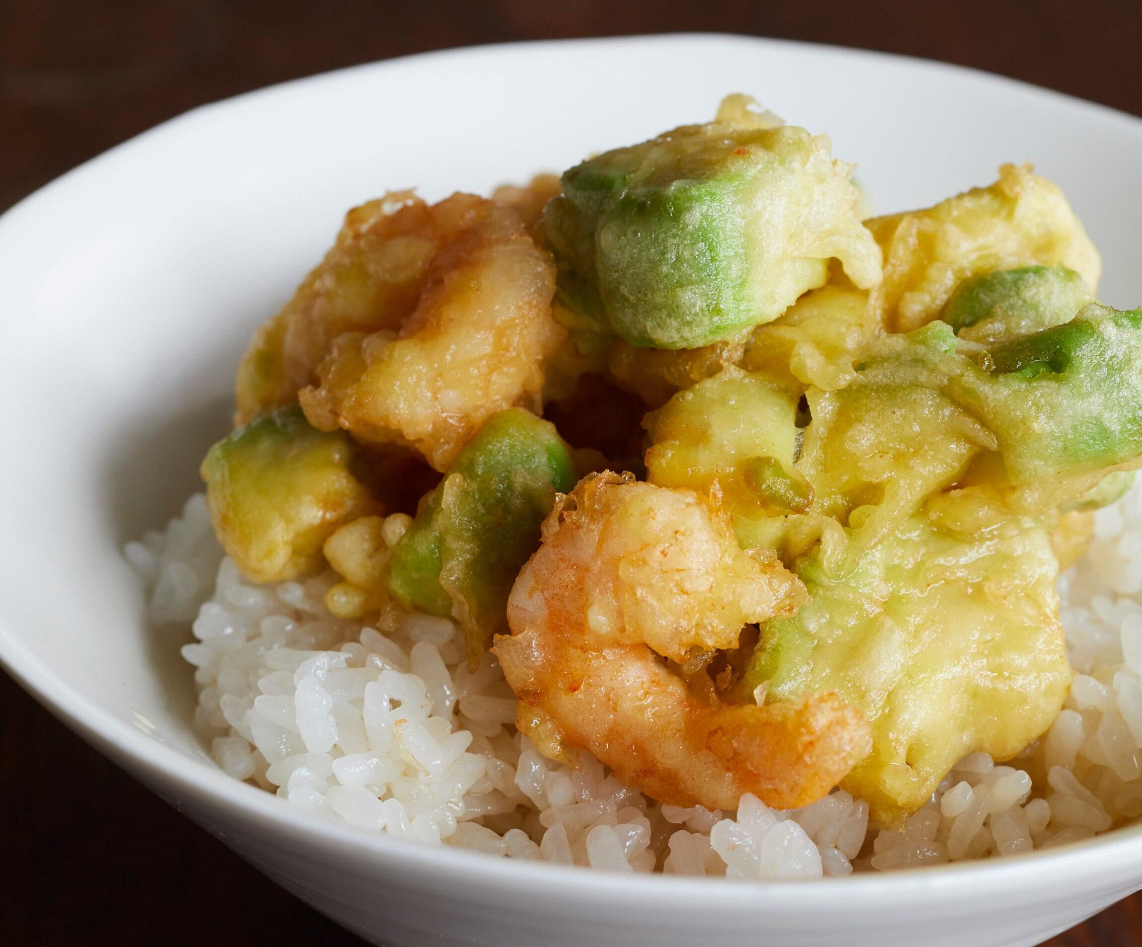 天ぷらにアボカドをプラス。シンプルにアボカド単体で揚げてもよし、エビとのかき揚げならなおよし。かき揚げそのものを味わってもよし、かき揚げ丼にすればさらによし!
