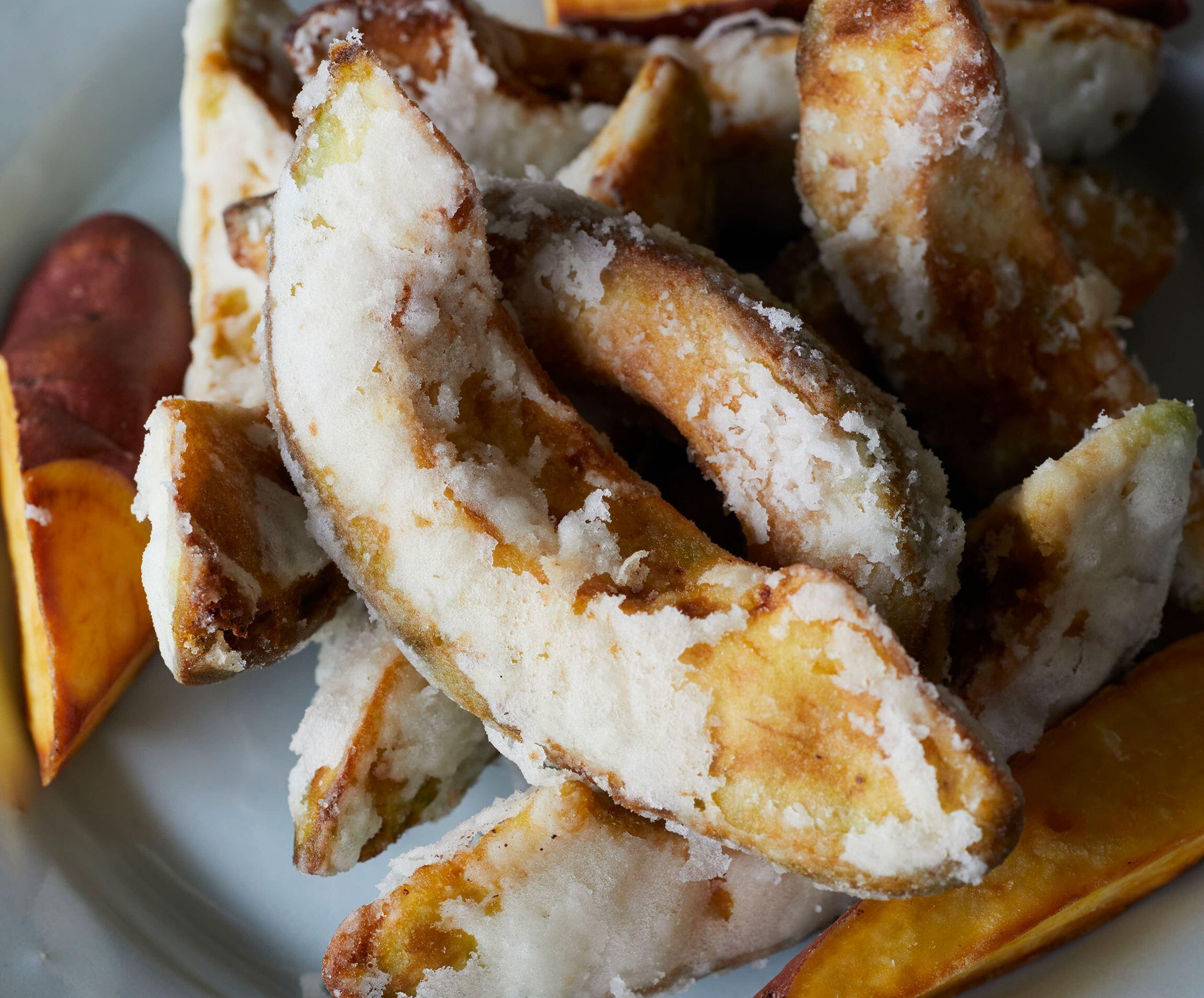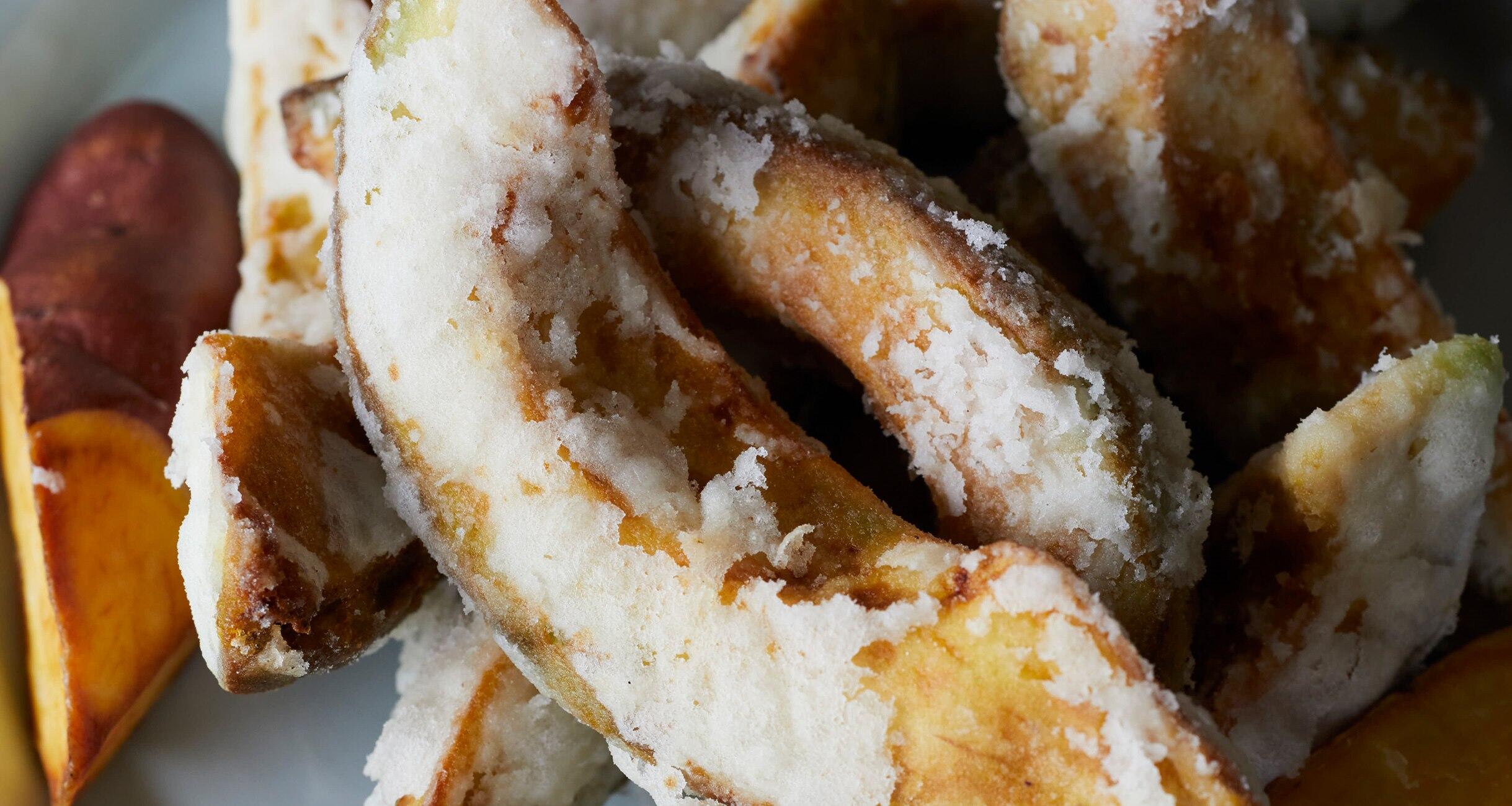 アボカドにはしっかり下味をつけてから揚げるのがポイント。さつまいもを合わせてホクホク同士の共演。さつまいもはゆっくり素揚げにして、甘味を引き出します。