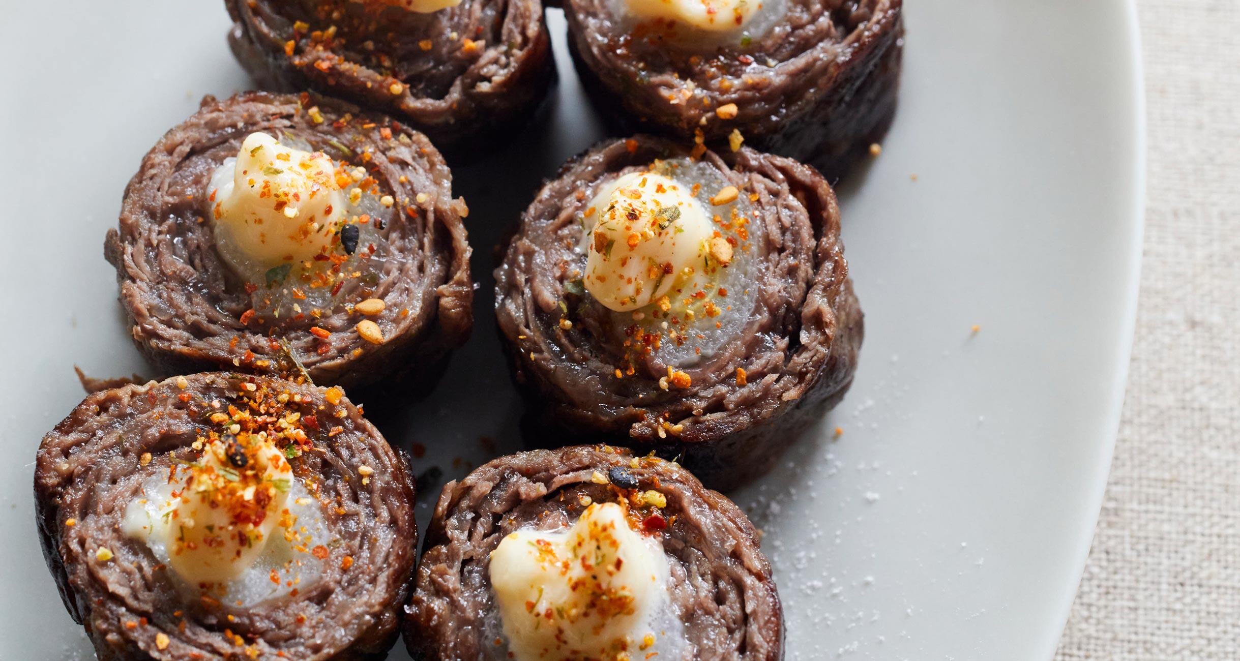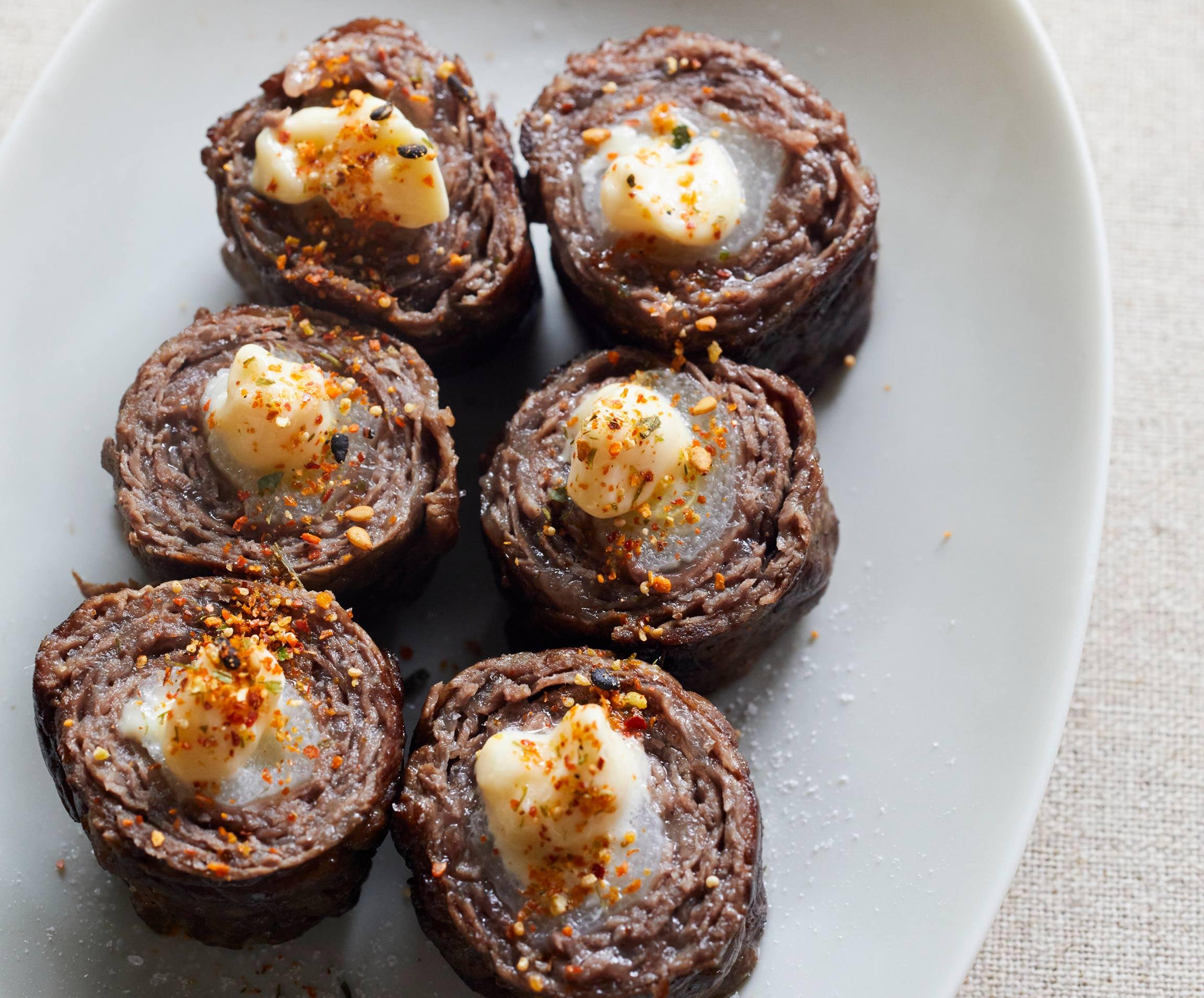 牛肉を端を少し重ねながら幅10cmに広げて2組つくり、表面に下味用の塩、片栗粉を軽くふり、牛肉の手前にねぎをのせて巻く。