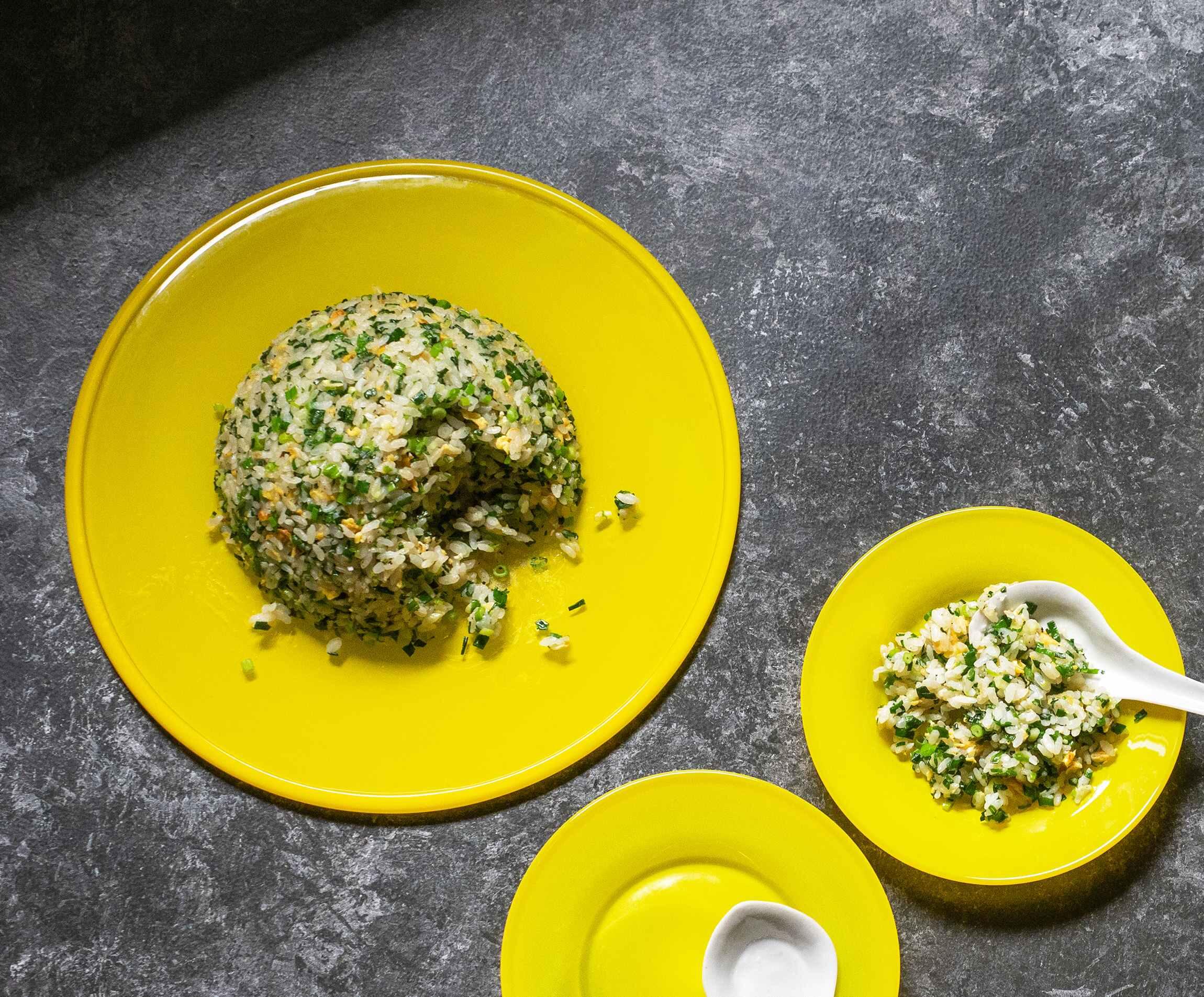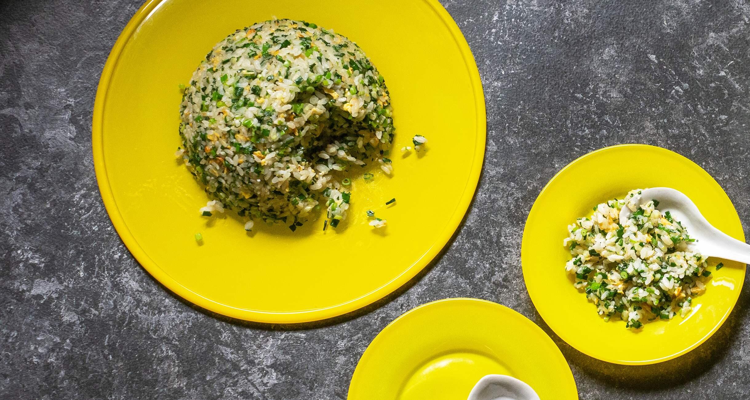 ぱっと気分が明るくなる黄色のガラス皿は、辻和美さんが北欧雑貨店『SPOONFUL』の展示に合わせてつくったもの。鮮やかな色合いと質感が、シンプルな炒飯を引き立ててくれます。平皿に盛るときは型抜きすると、立体的に盛れます。炒飯は驚くほどたくさんの青ねぎが入っているので、風味豊かな味わい。