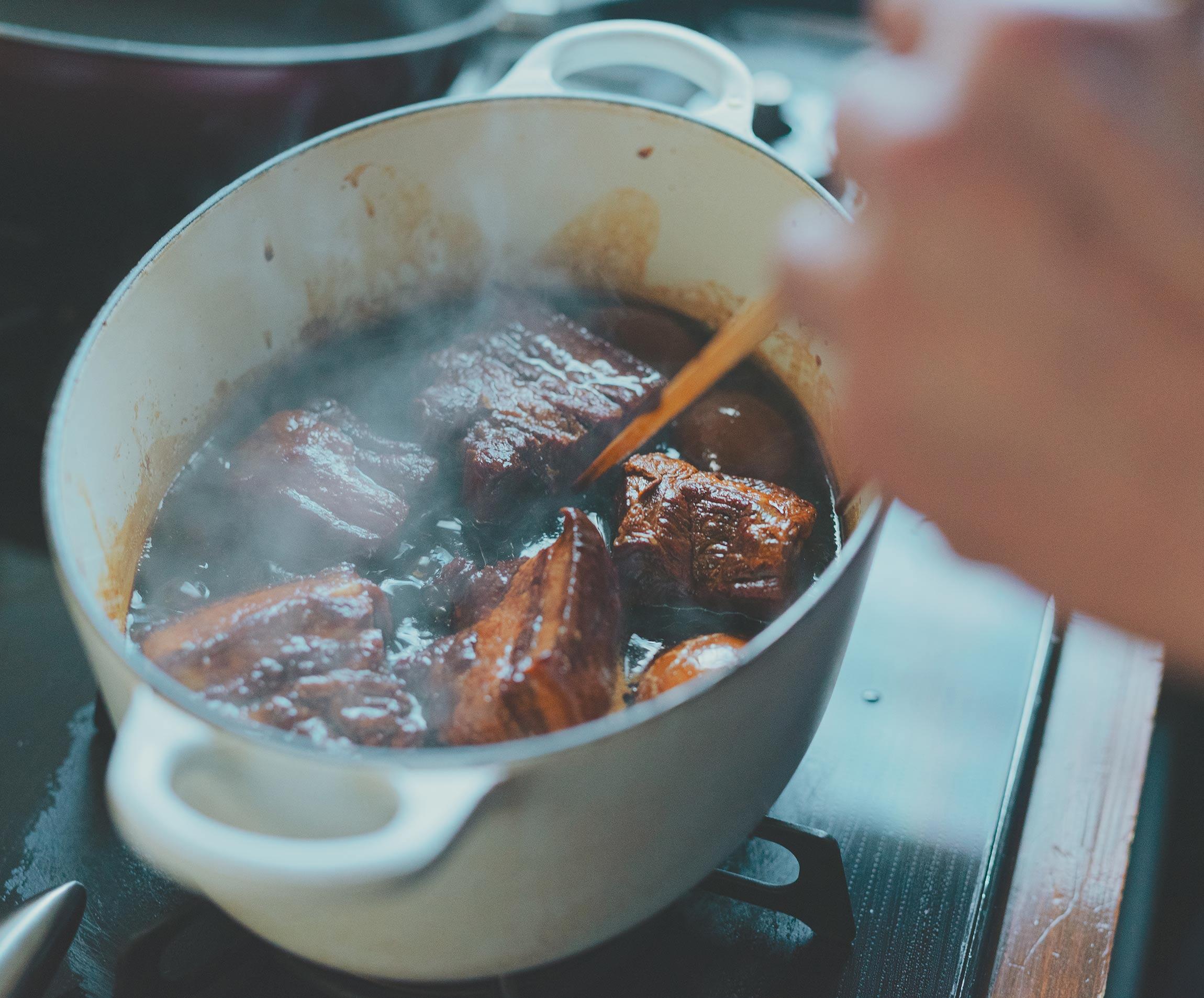 撮影前に編集部から、日常的な食卓の風景を撮りたいので何かもう一品お願いできないか?と頼んだところ、つくってくれたのが中国料理“東坡肉(トンポウロウ)”。