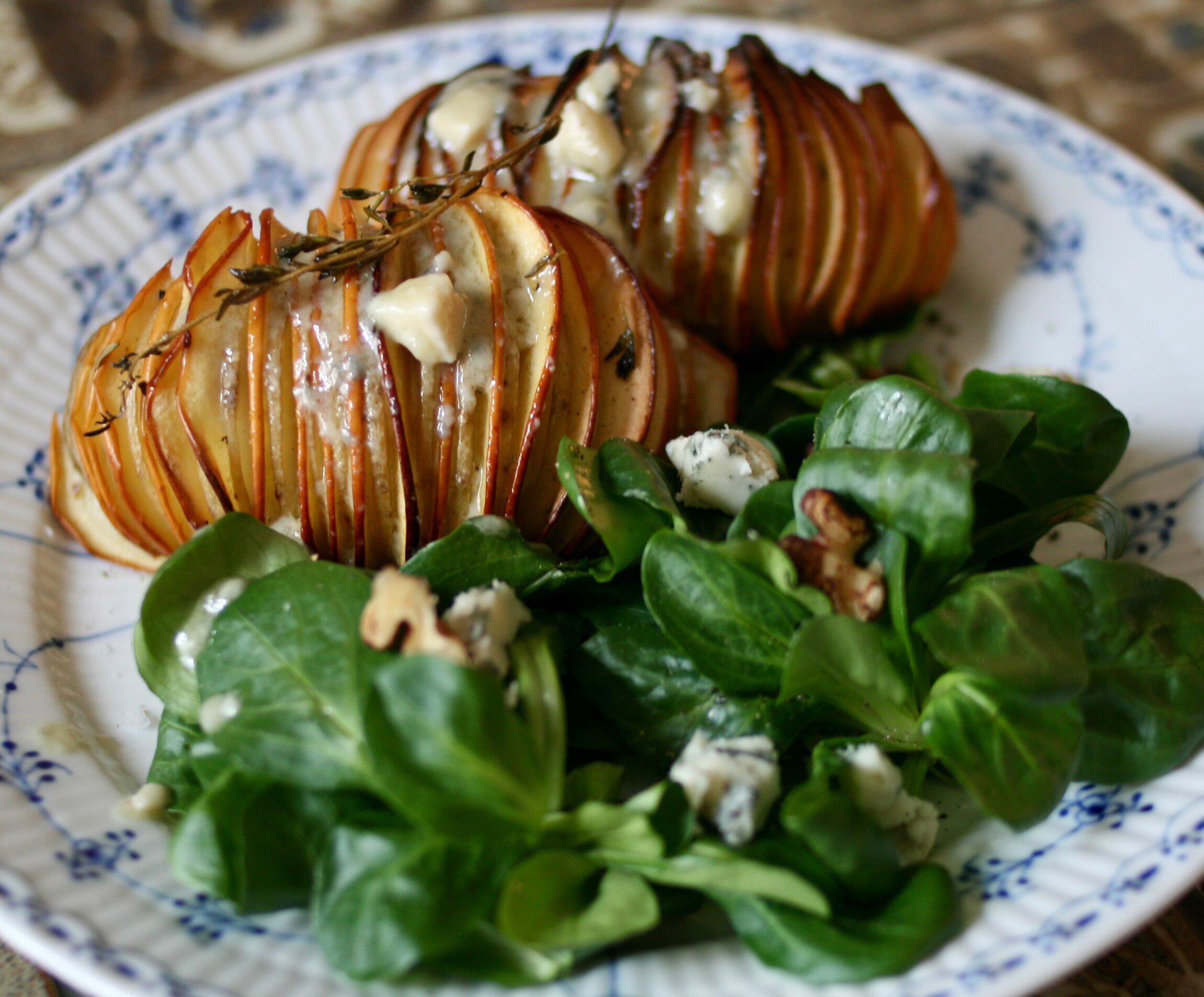 お皿に葉野菜、焼き上がったじゃがいもを盛りつけ、軽く炒ったクルミを飾り、最後に温かいロックフォールソースをかけて召し上がってください。