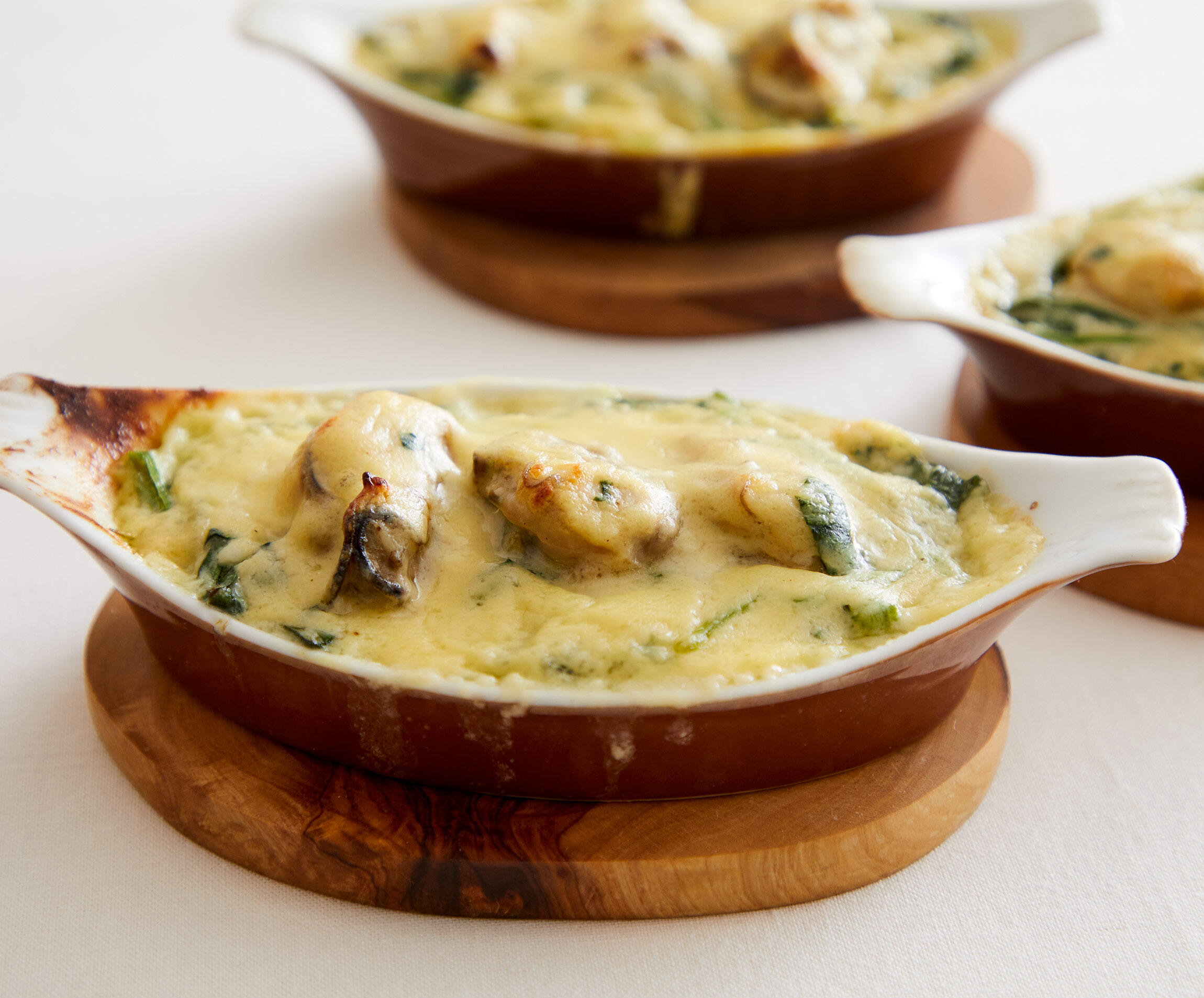 冬が旬のかきとほうれん草を取り合わせた、この時期ならではの一品。ほうれん草、かきの順に盛りつけて焼くと、見た目に贅沢感が出ます。