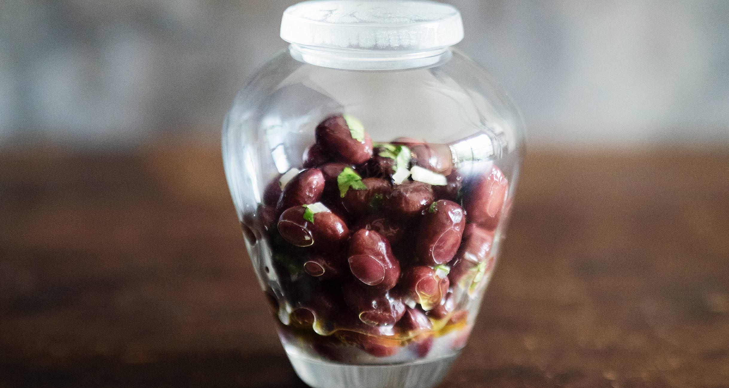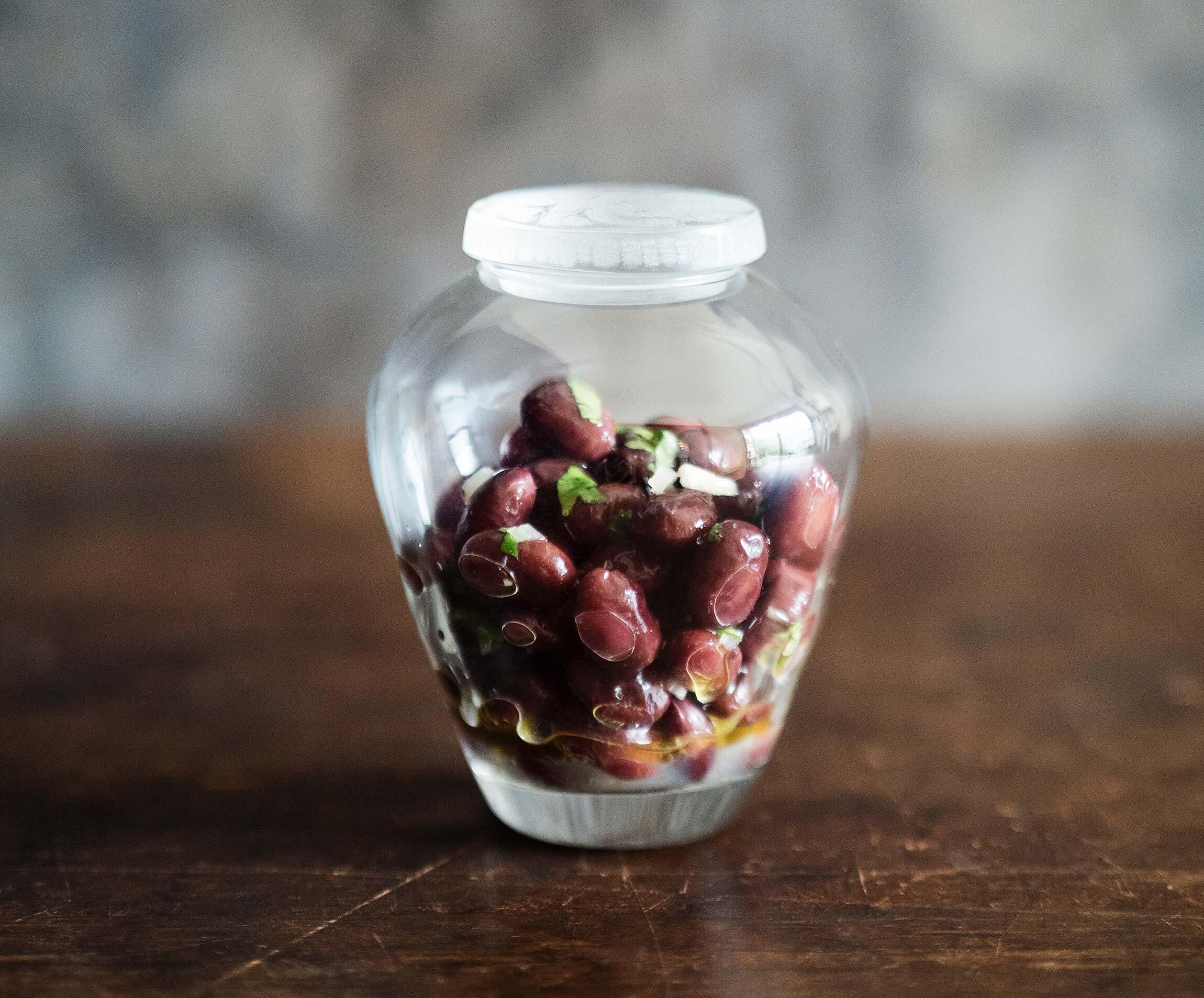 この艸田(くさだ)正樹さんのガラスの茶壺は、そのまま飾りたくなるような静謐な佇まいですが、器に使っても面白いかなと思って手に入れました。蓋があると冷蔵庫にそのまま入れられるので、ちりめんじゃこや煮豆のような常備菜を入れても便利だし、食卓に出せばなんだか特別な感じを演出できます。黒豆は甘く煮るのもいいけれど、こんなふうに果汁とオリーブオイルでマリネに仕立てると、サラダ感覚でたくさん食べられますよ。