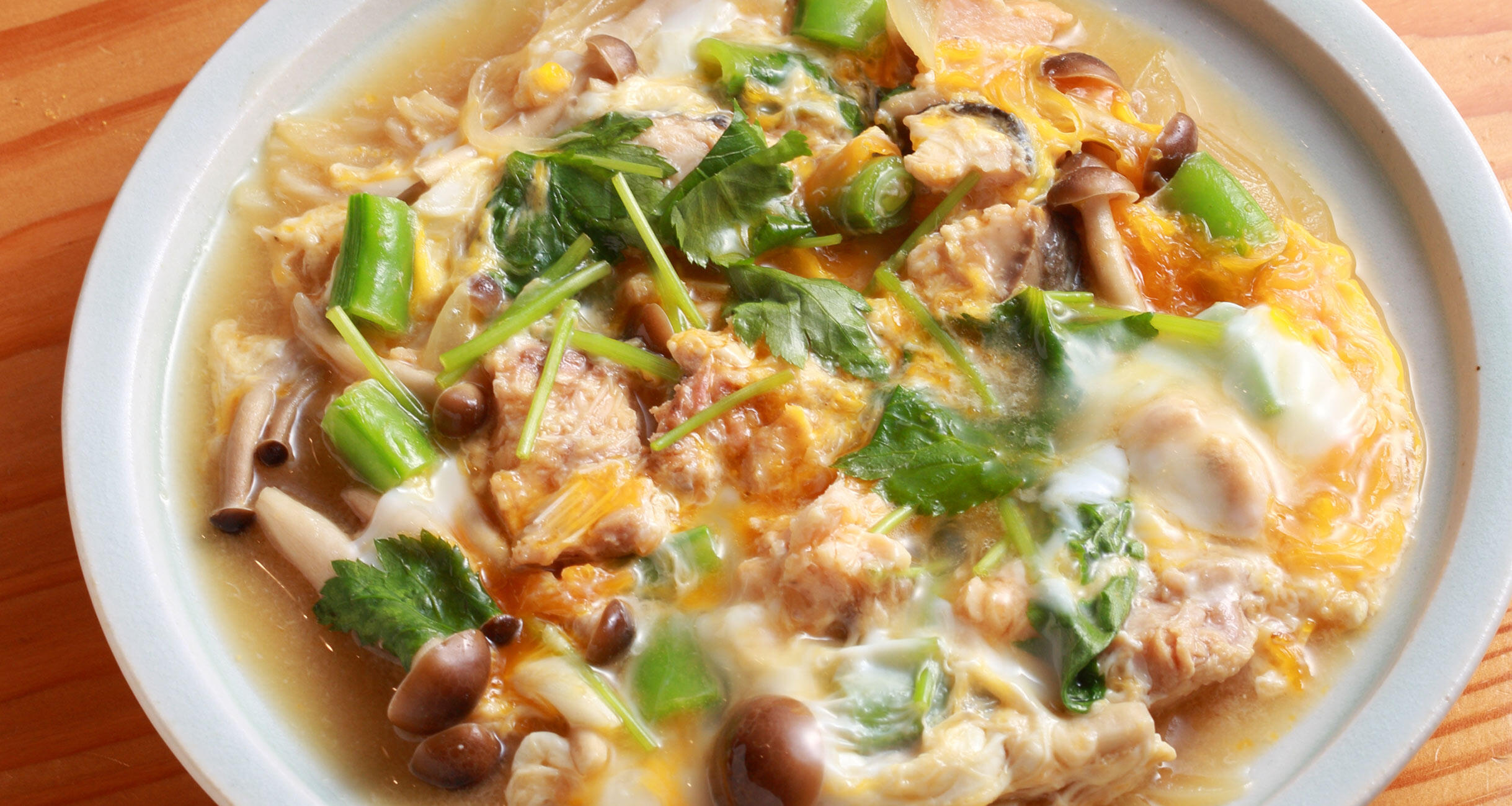 スナップえんどうを加え、長さ2cmに切った三つ葉を散らし、溶き卵でとじる。