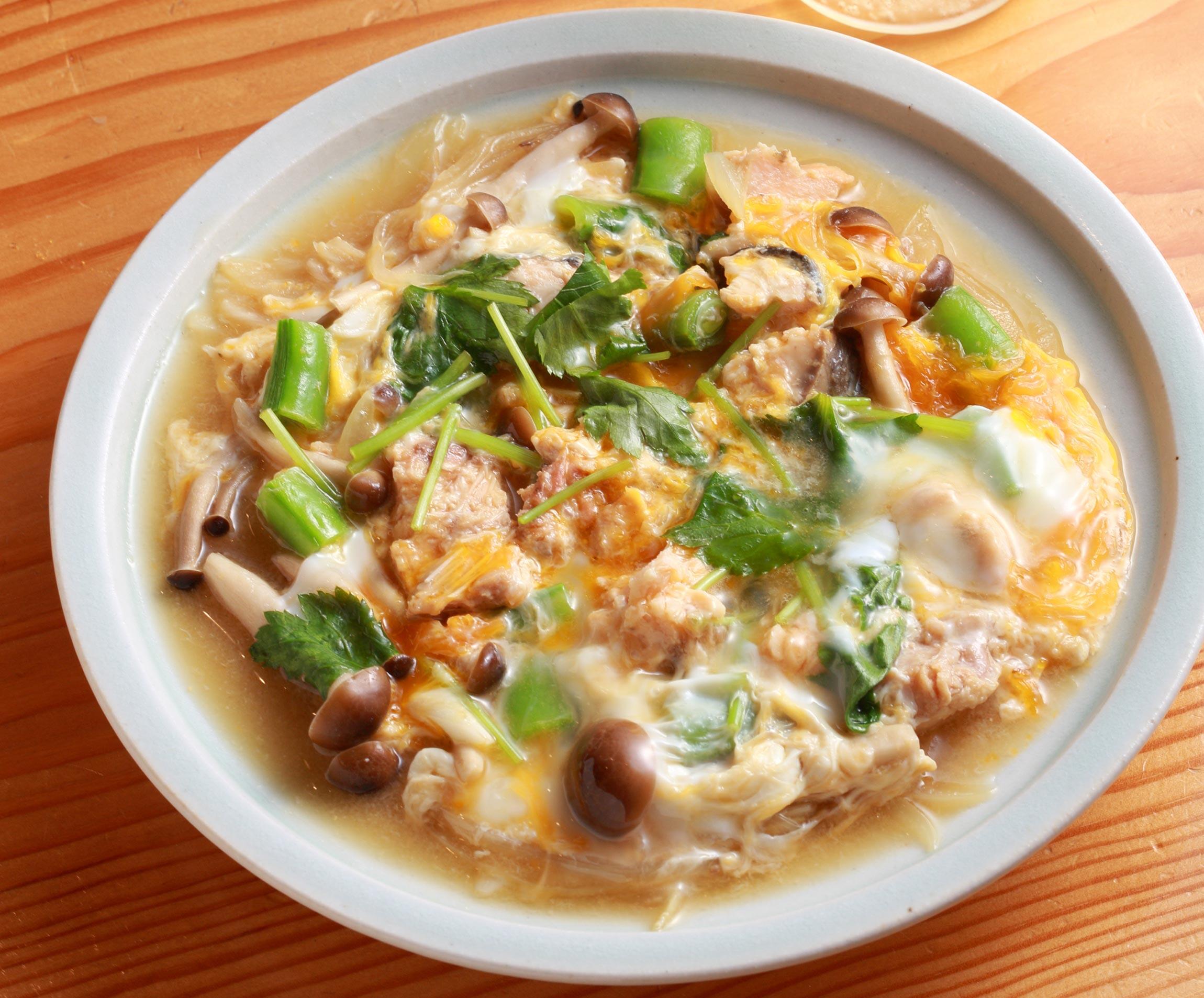 「卵好きのお父さんのための、呑める卵料理です。缶詰の汁だけだとちょっと旨味が足りないので、ここはだしを足してカバーしてほしい」と上野さん。あとは簡単!ふつふつ煮立ったら卵でとじるだけ。しっかりとした味つけがハイボールを誘い、ご飯にのっけて丼にもしたくなる。