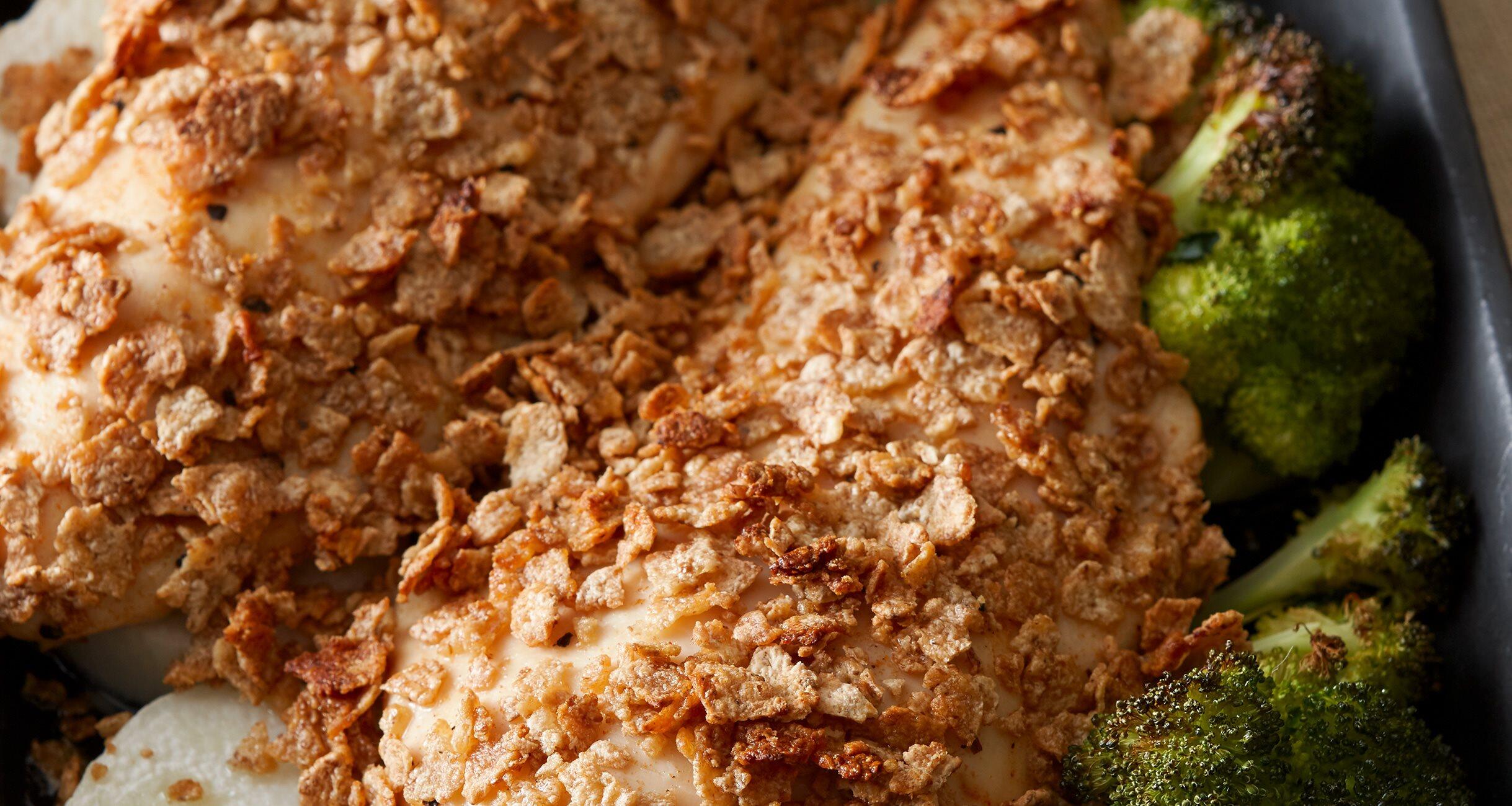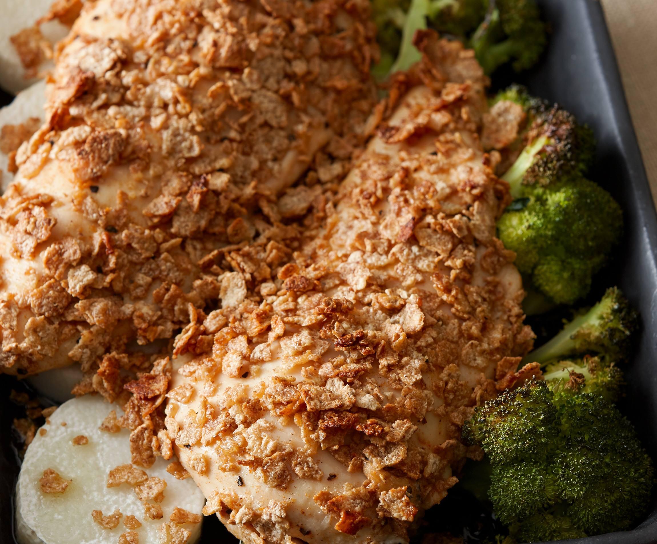 鶏肉に卵白をまぶし、玄米フレークを両面にまぶす。