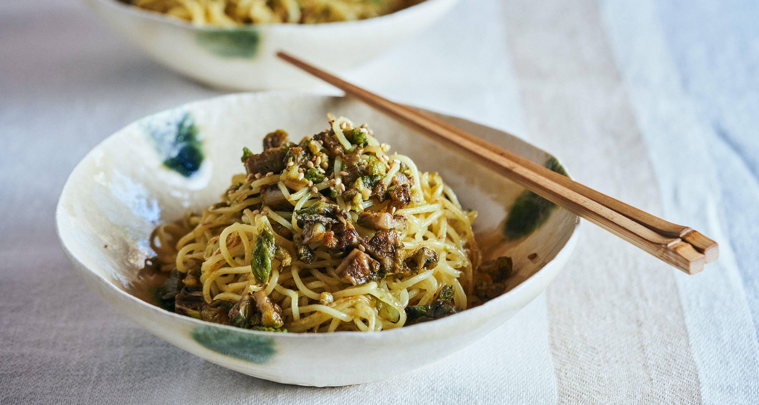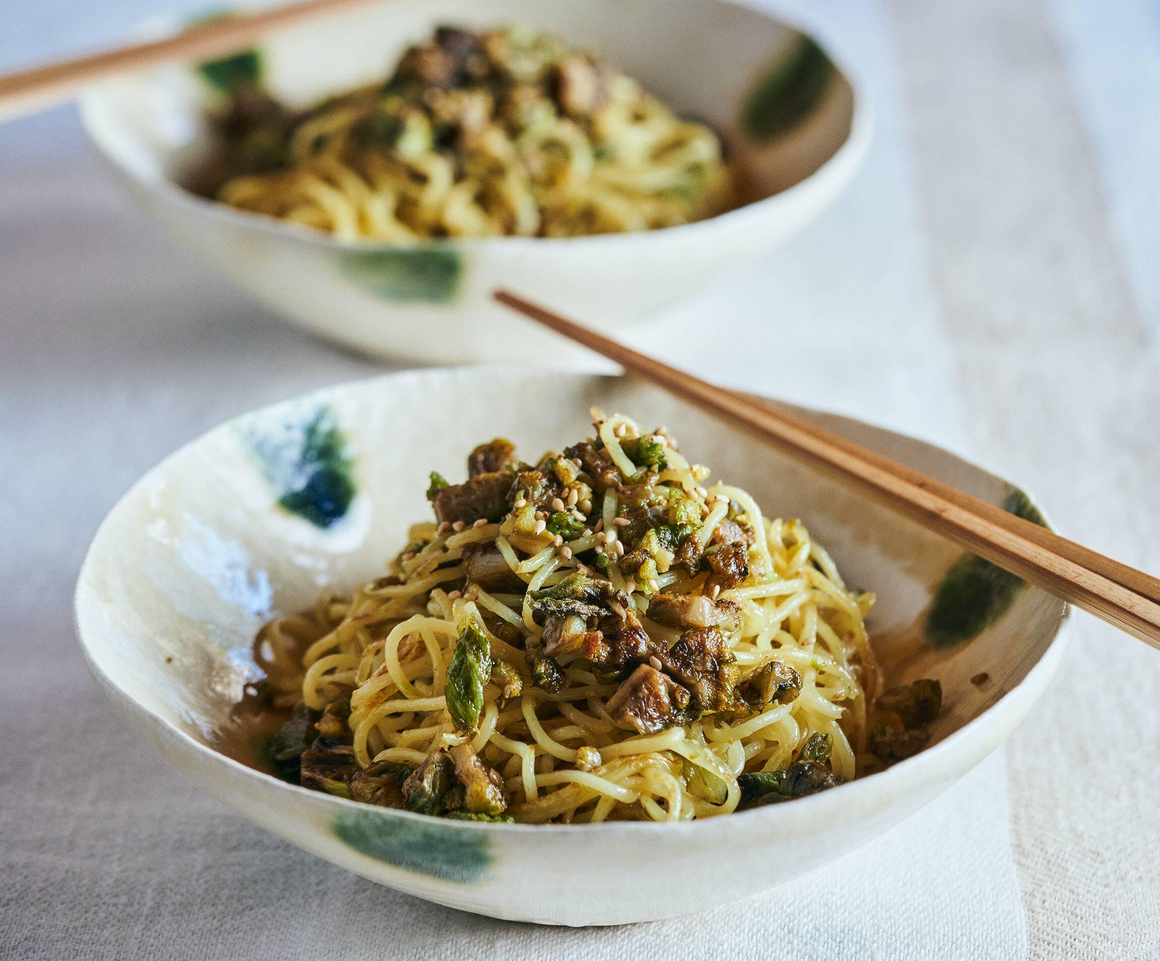 焼きそばの具にしたのは、春先から出回るふきのとう。ほろ苦さと胡麻油の香ばしさが驚くほどよく合います。味つけは塩だけとシンプル。じんわり沁みる味わい深さは、主菜はもちろん、お酒と楽しむのにもぴったりです。