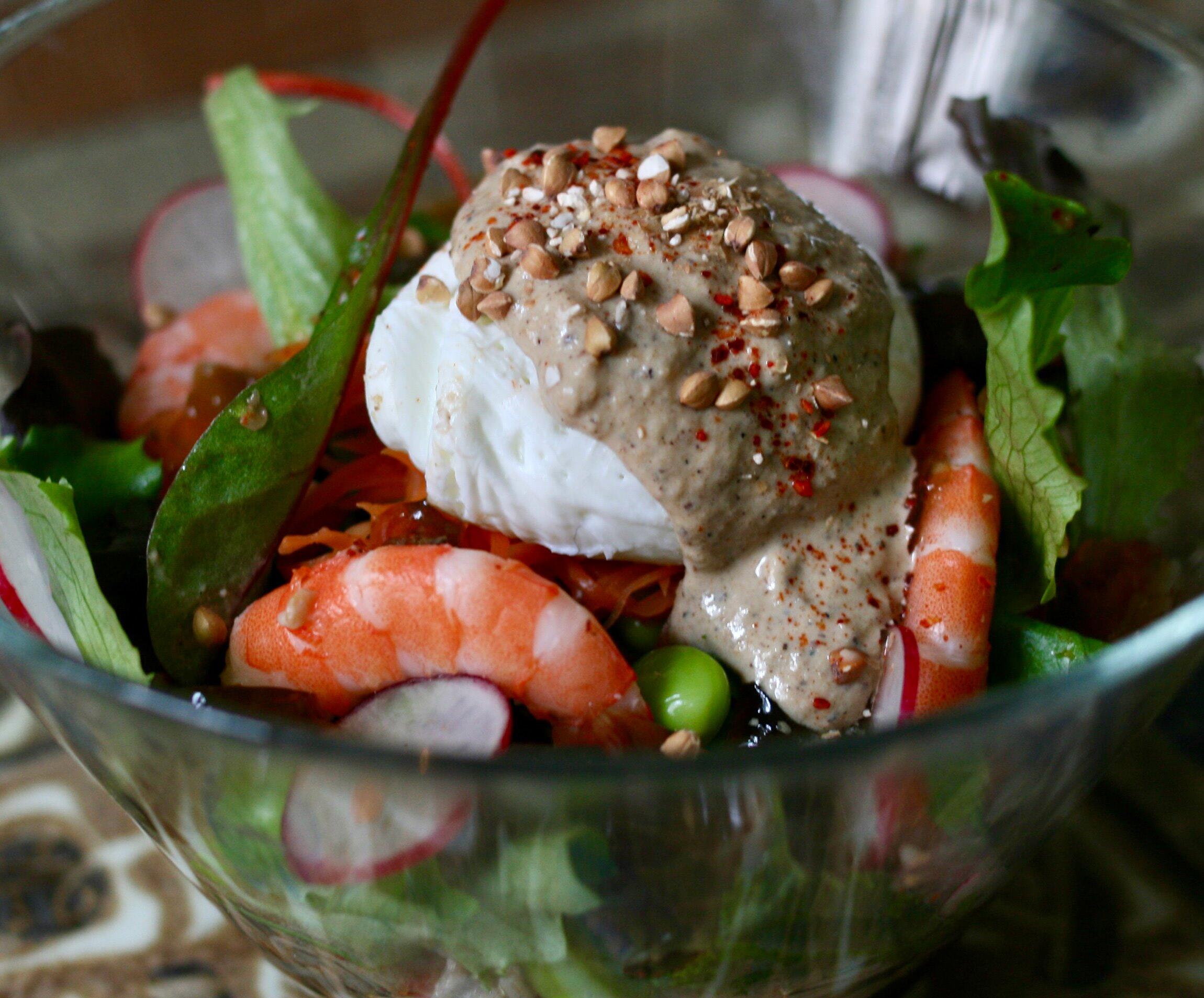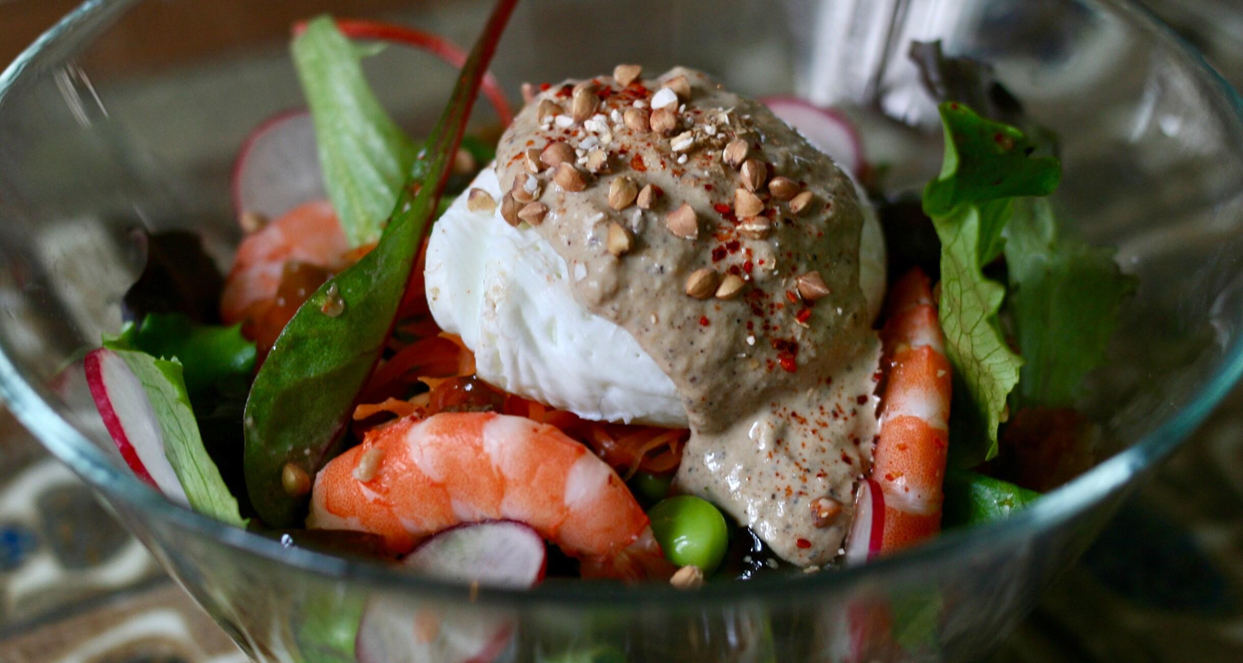 枝豆やスライスしたラディッシュを散らし、ベビーリーフなどで蓋をし、中心にキャロットラぺ、その上にポーチドエッグ、もう一度、胡桃ダレをかけ、最後にポン酢ジュレ、ゆで海老、枝豆、煎った蕎麦の実、などを全体に散らしたら、完成となります。