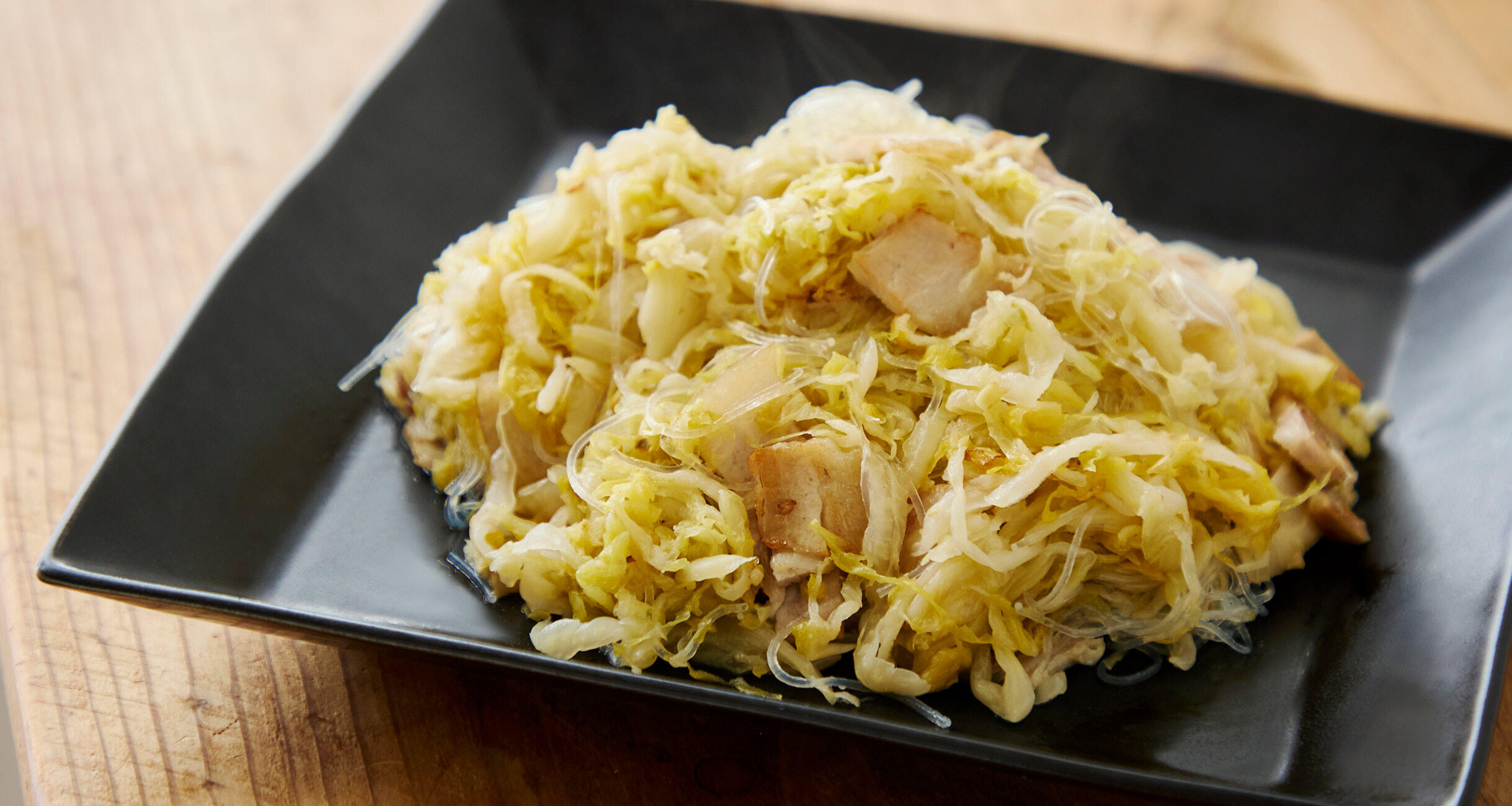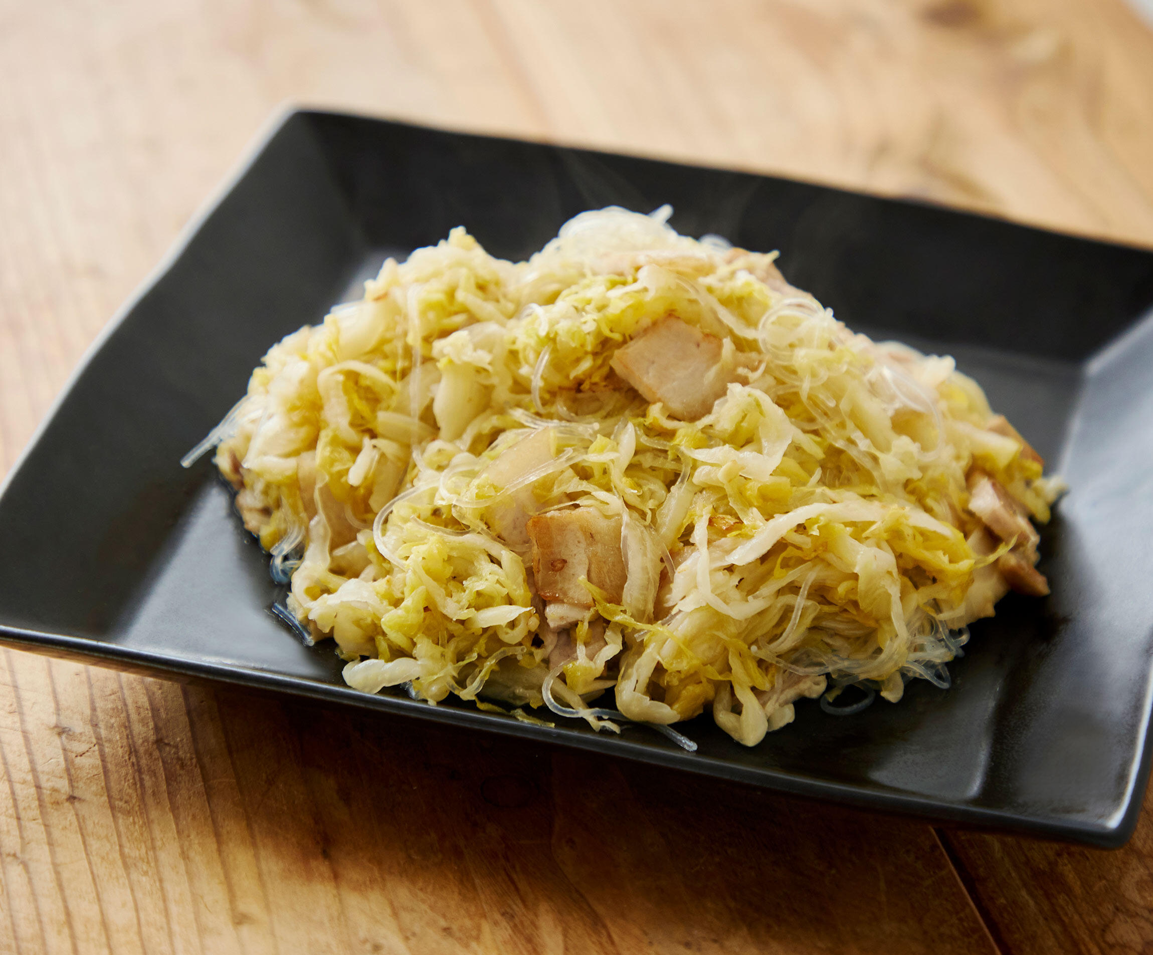 発酵白菜・豚バラ肉・春雨の黄金トリオ、再び!「発酵白菜鍋」と同じ食材の組み合わせなのに、炒めると白菜が豚肉の脂やスープの旨味をしっかり吸って味が凝縮。鍋とはまた違った美味しさを楽しめます。白飯を呼ぶ最高のおかずです!