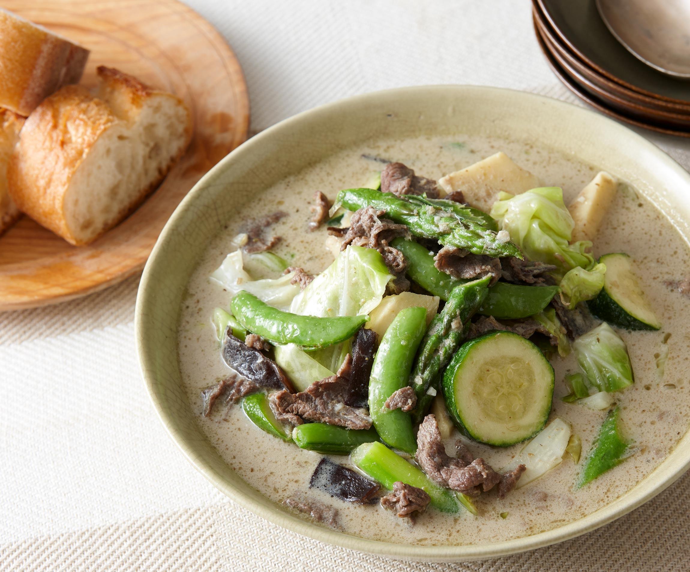 具だくさんなのでそのまま軽やかな煮込みとして、バゲットやご飯を添えてグリーンカレーとしても。ゆでたショートパスタを加えてカレーになじませるのもおすすめです。