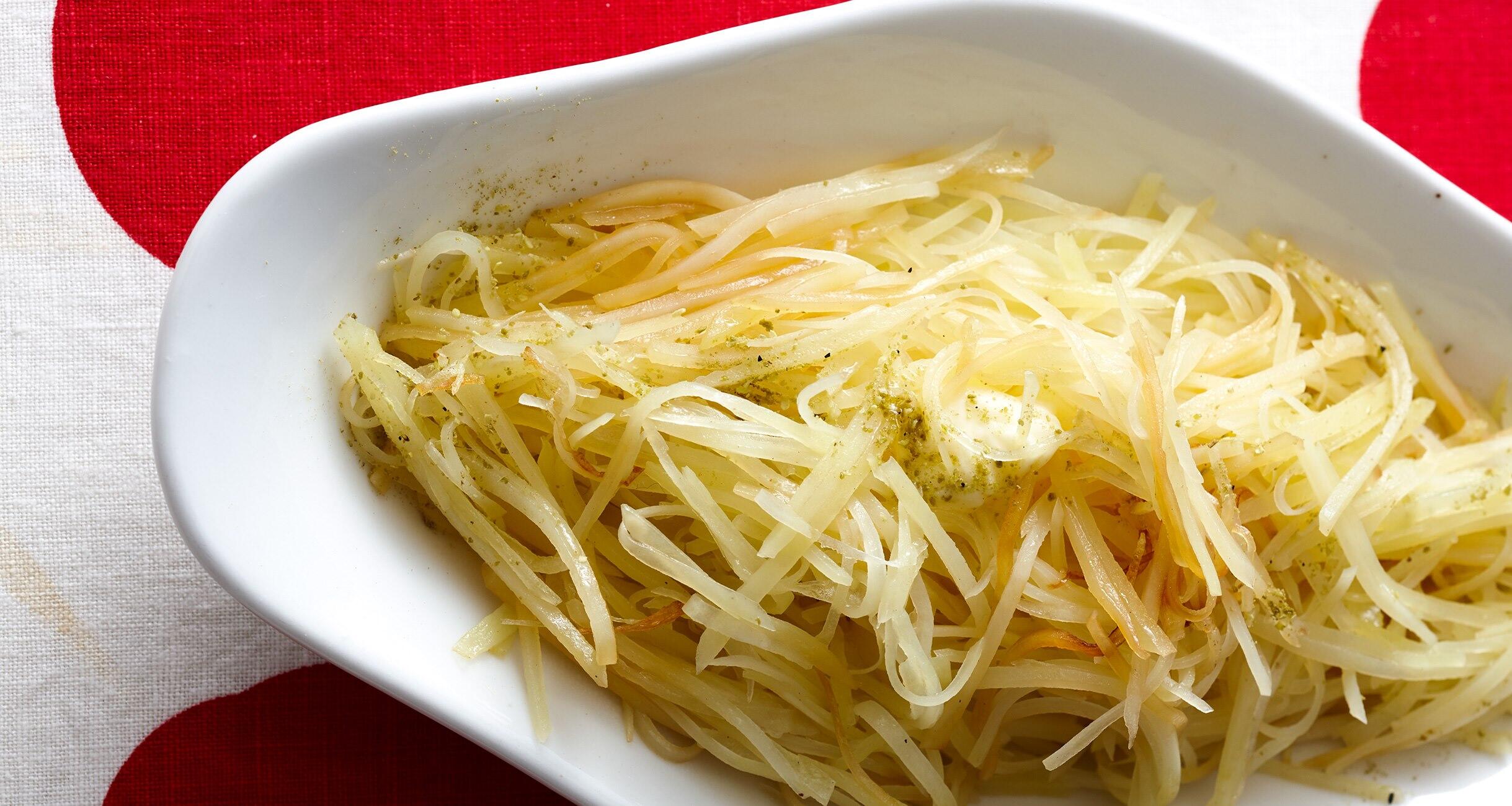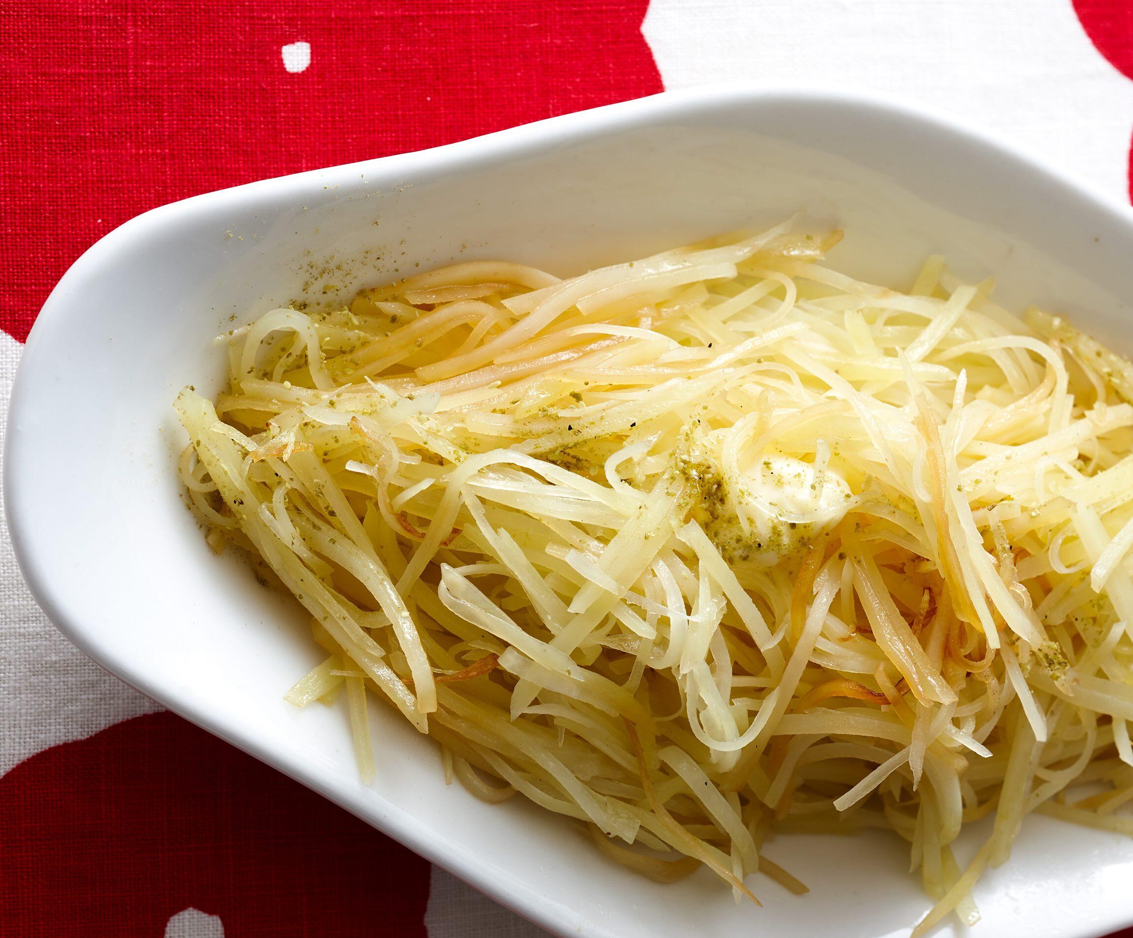 じゃがいもはなるべく長さがある細いせん切りにし、途中水を替えながら10分以上さらしてからザルにあげ、キッチンペーパーなどで水気をしっかりと拭く。