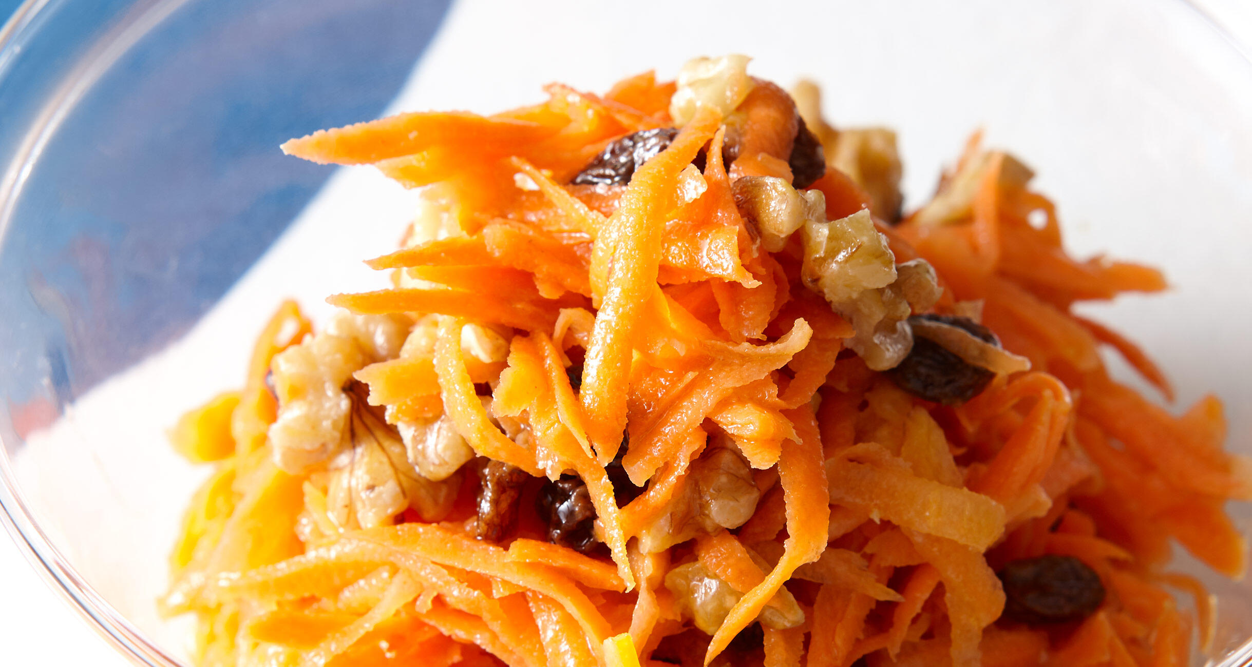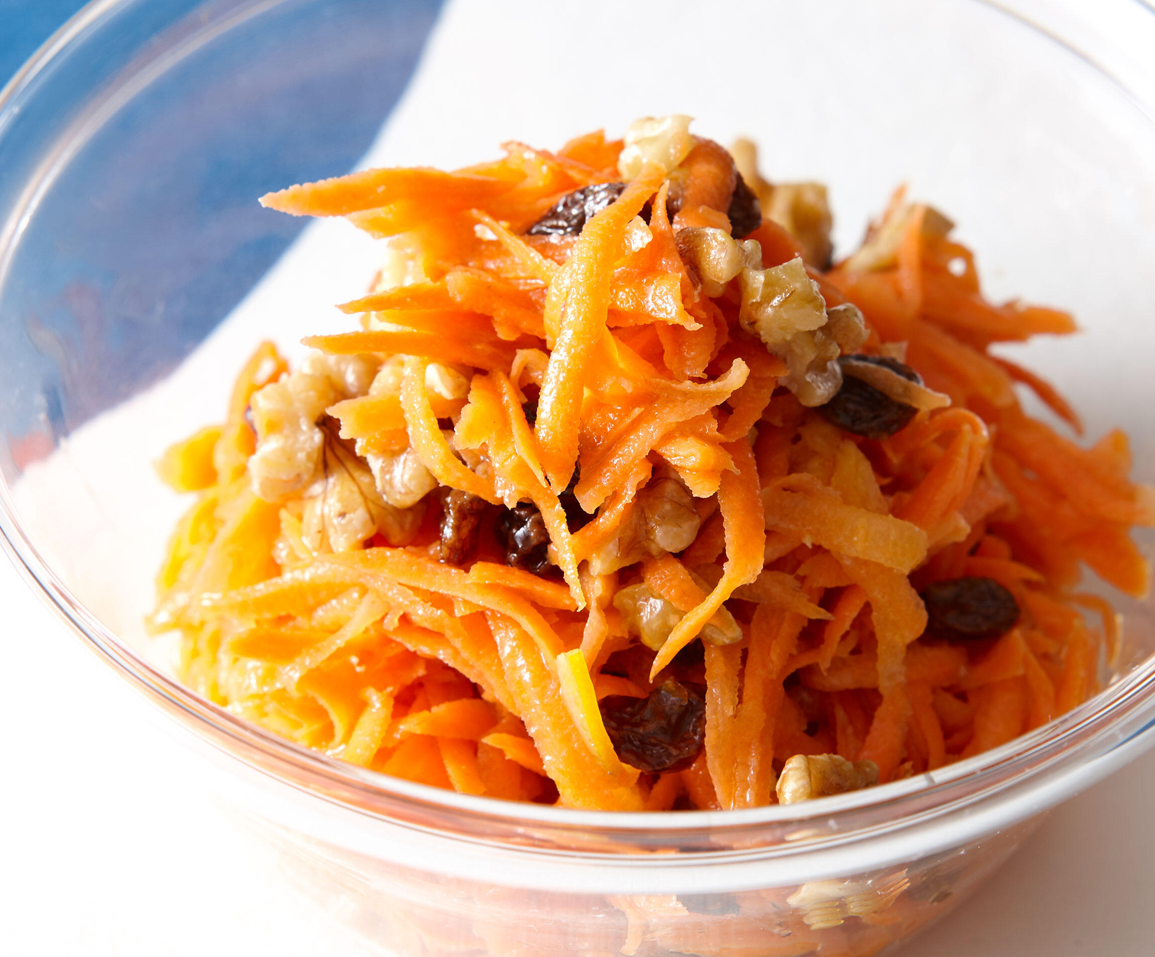 にんじんの水気を絞ってボウルに入れてほぐし、くるみとレーズンを加え、ドレッシングで和えて味をなじませる。