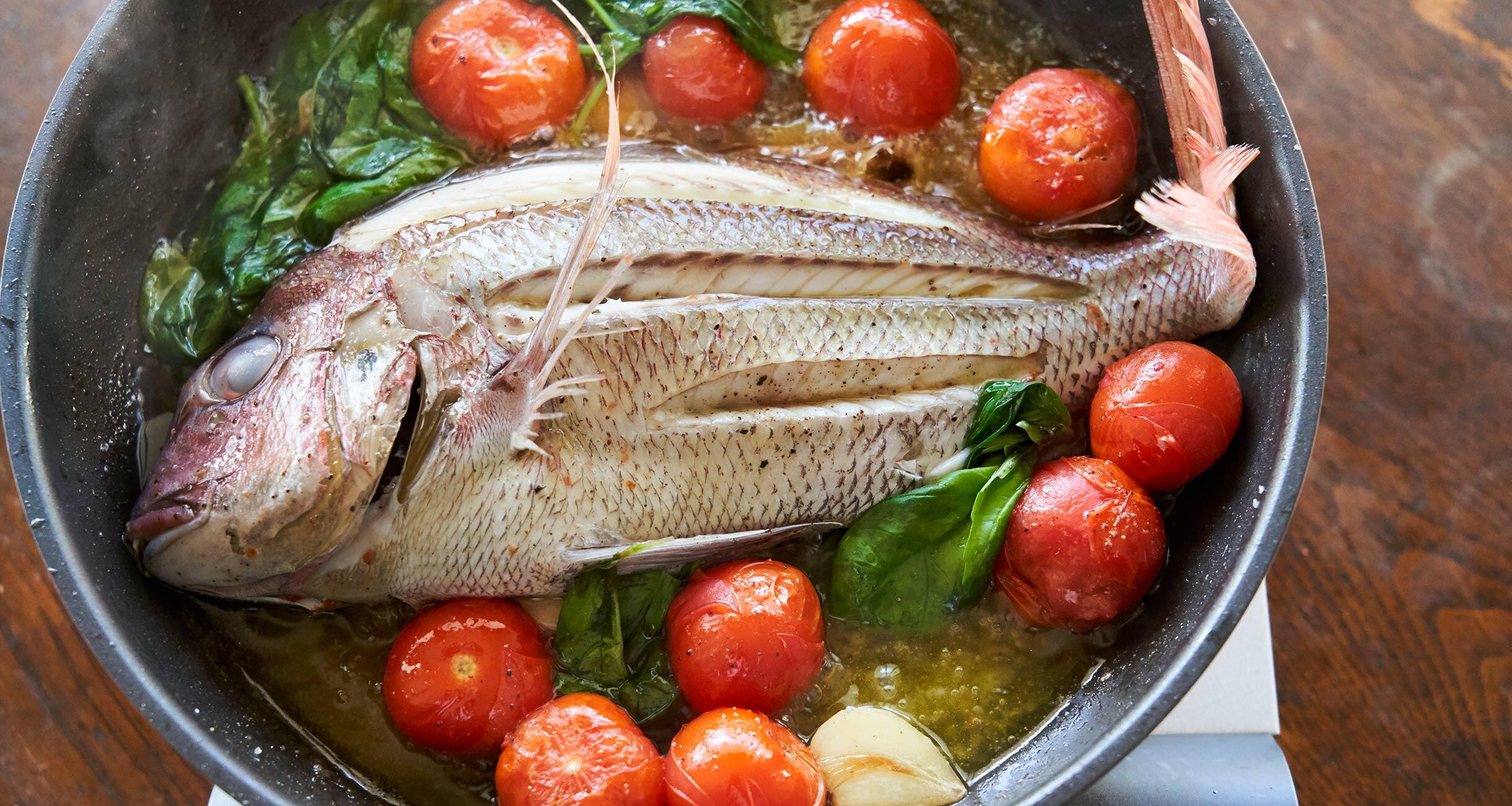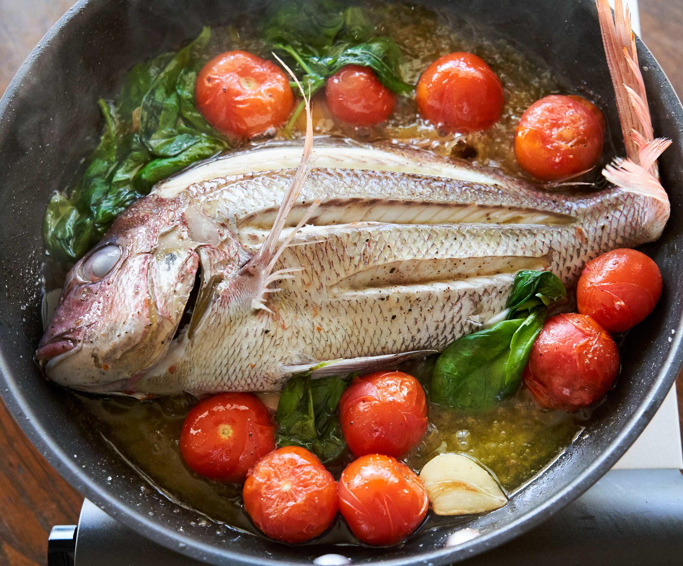 真鯛の旬は2~4月。春になるとお手頃な価格の一尾魚が出回ることも。そんなチャンスが訪れたらぜひアクアパッツァに。ミニトマトゴロゴロ、バジルの香りをきかせて元気よく。人が集まるときには絶対これ!中までしっかり火が通るように、蓋をして仕上げてください。