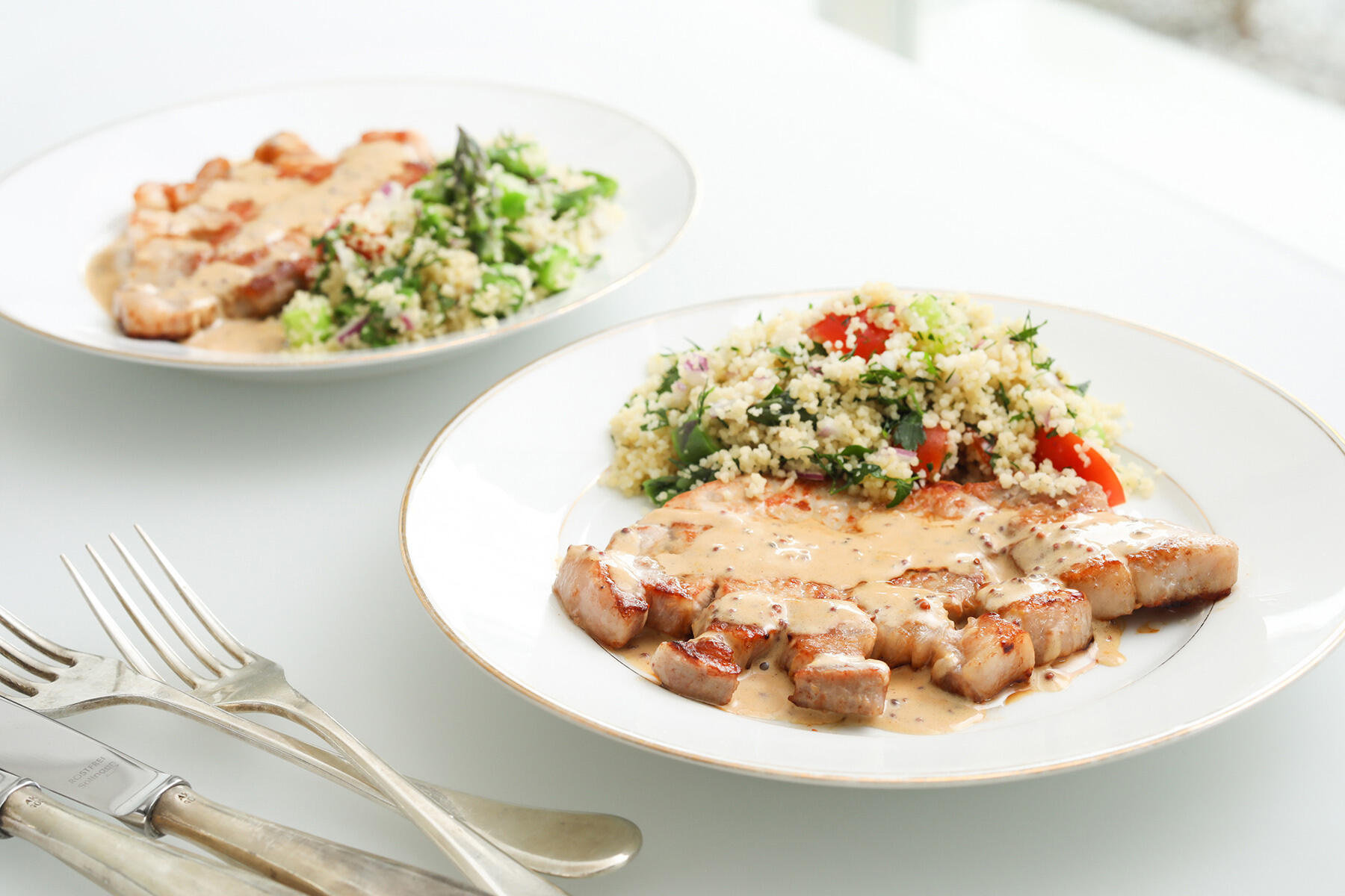 「ソースまで余さず食べてほしい時、私は汁気をきれいに吸ってさらに美味しくなるクスクスをタブレにして、よく添えます。今回はクスクスにアスパラや紫玉ねぎなどの野菜と爽やかに香るローズマリーの新芽の部分を刻んで入れたので、タブレだけ食べても美味しいですよ」