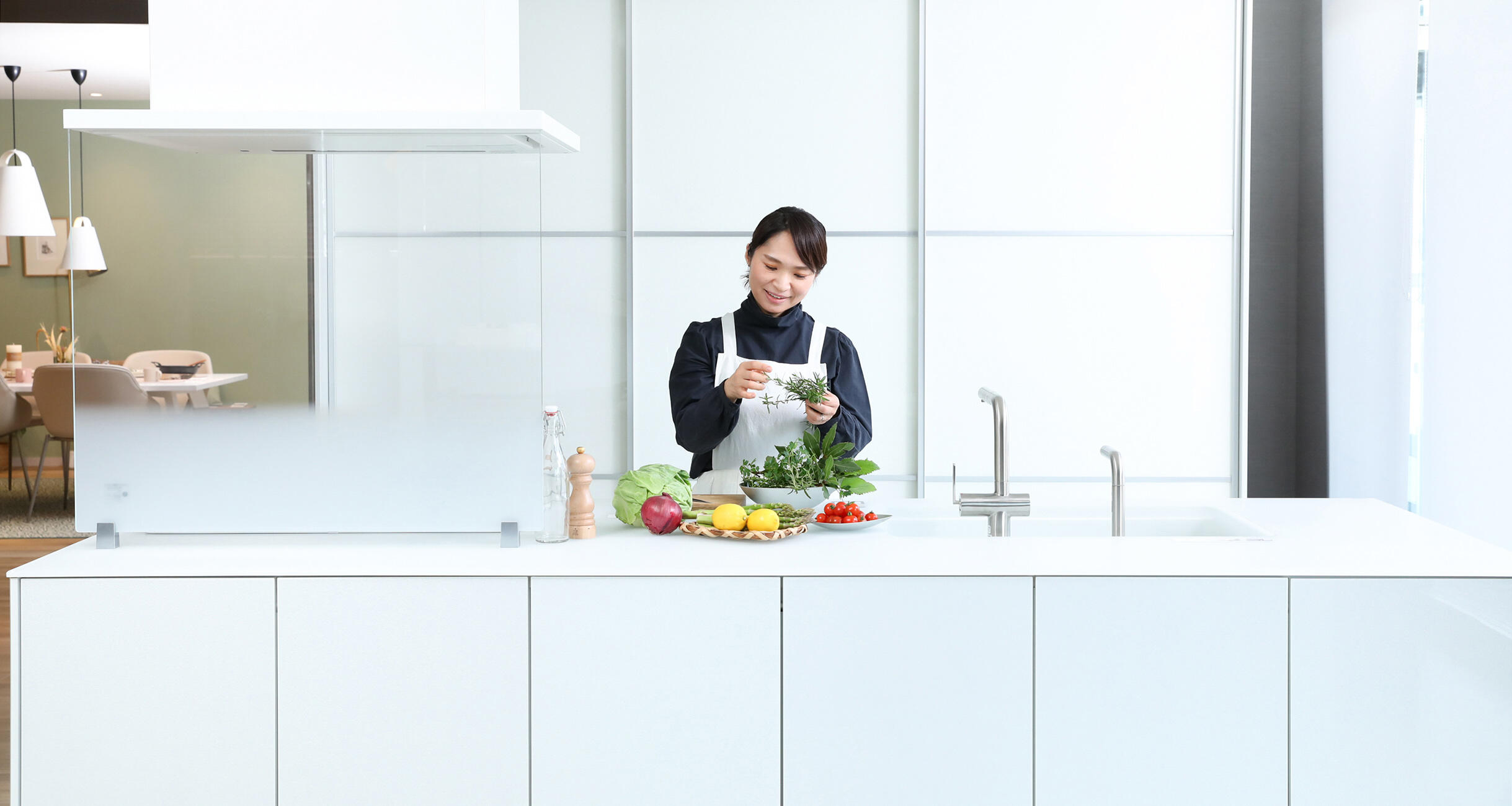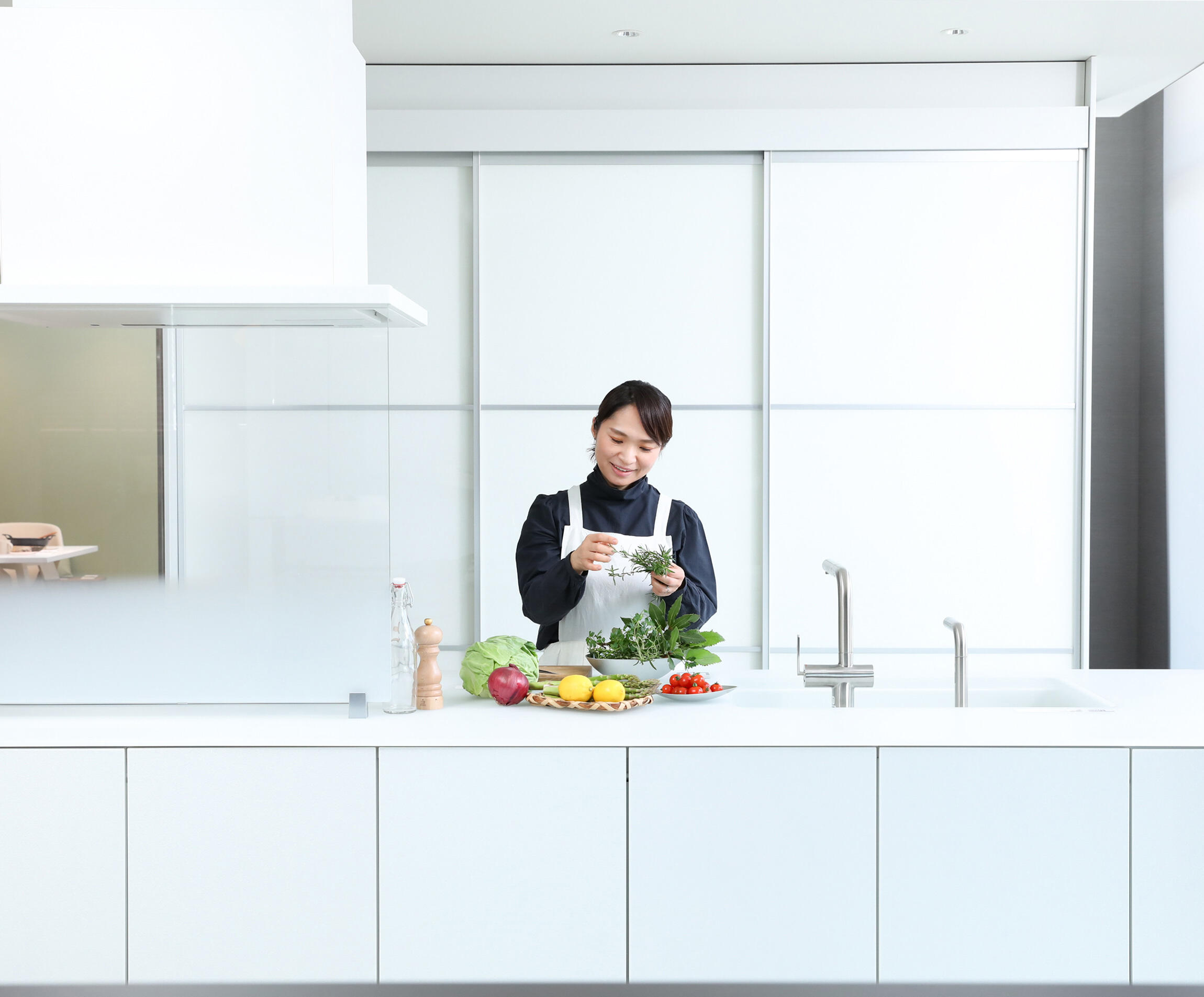 「クリスタルカウンターに自然光や部屋のライトが反射してやさしい光に包まれるからか、出来上がった料理が綺麗に見えますね。料理をつくる工程も、片付けも、考え抜かれたキッチンがあれば、とても楽しくなる。使い心地の良さを実感することができました」