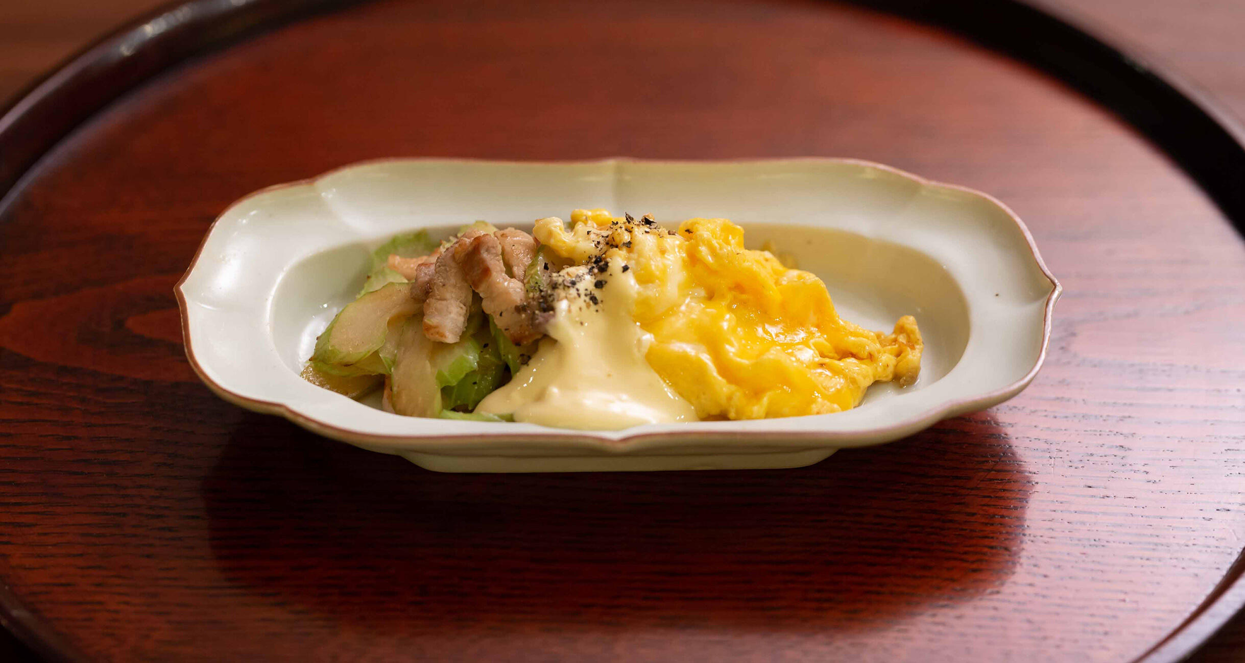 呑むタイミングに合わせてつくるとすこぶる美味。先にお酒の準備をお忘れなく。普通の塩炒めが、卵がのるだけで華やかになり、黒胡椒をふると大人な味に。シャンパーニュや白ワインと絶妙の相性になります。