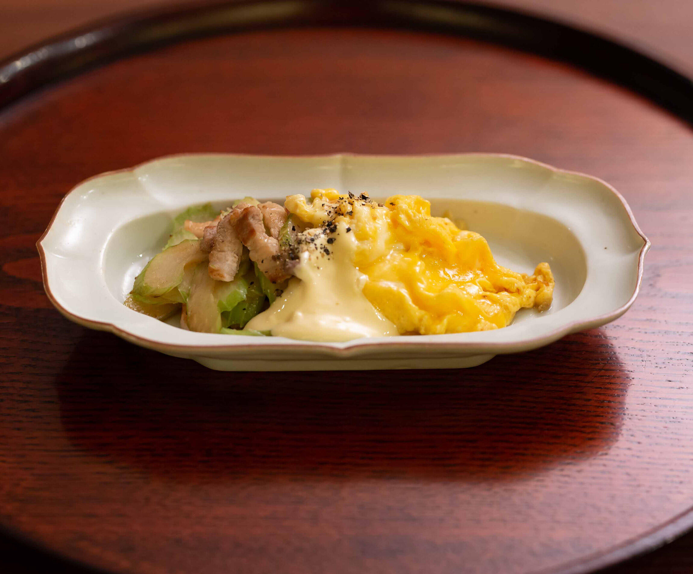 シンプルな塩炒めにふわふわ卵とからしマヨネーズを添えるだけで深い味わいの一品に。この連載はお酒を愛する料理研究家の大原千鶴さんがご自分でも「このあてでこんなお酒を呑みたい」と思う、季節のおつまみをご紹介します。