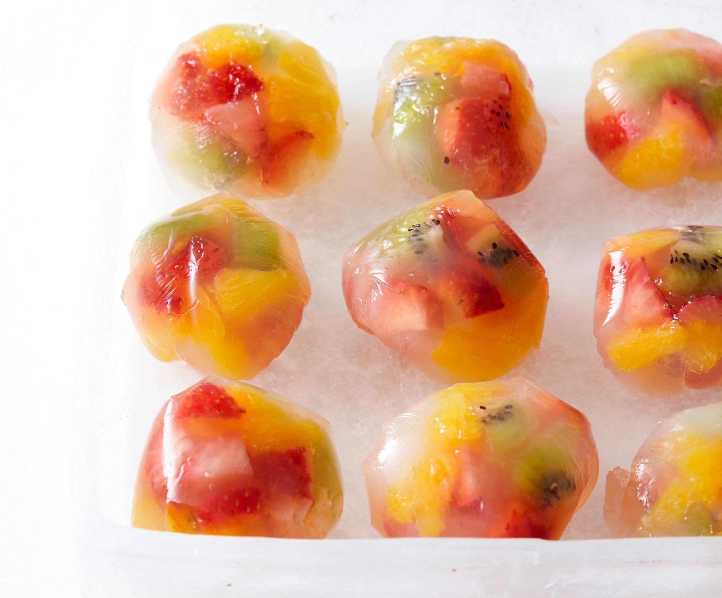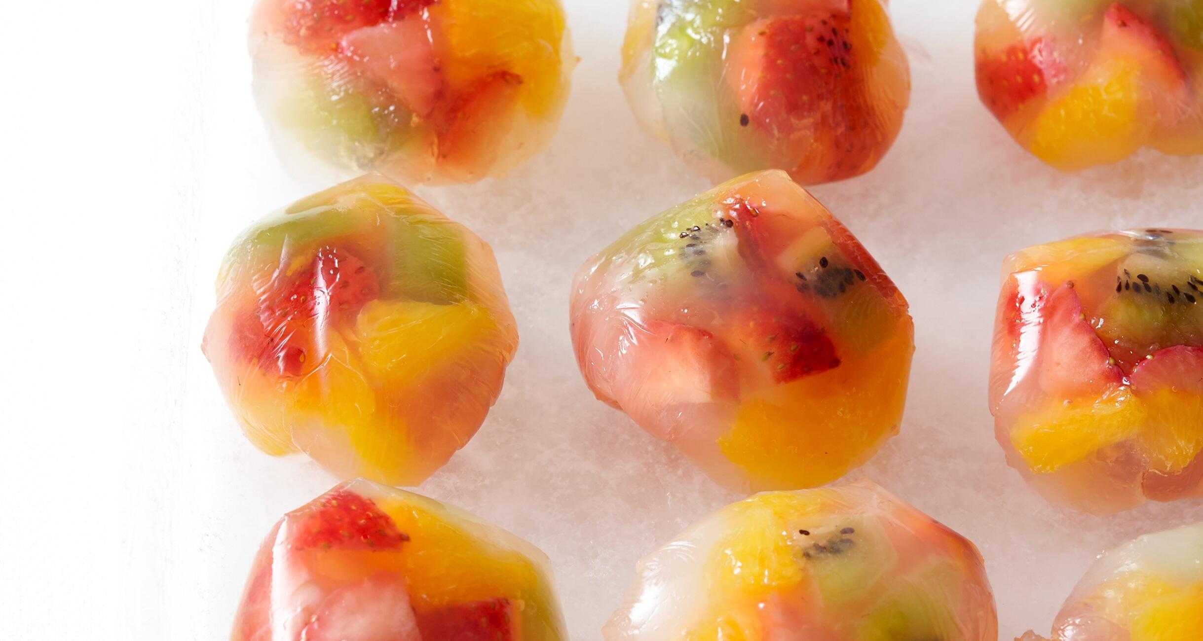 どこか懐かしい巾着形はラップと輪ゴムで楽しくつくれます。キウイやパイナップル、メロンなど、ゼラチンが固まらないフルーツもどんとこい!