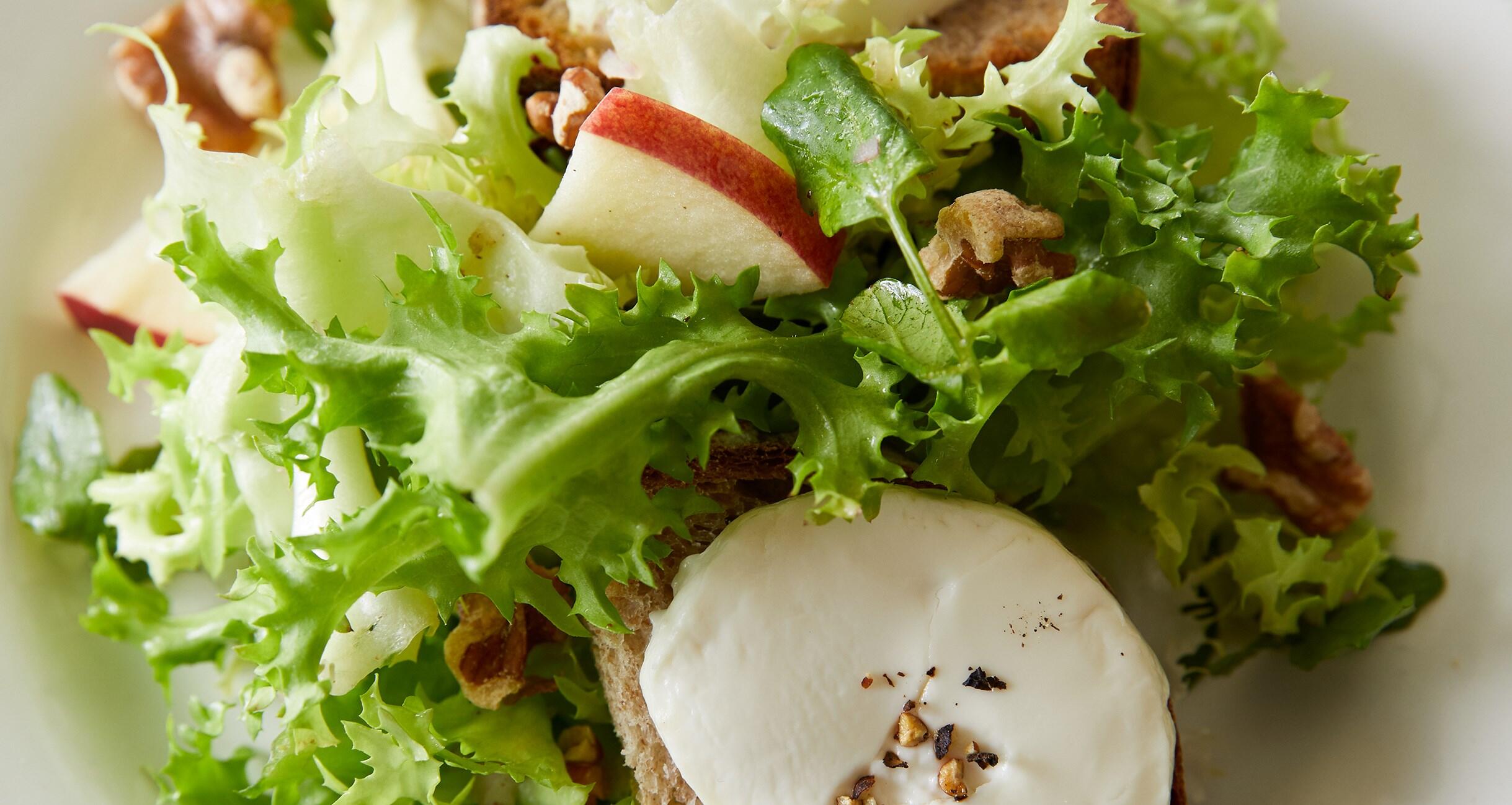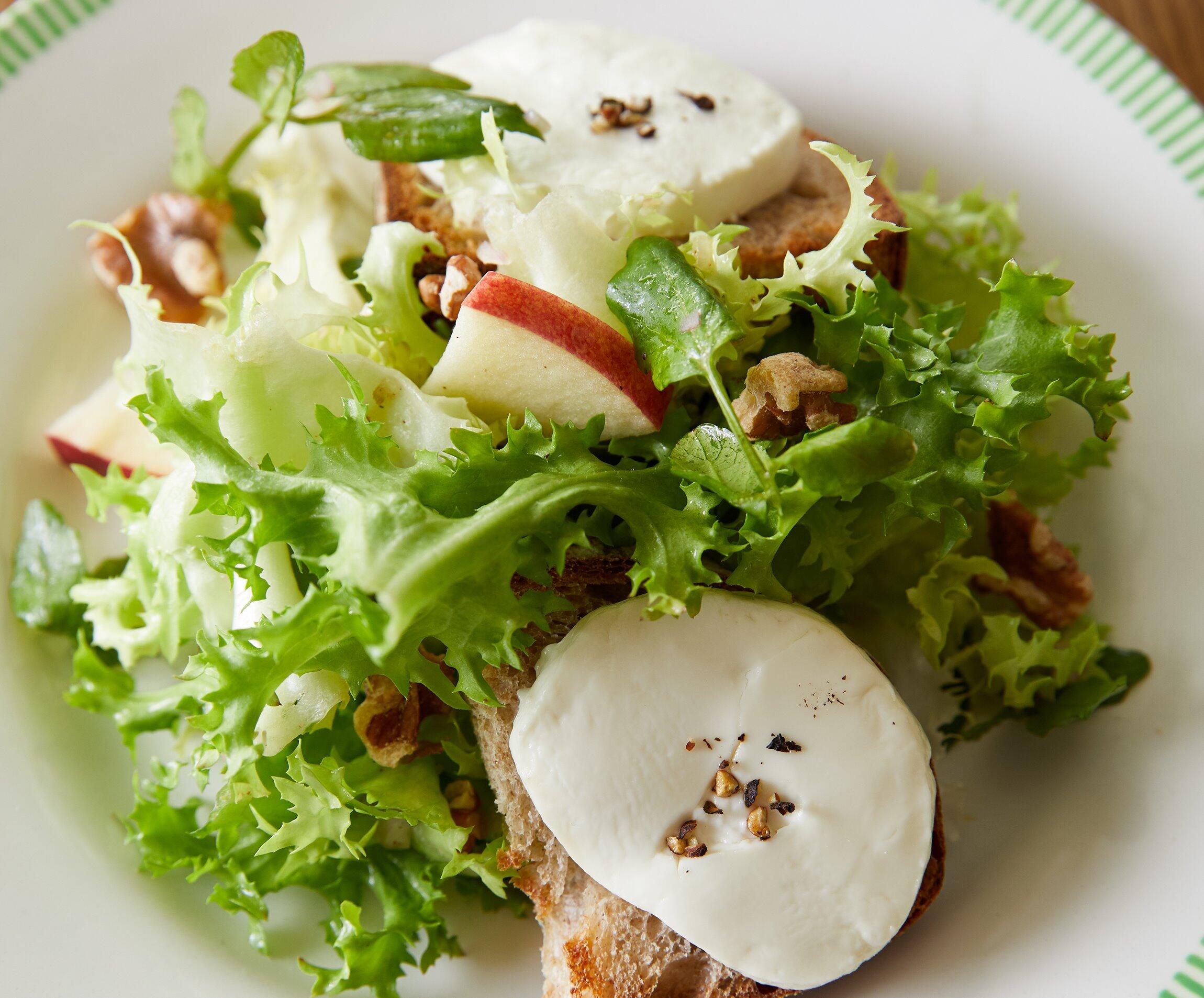 山羊乳が原料のシェーブルチーズは、フランス人の大好物。こうして薄くスライスしたパンにのせてトーストし、サラダにするのも定番です。少しくせのある風味が、葉野菜やベーコン、ドレッシングの酸味と好相性。