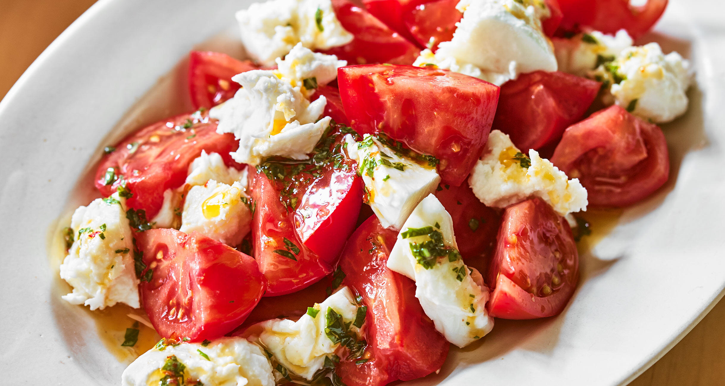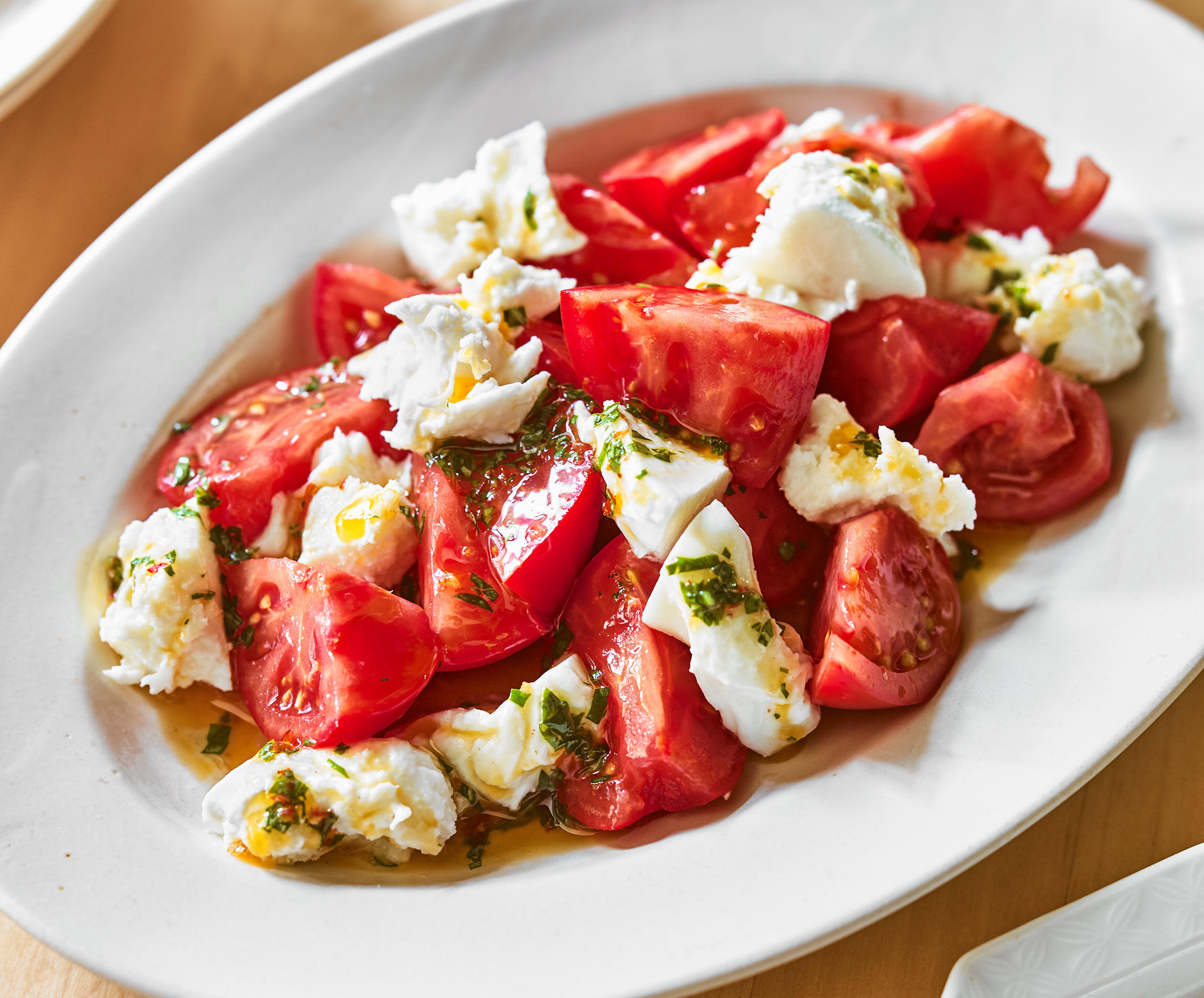 コクと風味のある豆板醤ベースのドレッシングでをカプレーゼをつくると、濃厚でビール合う味わいになりますよ。料理研究家の今井亮さんに、中華料理のエッセンスと技を加えた、迫力のある春の大皿料理を習いました。