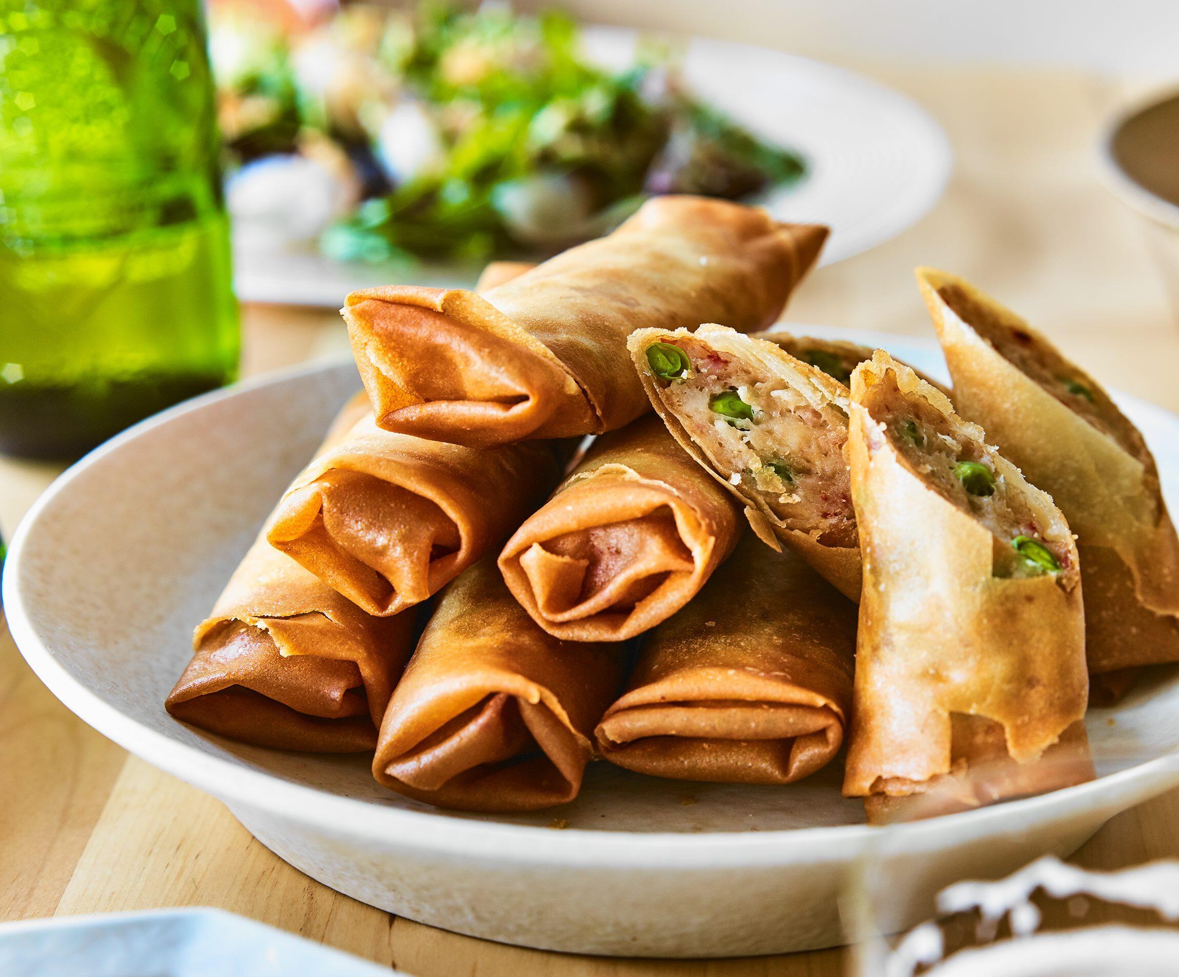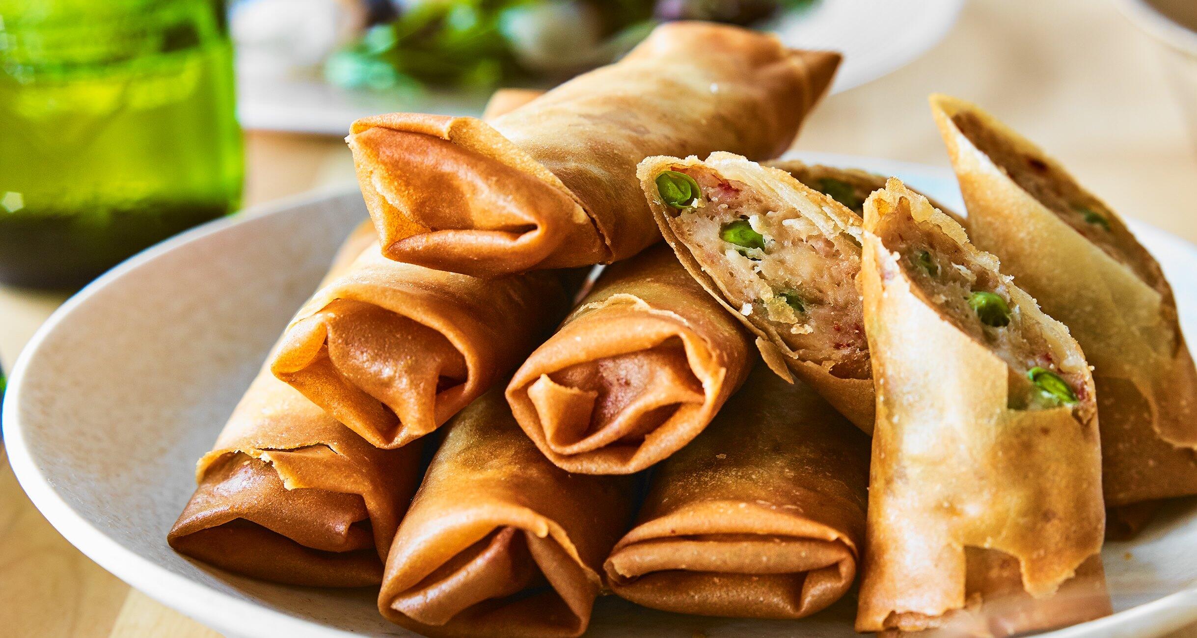 揚げ油を160℃に熱し、春巻きを入れてうっすら色づくまで4~5分揚げる。一度引きあげて1分休ませたら油を170℃に上げて、表面がパリパリになるまで揚げる。