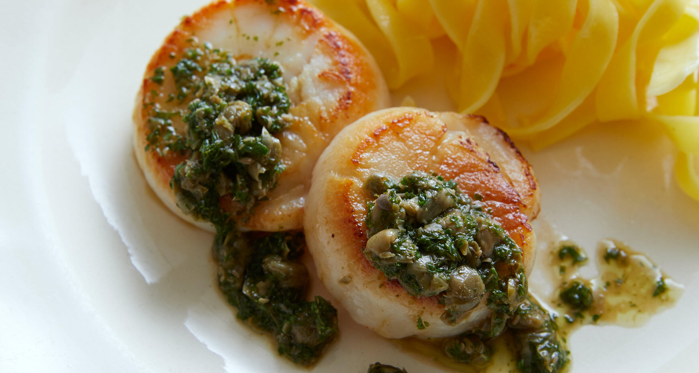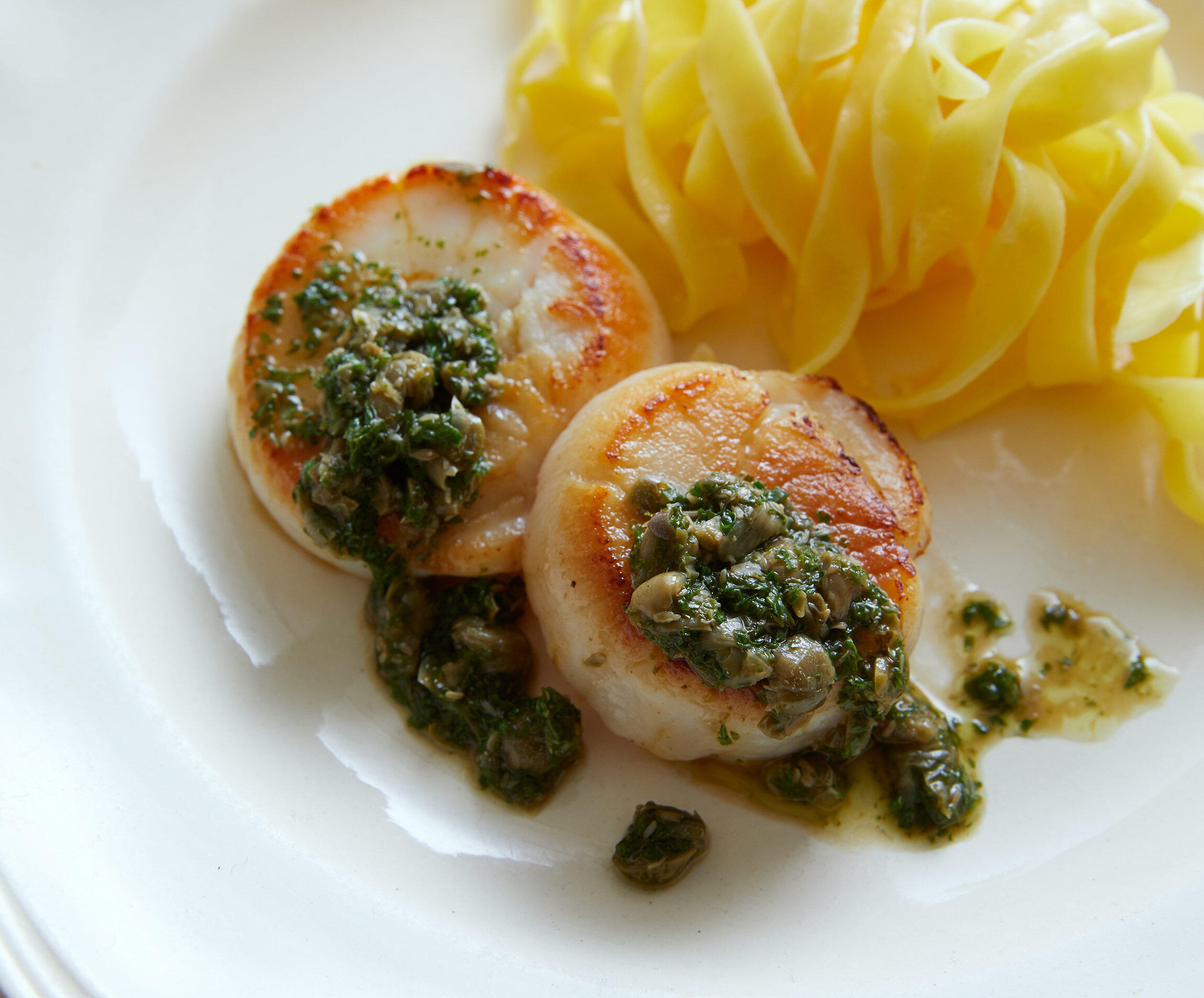 刺身用帆立を使い、中まで火を通しすぎず、表面だけをカリッと香ばしく焼きます。ケイパーとパセリの爽やかな香りにバターのコクが相まったソースは魚介類にぴったり。ぜひ白ワインを用意して。