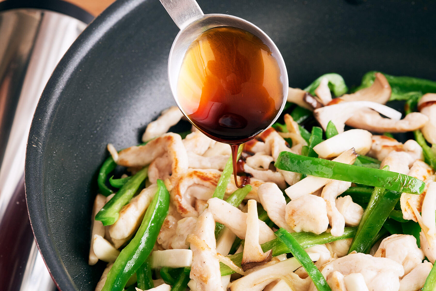 ピーマン、エリンギを加えて約2分30秒炒め、オイスターソースを加えてさっと炒める。