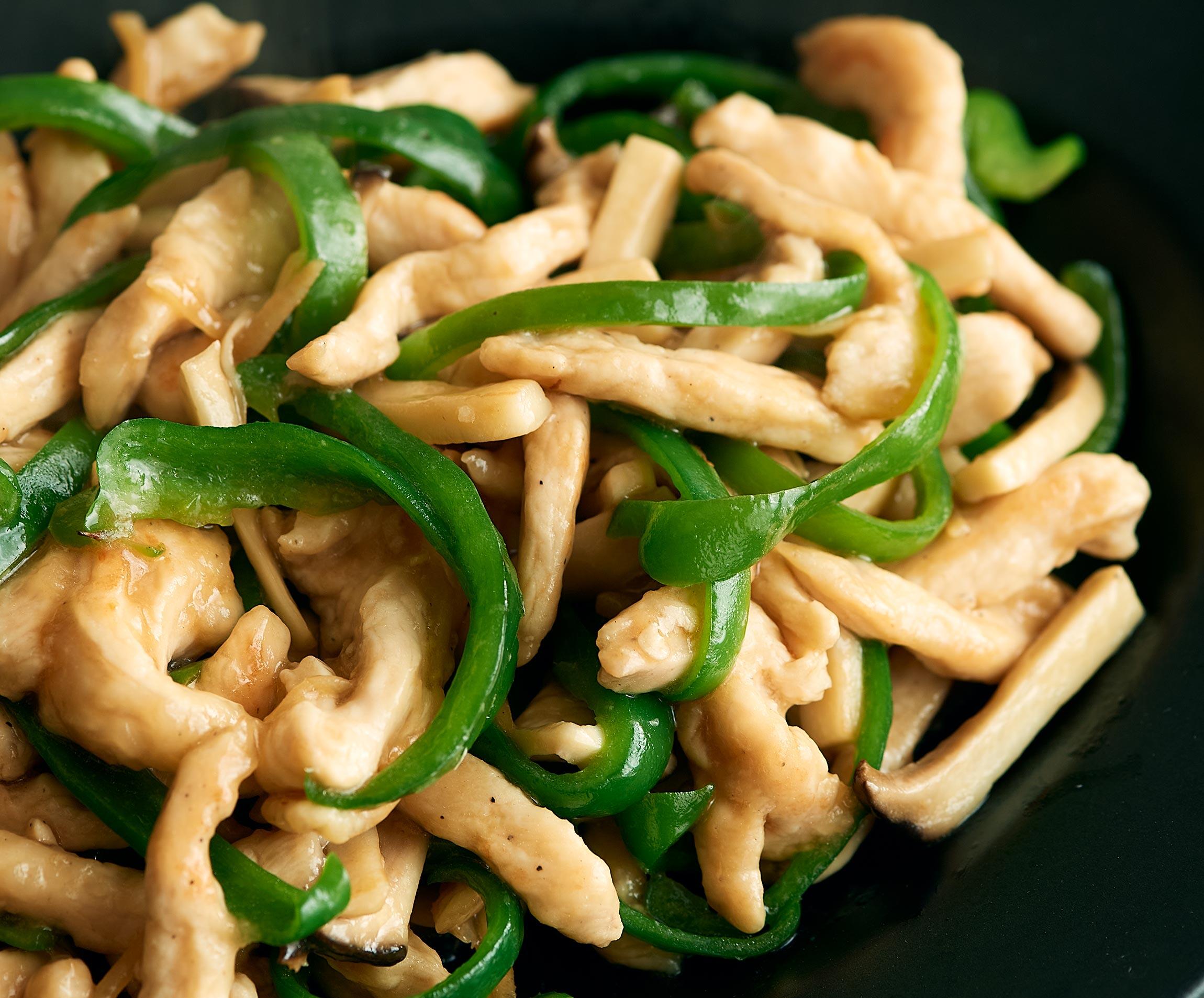 噛めば噛むほど旨味が口の中に広がる鶏むね肉。しゃきしゃきしたピーマンやエリンギの歯ごたえも楽しい。さっぱりしていて飽きのこない味だ。ご飯はもちろん、酒のつまみにも。