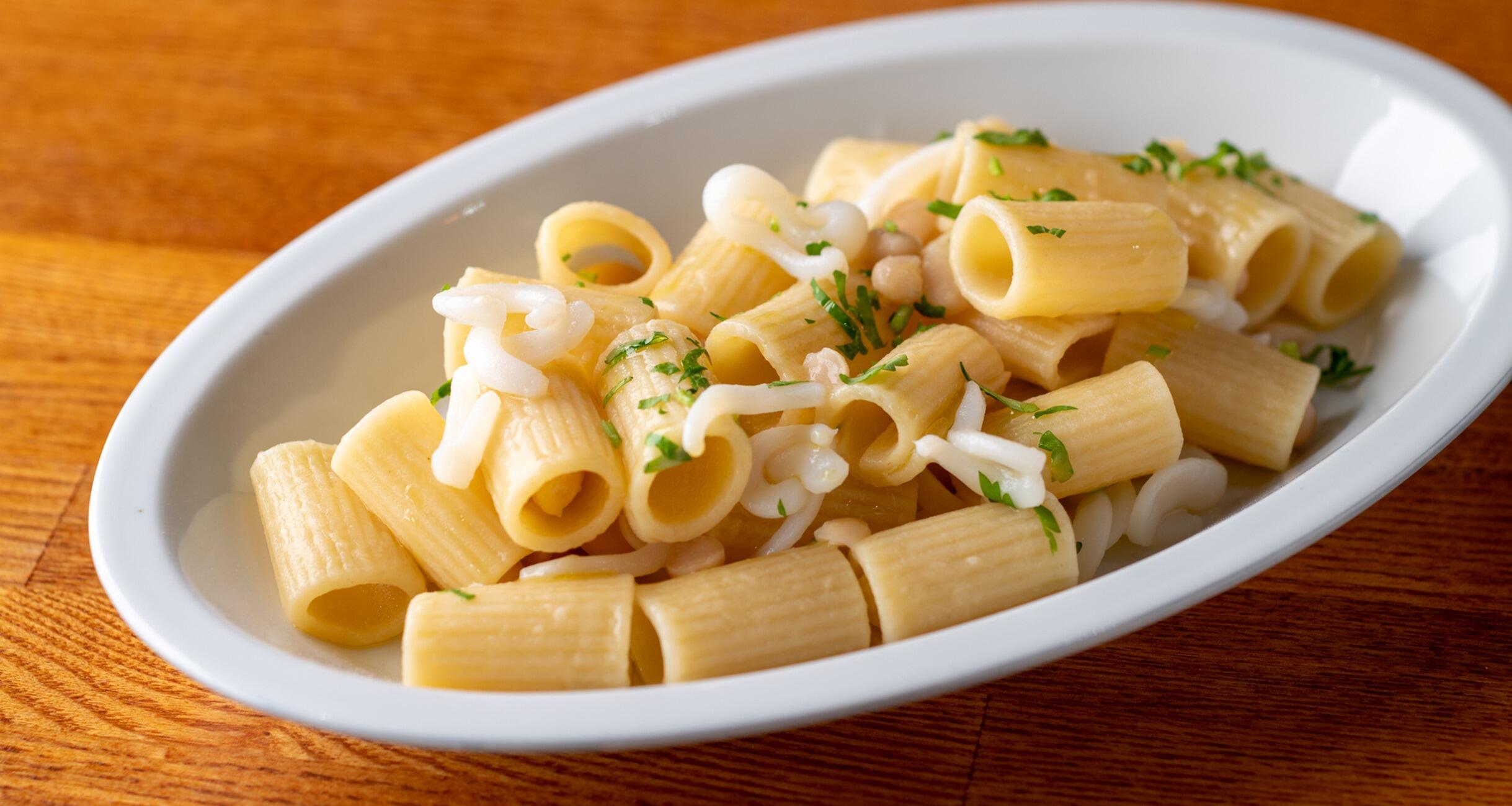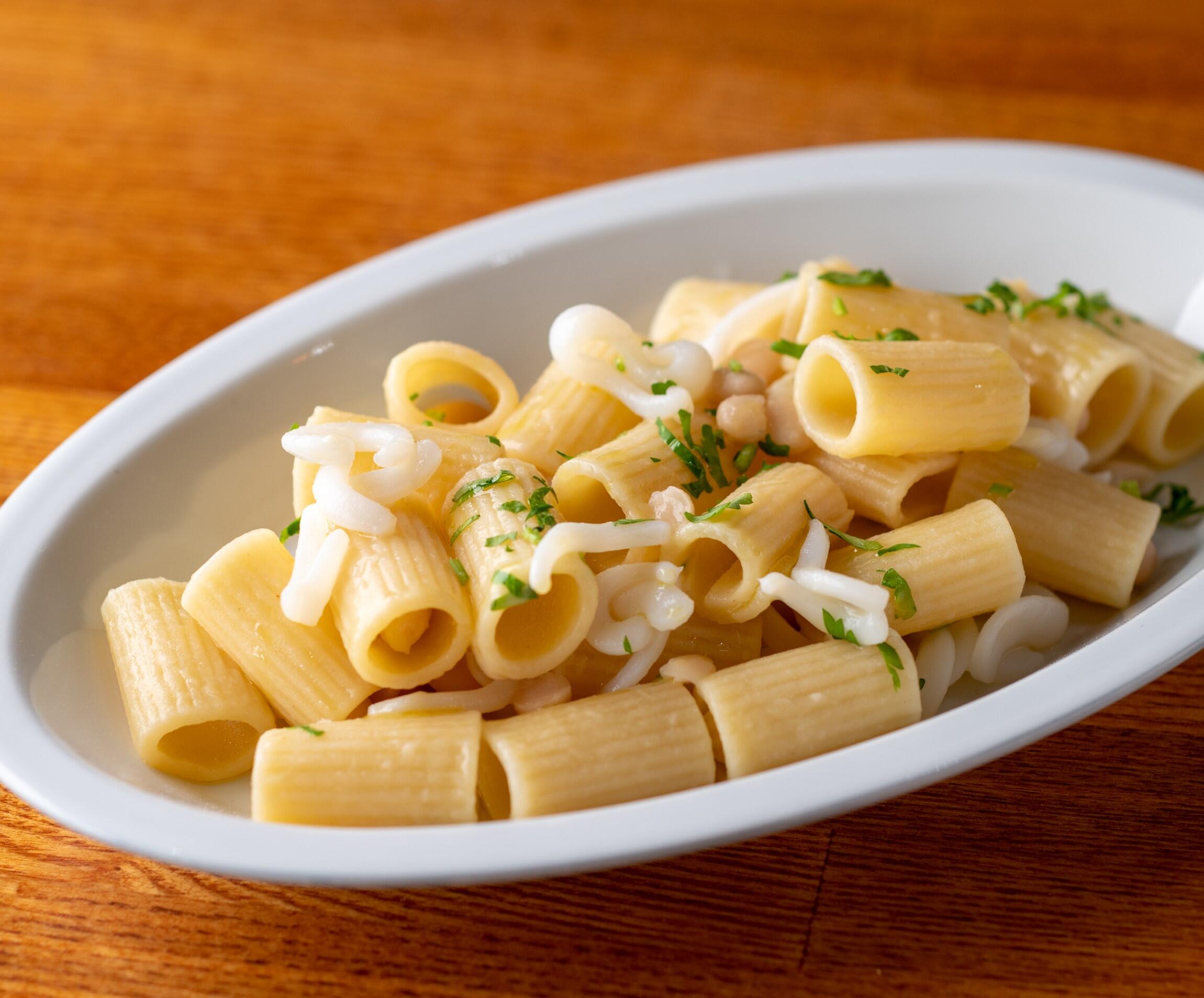 さっと火入れしたヤリイカの食感と、柔らかい白インゲン豆。白インゲン豆はすこし潰したりするとパスタとの絡みも良くなりますよ。