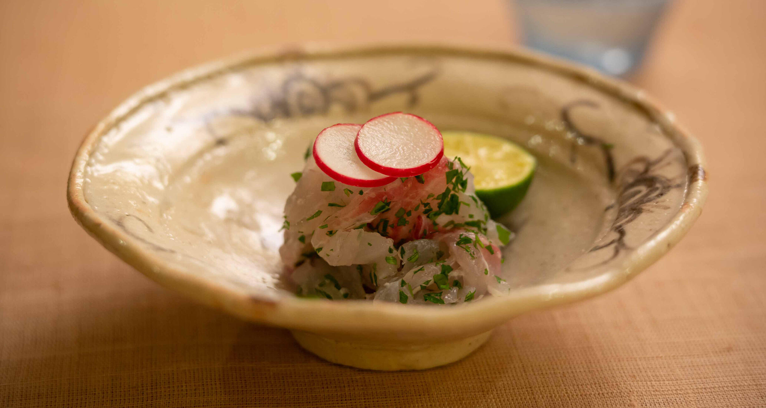 鯛の刺身と刻んだ木の芽を混ぜるだけですが、香りで鯛の甘みが引き立ちます。木の芽はそのまま使うときは、両手でポンと叩いて香りを立たせますが、包丁でトントン粗く叩くとさらに香りが立ち上ります。