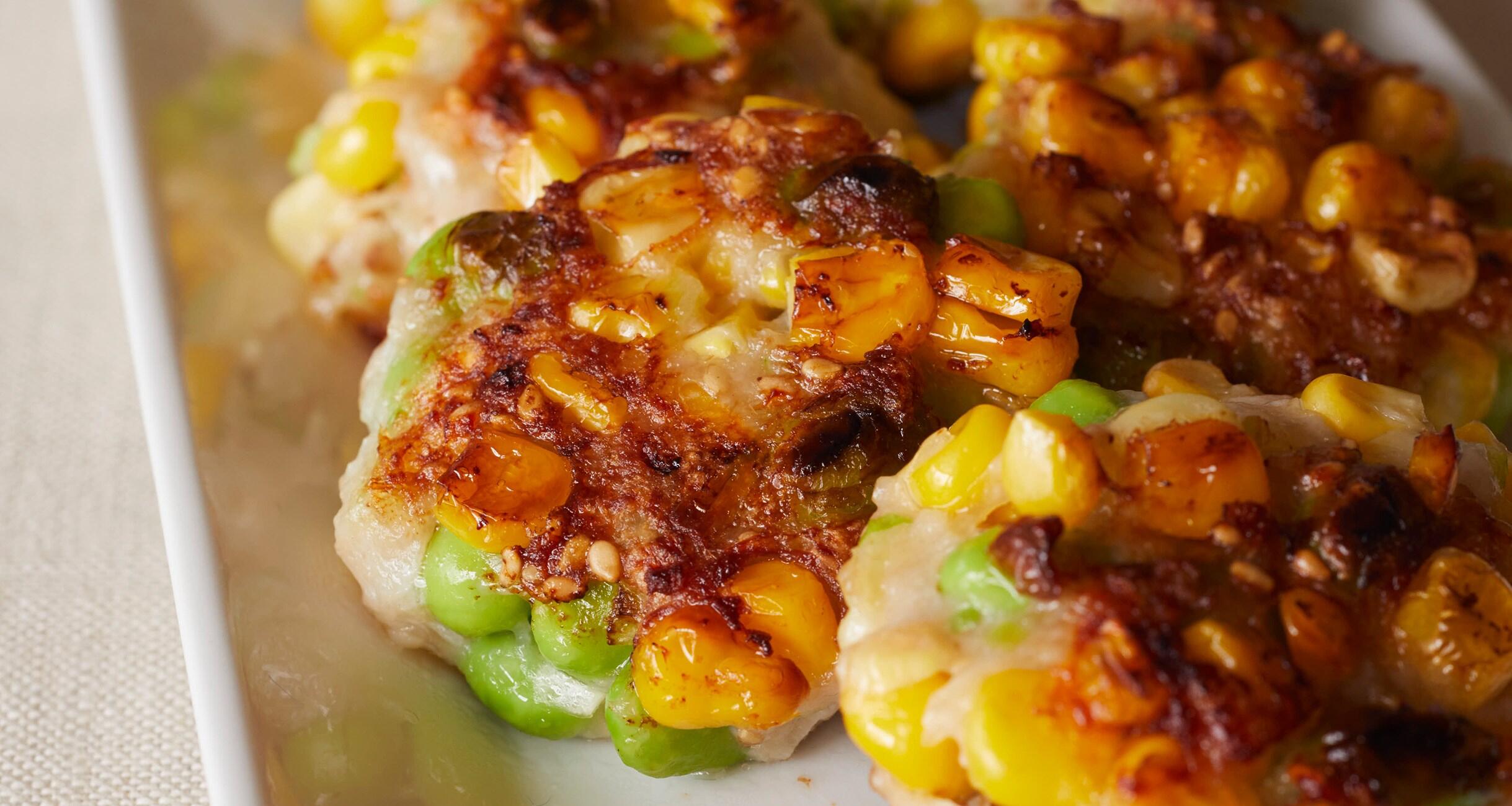 とうもろこしと枝豆のやさしい甘さが美味しい。もちっとして具との一体感が絶妙なおやき風の新感覚メニューです。いつでも食べたい定番の主菜と副菜のレシピを軽やかに仕上げるコツを、料理研究家の大庭英子さんに教わりました。