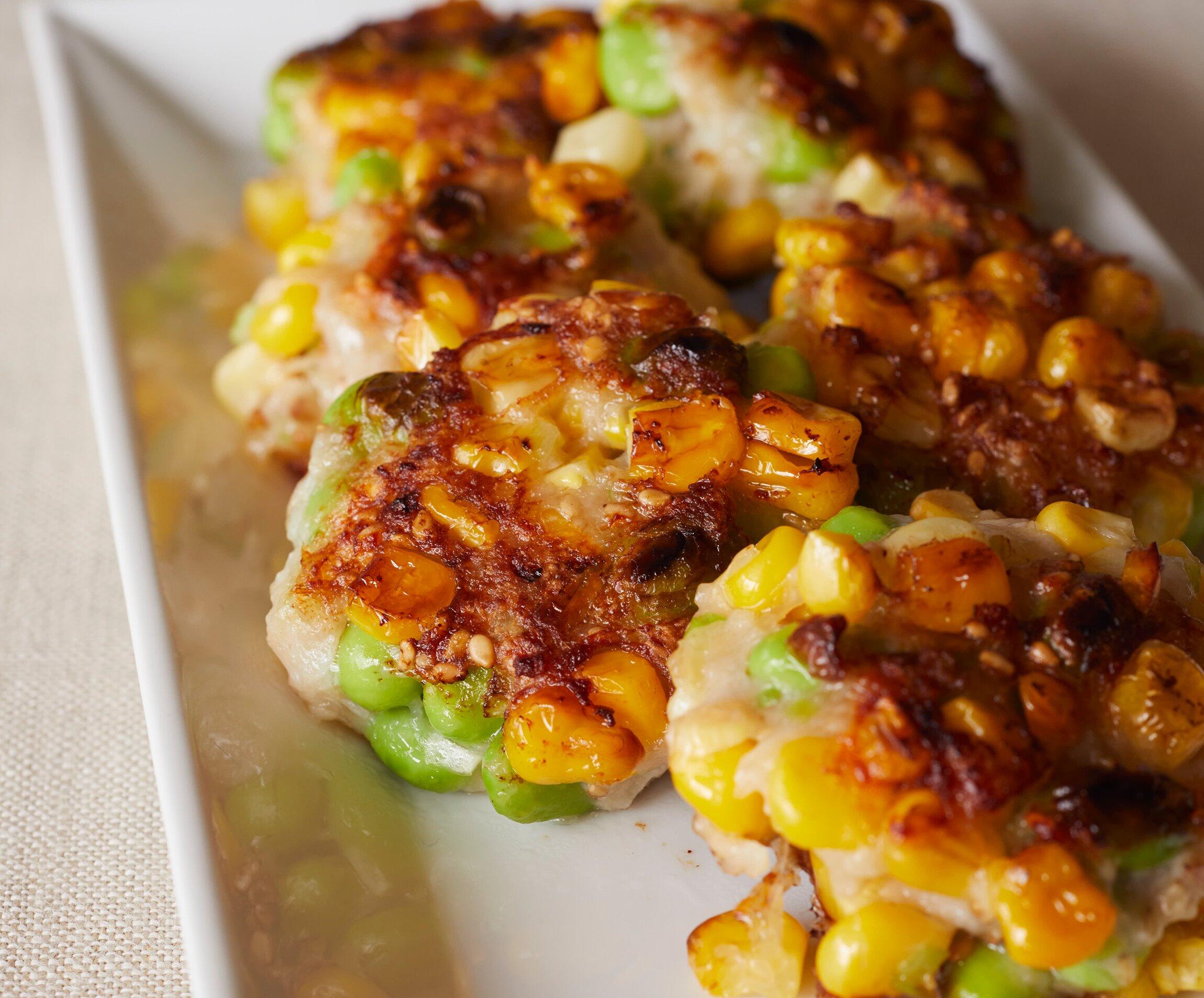 とうもろこしと枝豆をミックスした新感覚のおやき風。鶏挽き肉入りだからお腹も満足。コーンだけ、枝豆だけでももちろんOKです。