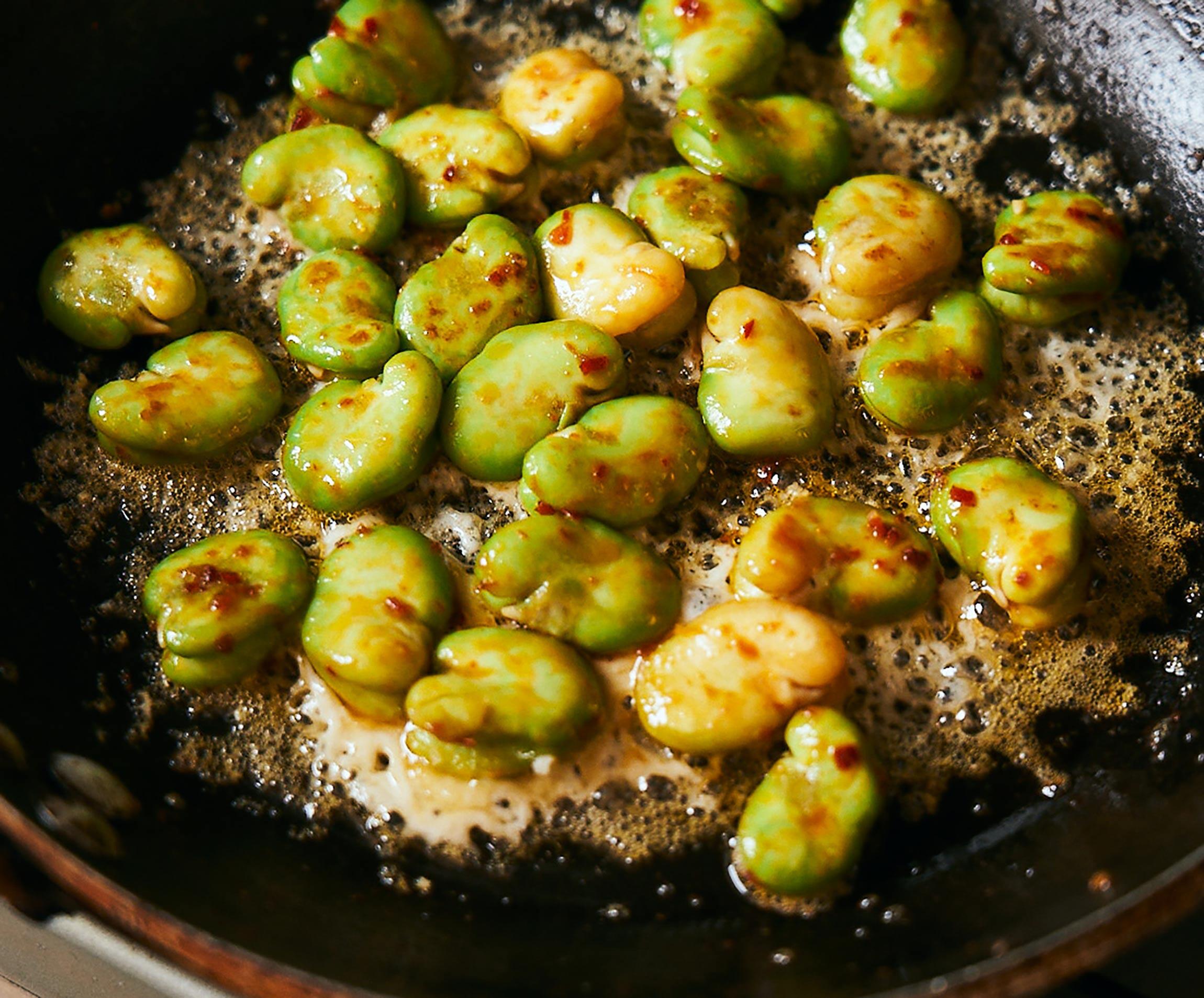 料理研究家の小堀紀代美さんに習ったワインと相性抜群のつまみ料理です。ほくほくのそら豆に香ばしくカリカリに焼いたパルミジャーノ。程よい塩気と後からピリッと立つ豆板醤の辛味が後を引きます。チーズは市販の粉チーズでもOKですが、塊をすりおろすと風味が断然よくなります。