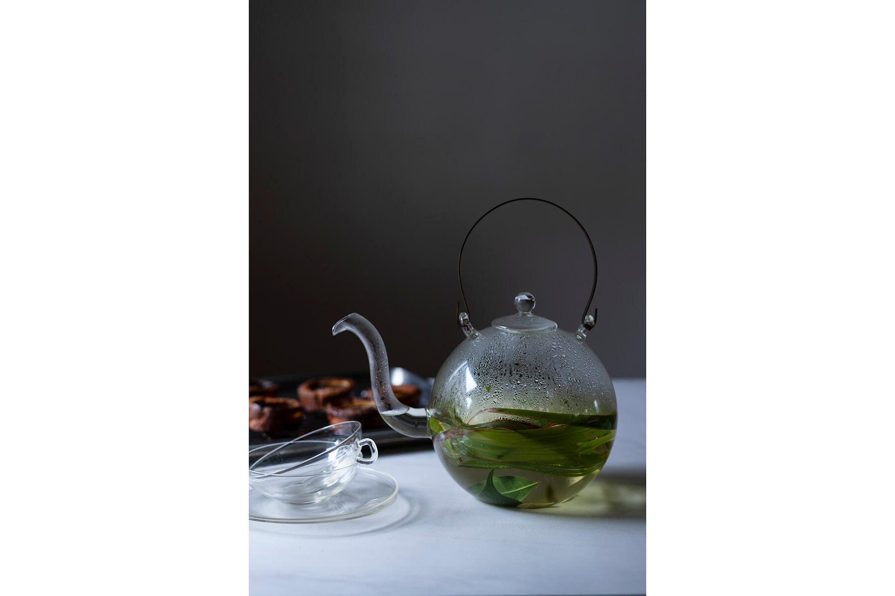 ガラスのポットやティーカップは、フレッシュなハーブを入れてお湯を注ぐだけで絵になる美しさ。そんなクリアなガラスと、香ばしい焼き菓子との質感のコントラストは、ドラマティックで思わず見惚れてしまいます。もっちりとした食感がたまらないファーブルトンはプルーンやりんごが定番ですが、キウイで試してみたら大成功。きりっとした酸味がきいて、暑い時期でもおいしくいただける味わいになりました。