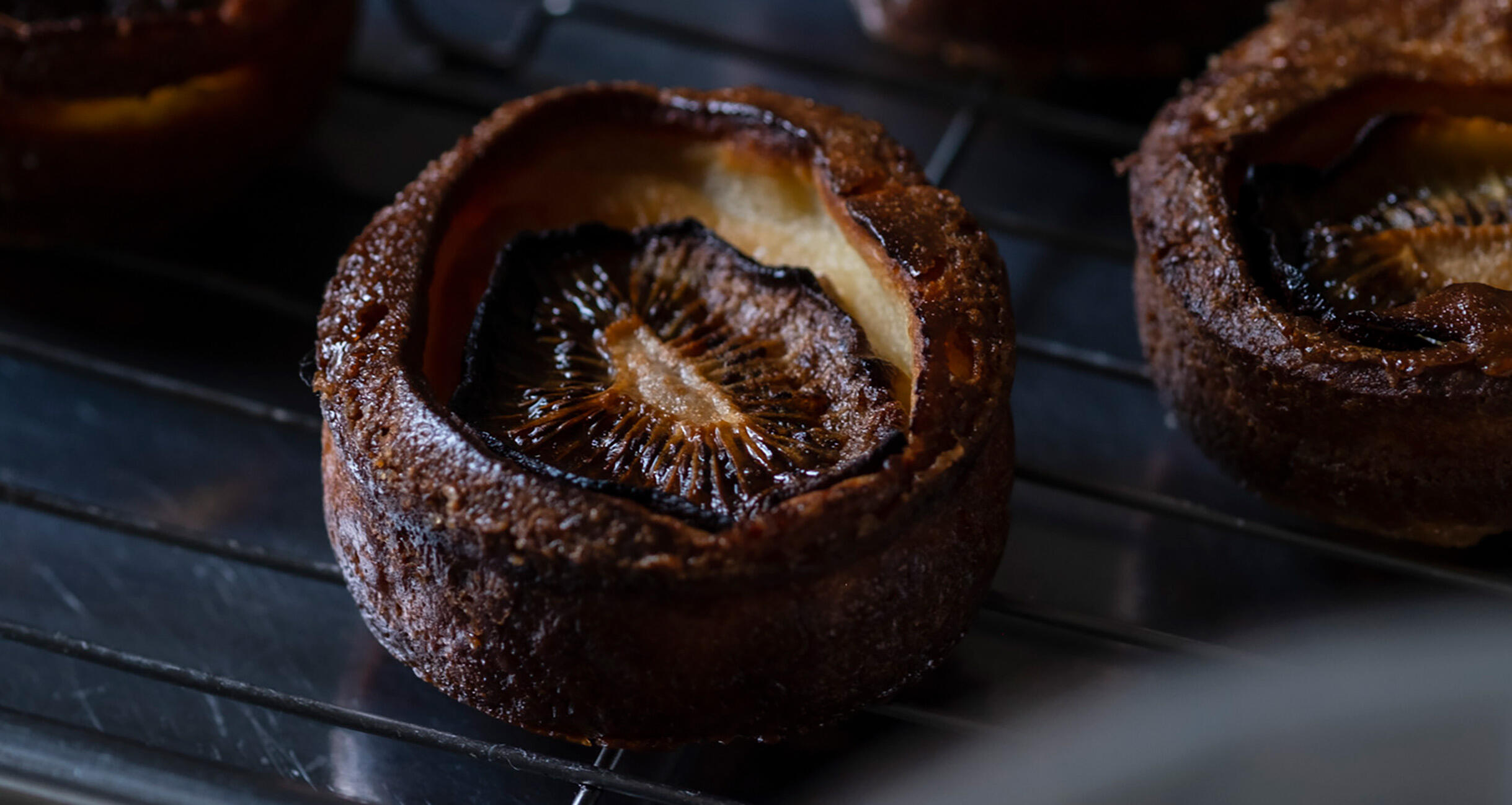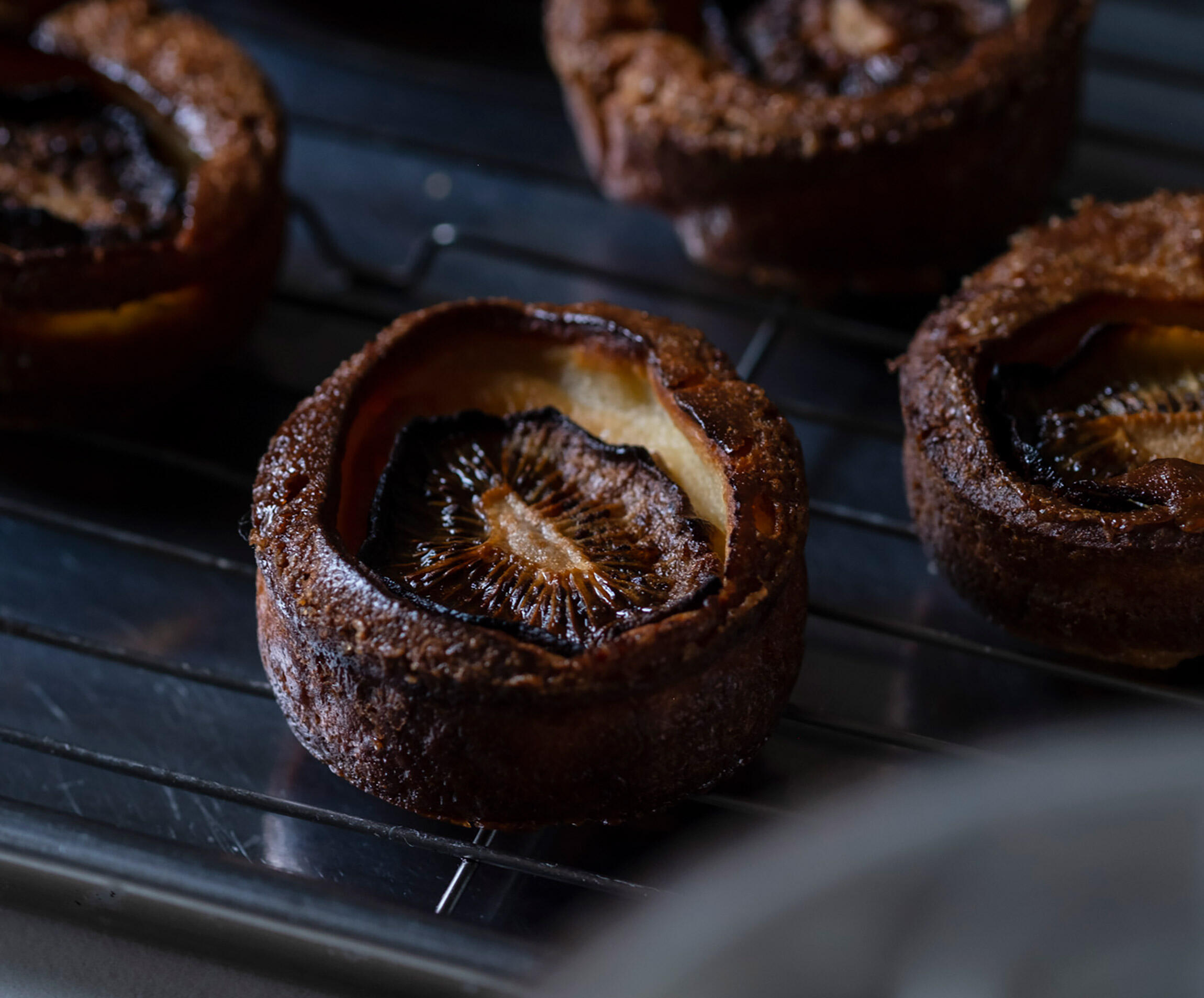 4の生地を軽く混ぜてから、5の型に均等に流し入れる。1のドライキウイと仕上げ用のバター1個を1つずつのせ、ホワイトラムを1~2滴ふる。