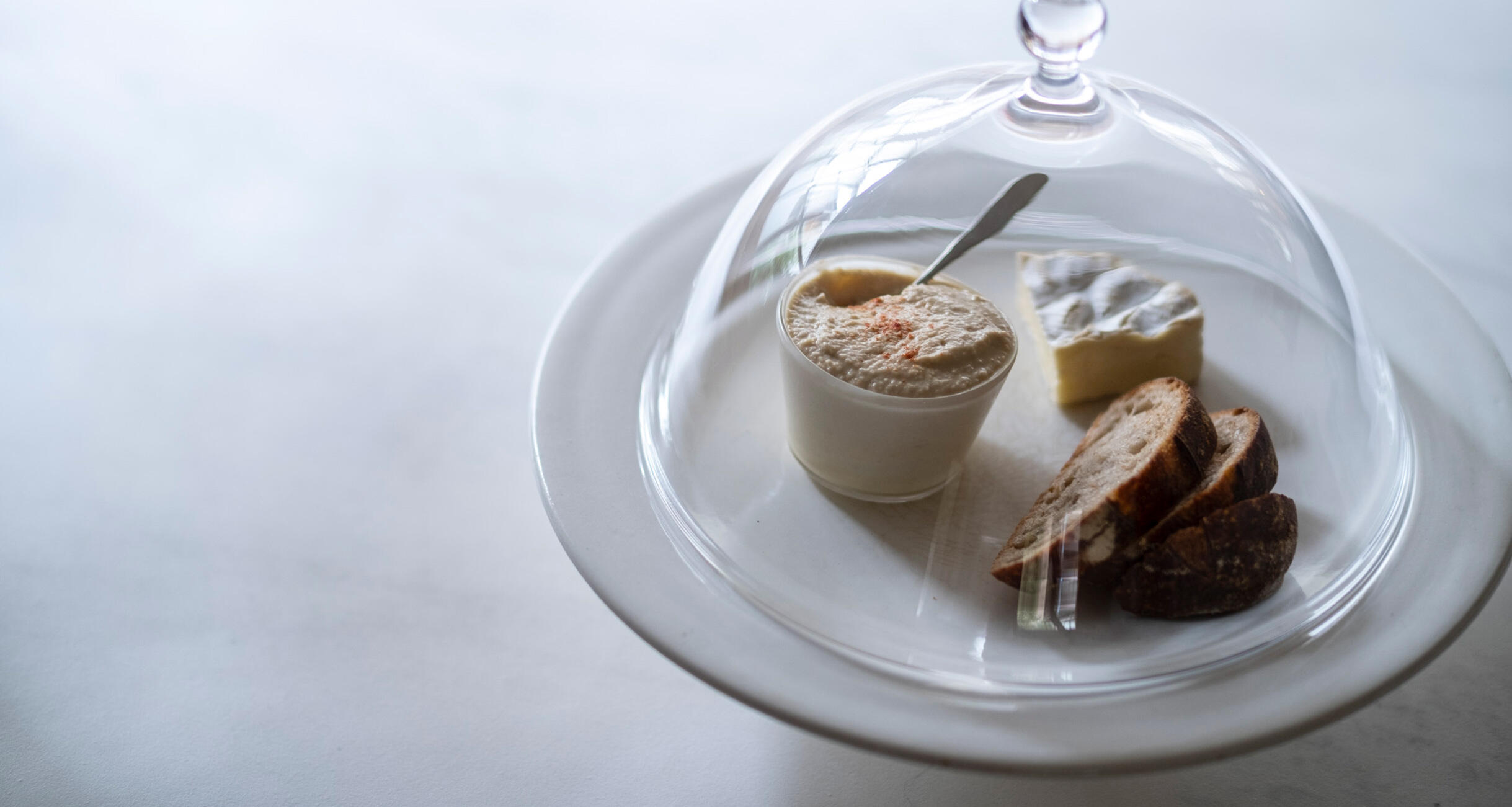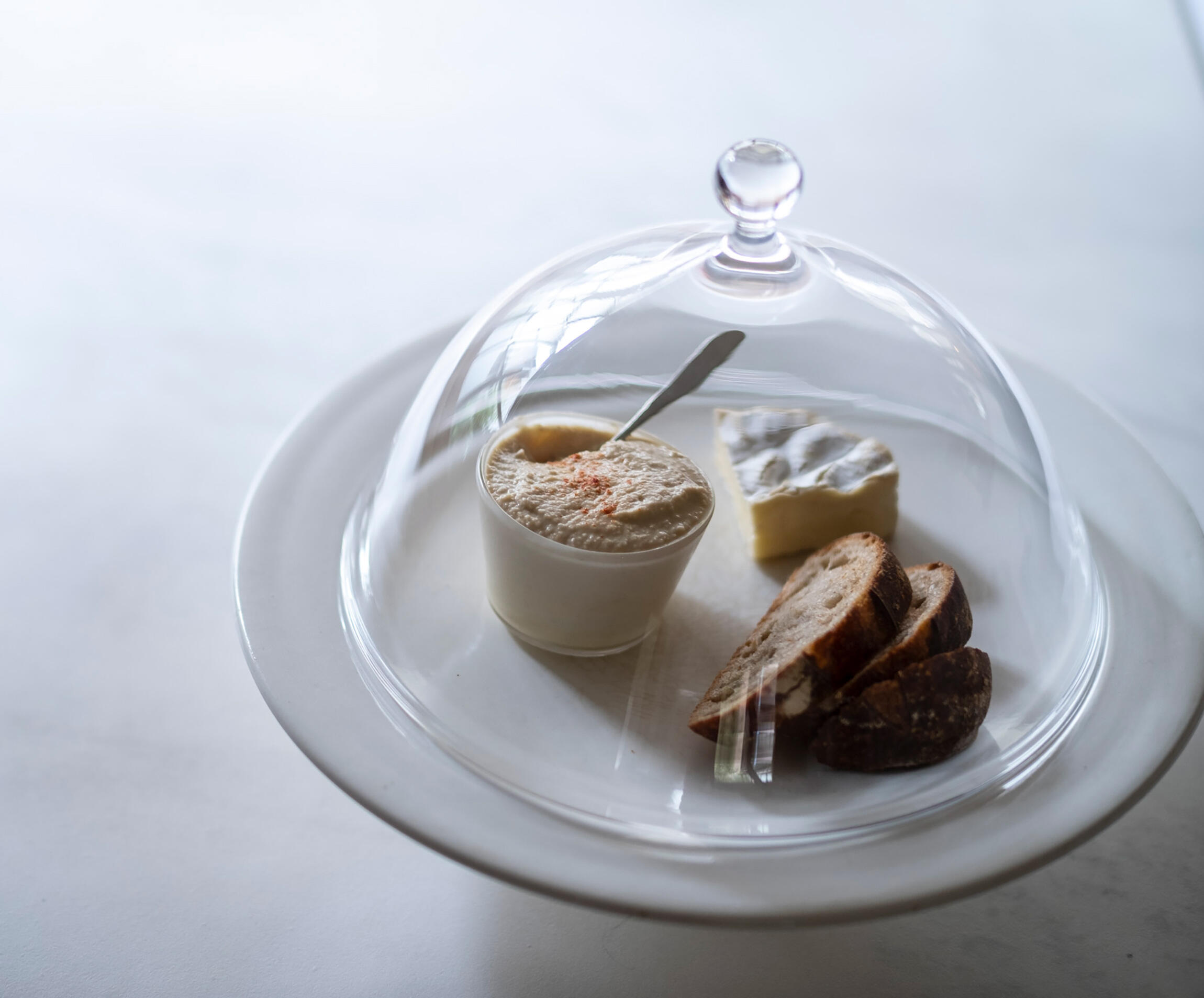 ガラスの透過性を最も生かしたアイテムといえば、フードドーム。手持ちの平皿やコンポート皿にかぶせるだけで、“ちょっと特別な舞台”という雰囲気になるから楽しいのです。ケーキや果物、チーズはもちろん、お酒のおつまみにかぶせたりと、1つあると予想以上に活躍してくれるはず。パンにたっぷり塗って食べたい大豆のフムスは、黒胡椒やパプリカパウダーをふったり、ヨーグルトやフロマージュブランを添えたりしても。フードドームは木下 宝さん、フムスのカップはfactory zoomerのもの。