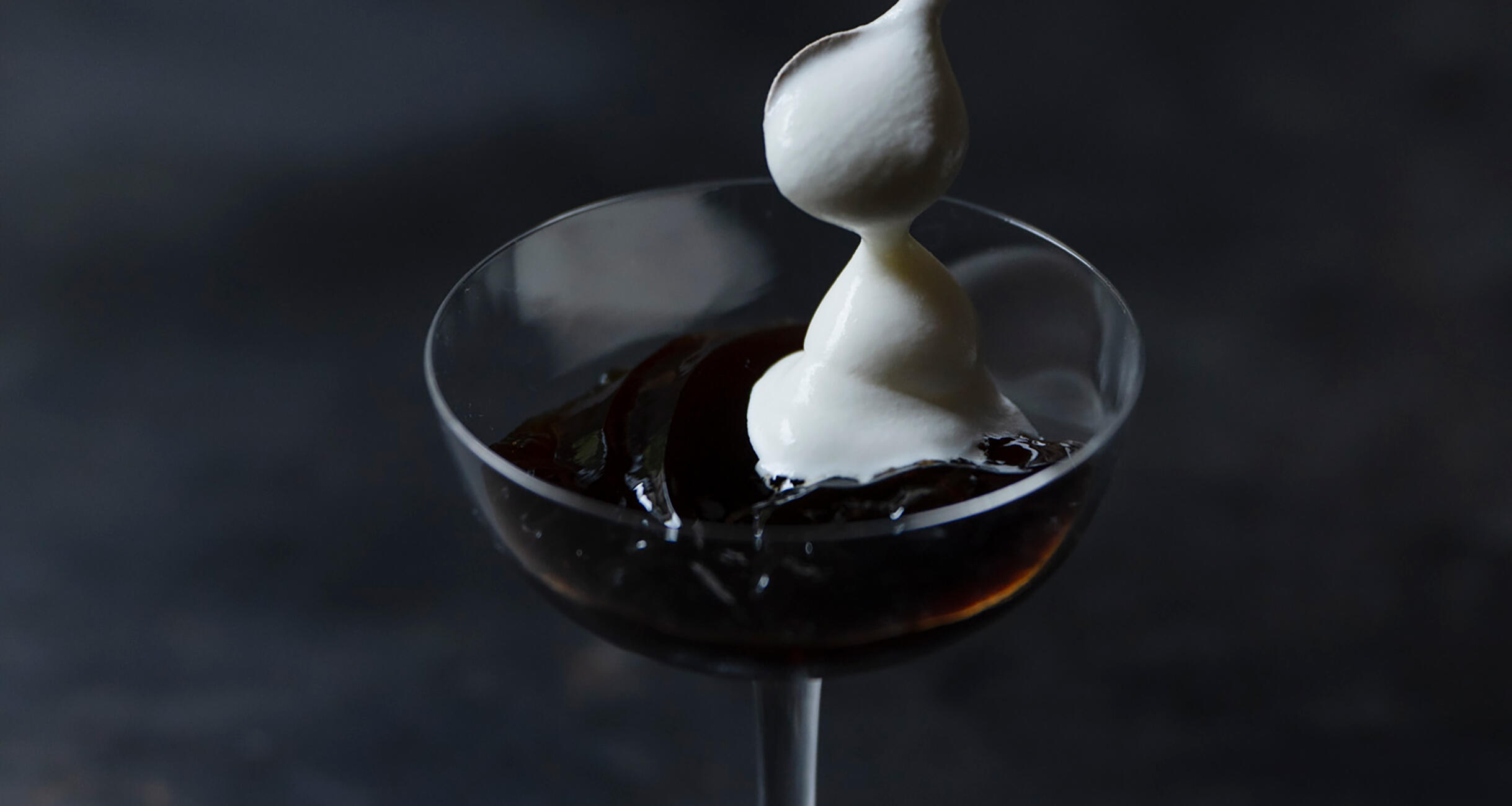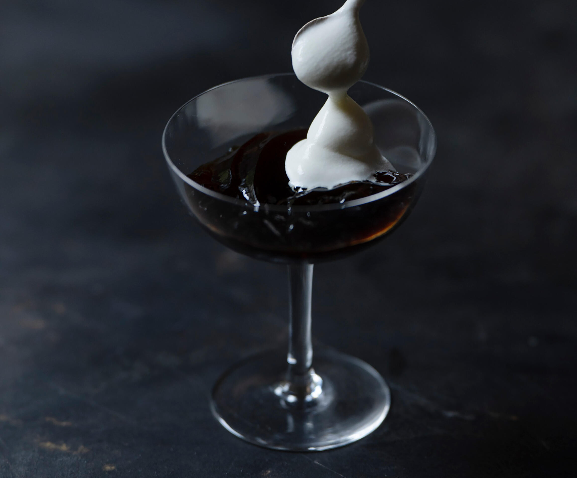 コーヒーの残りを加えてよく混ぜ、茶こしでこしながら密閉容器に注ぎ入れる。気泡にキッチンペーパーを当てて取り除く。冷蔵庫で3時間以上冷やす。