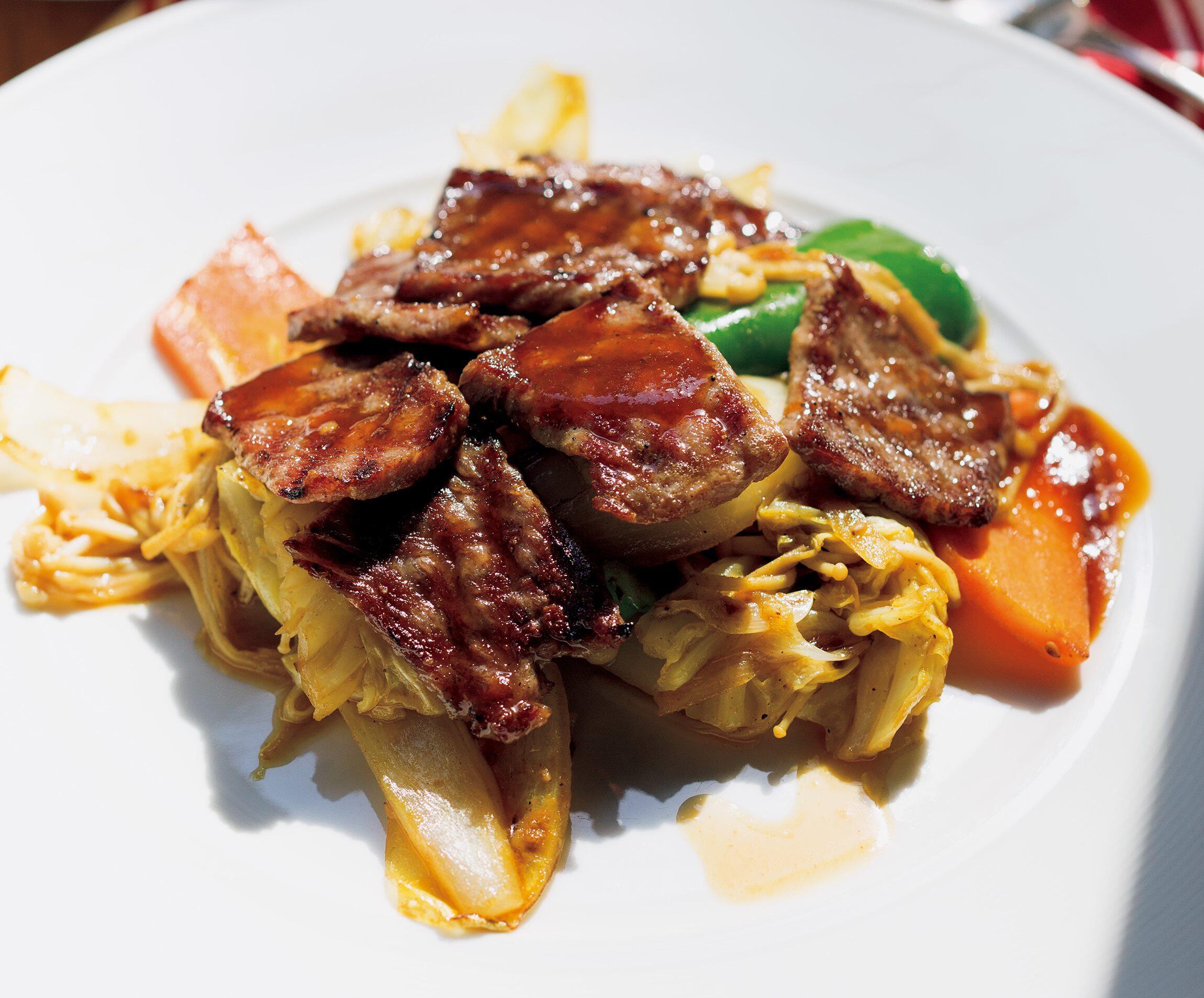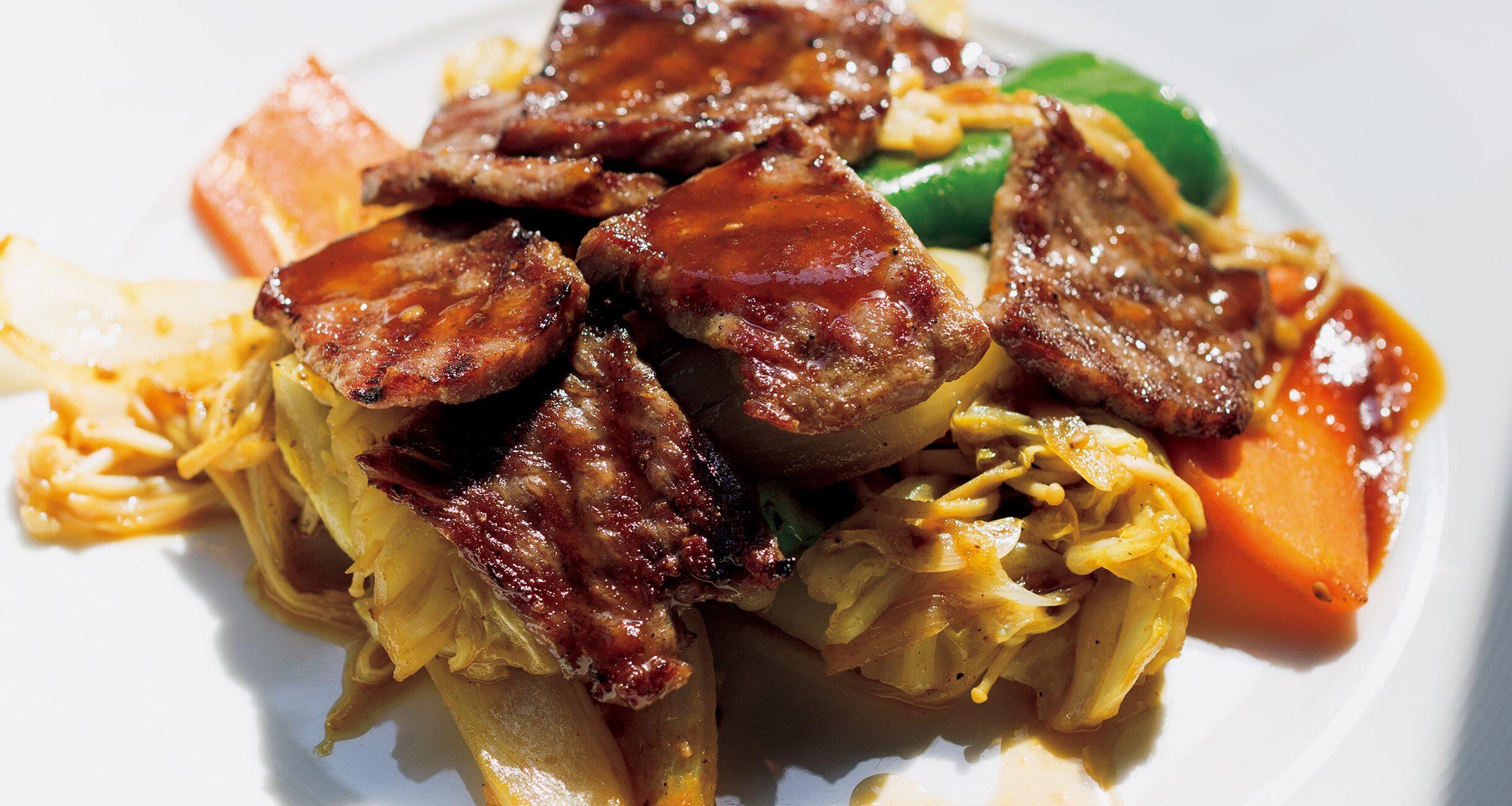 サラダ油をひいた鉄板を熱し、温まったら1の野菜をまとめて入れて炒める。全体に油が回ったら、野菜に火が通りやすいように、水を少し加えて炒める。カレー粉と焼き肉のタレを加えて、全体に味がからんで、野菜がしんなりしたら器に盛る。