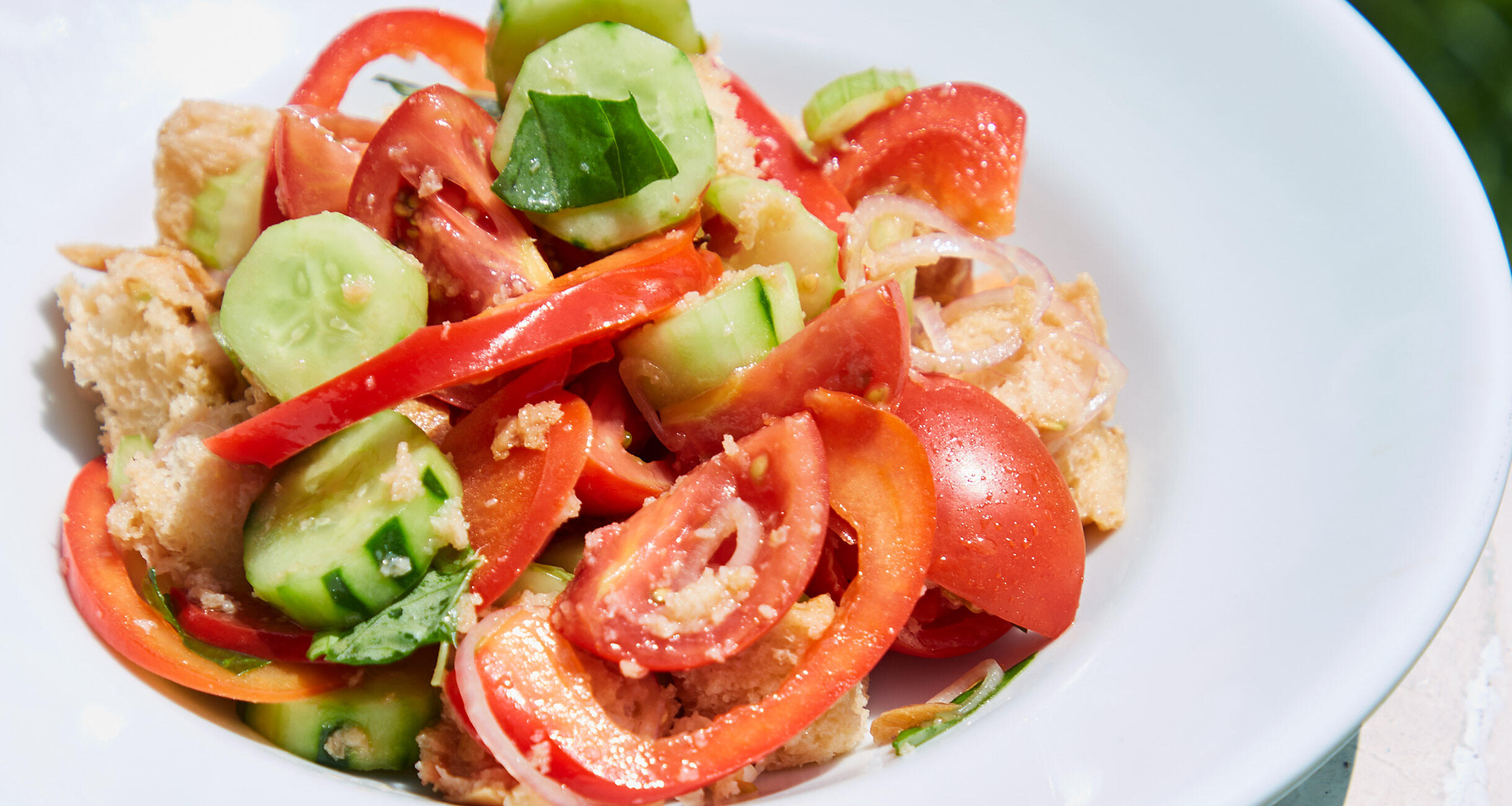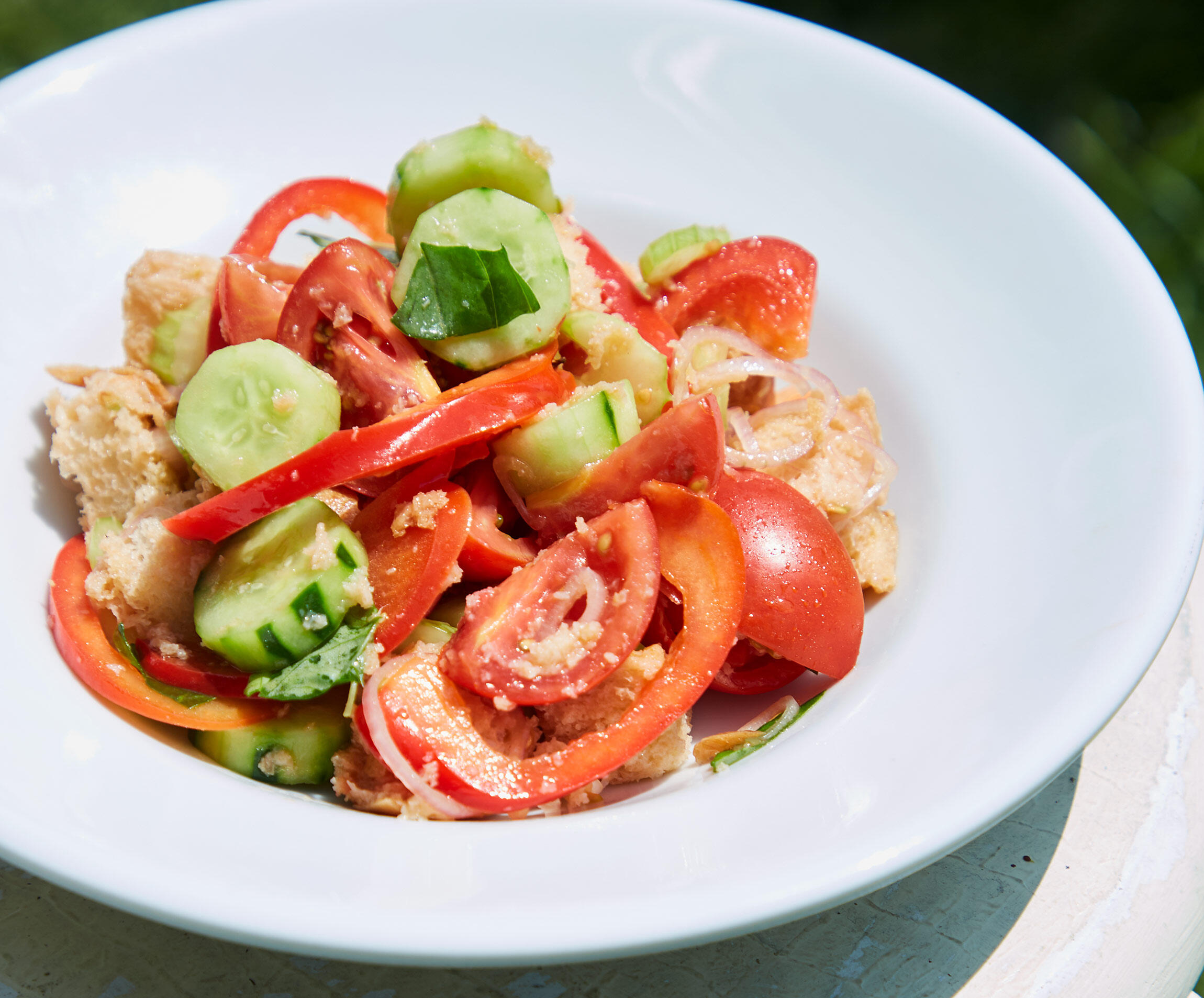 野菜に塩をふったら水分が出るので、それをパンに吸わせて仕上げるのがポイント。きゅうりも皮をむくことで水分が出て、なじみやすくなる。野菜はきれいに切りすぎるとおいしそうに見えないので、ざっくり切って。