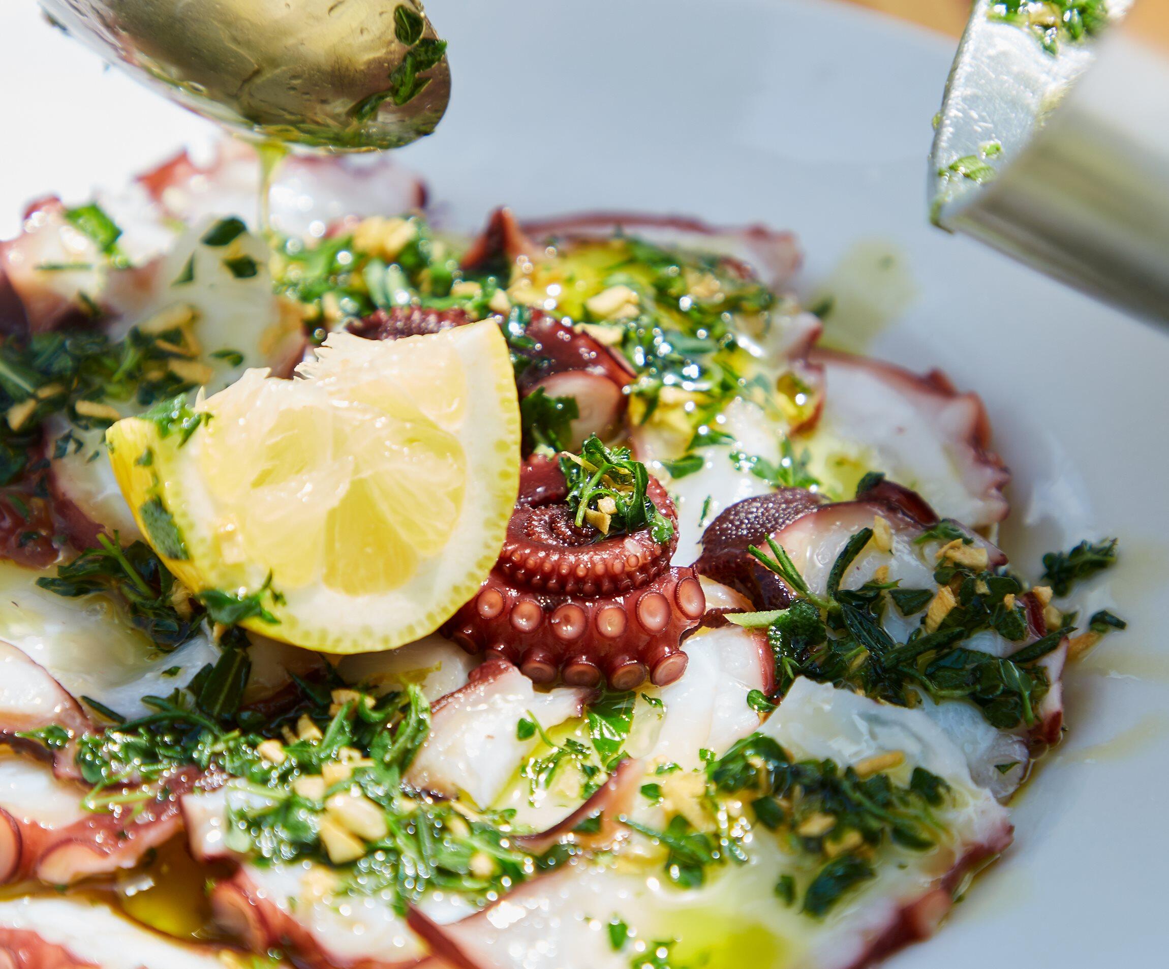 1のタコの上に搾った残りのレモンを皮ごとのせ、3の熱いハーブオイルをまんべんなく回しかける。