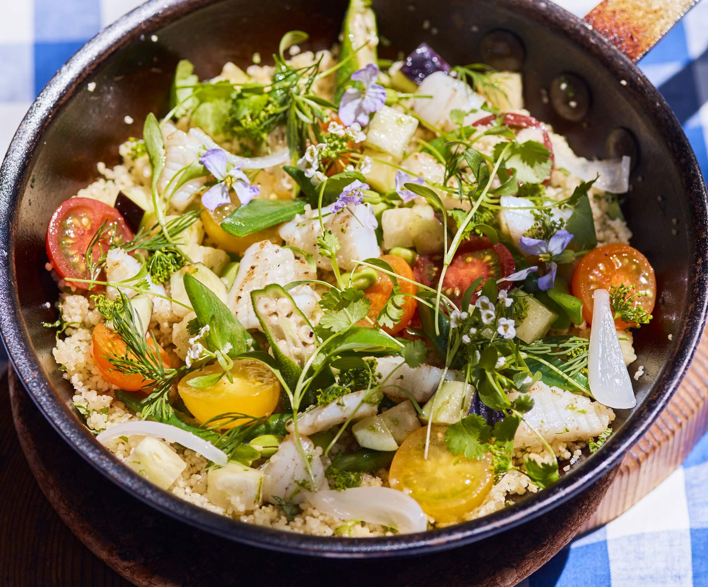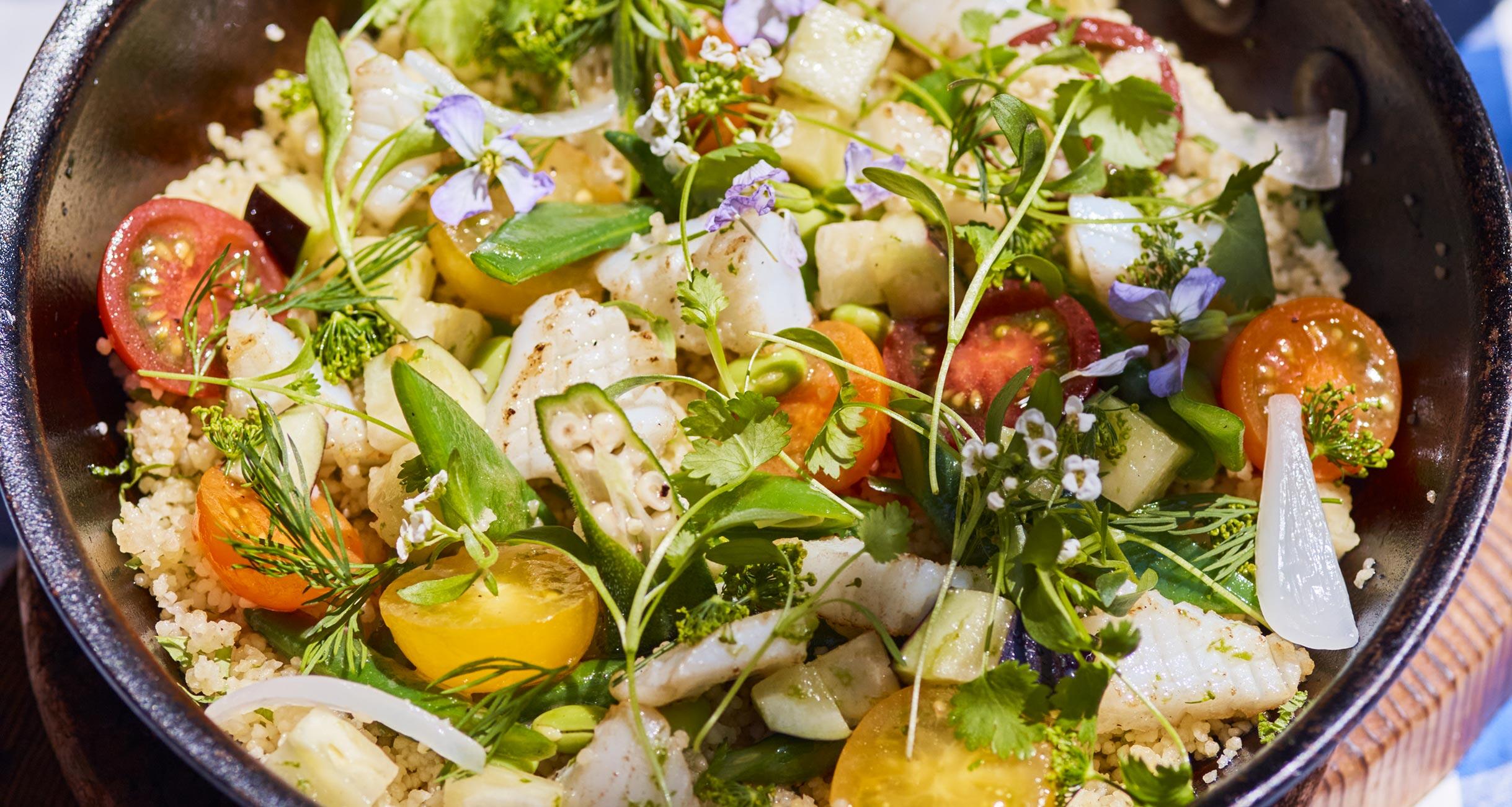 彩り豊かな夏野菜を使って、さっぱりと味わいたいタブレ。上にのせる野菜とイカはあらかじめ準備しておき、フライパンで仕上げる。具材ごとに合う味つけをすることで、ワンランク上のおいしさに昇格するのだ。