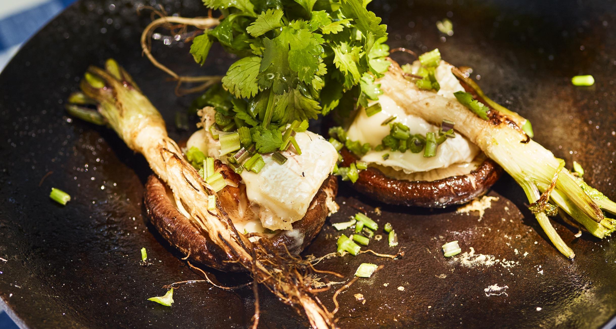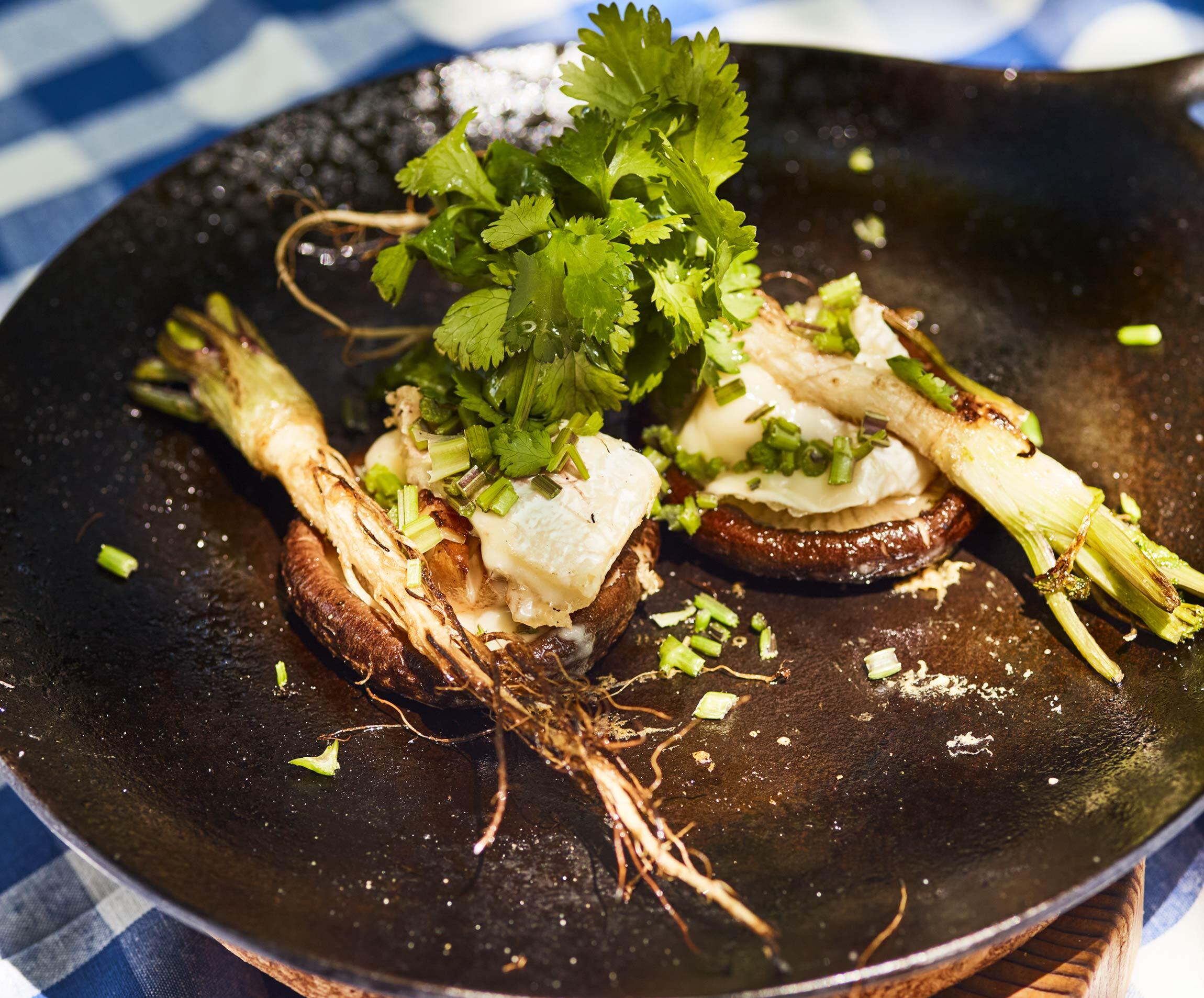 風味豊かな原木椎茸を見つけたら、ぜひつくってほしいレシピ。お店ではセリの根を使って提供しているが、パクチーの根も野生のにんじんみたいな滋味豊かな味わいがあり、しっかり焼くことでさらに香りもよくなる。