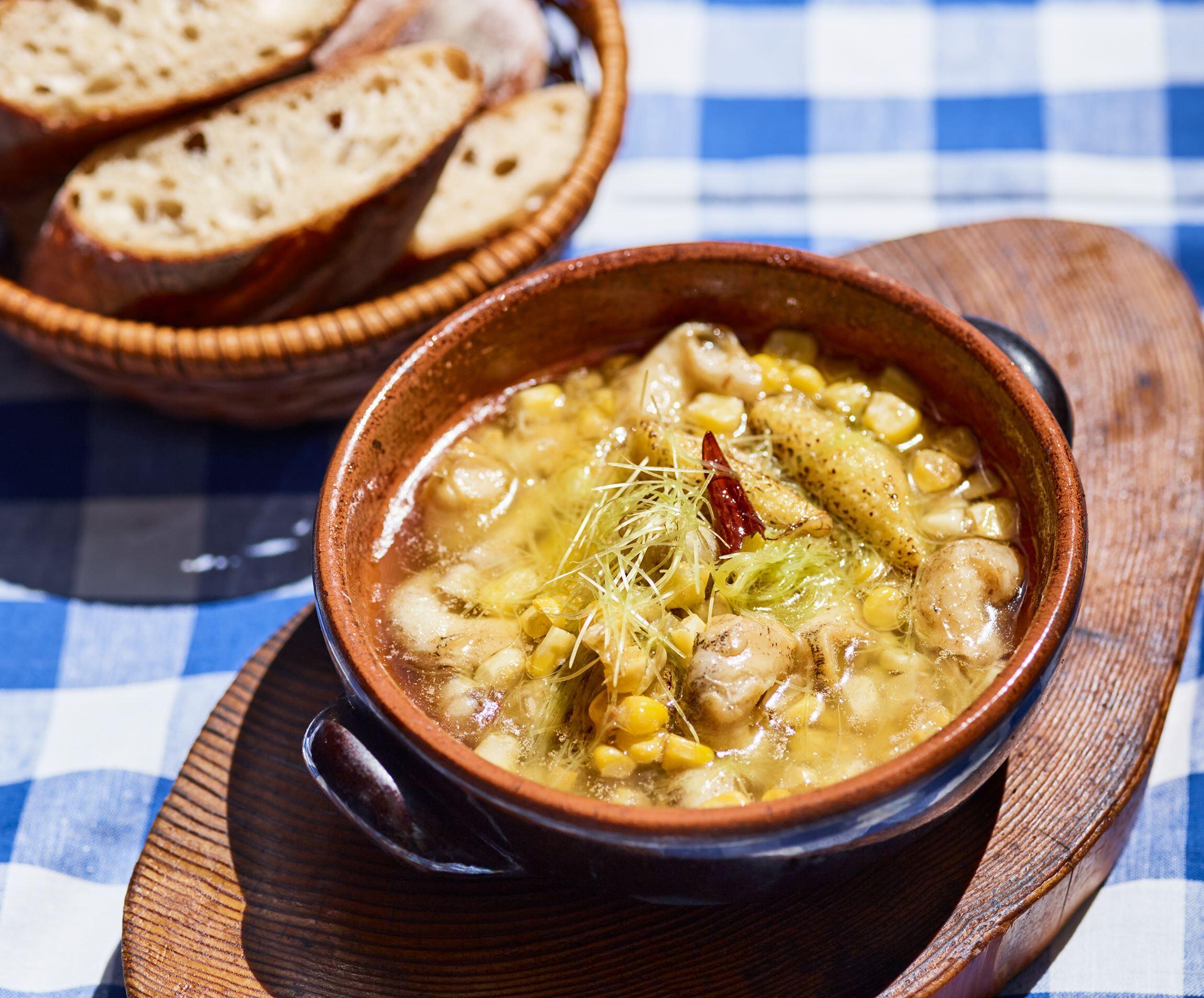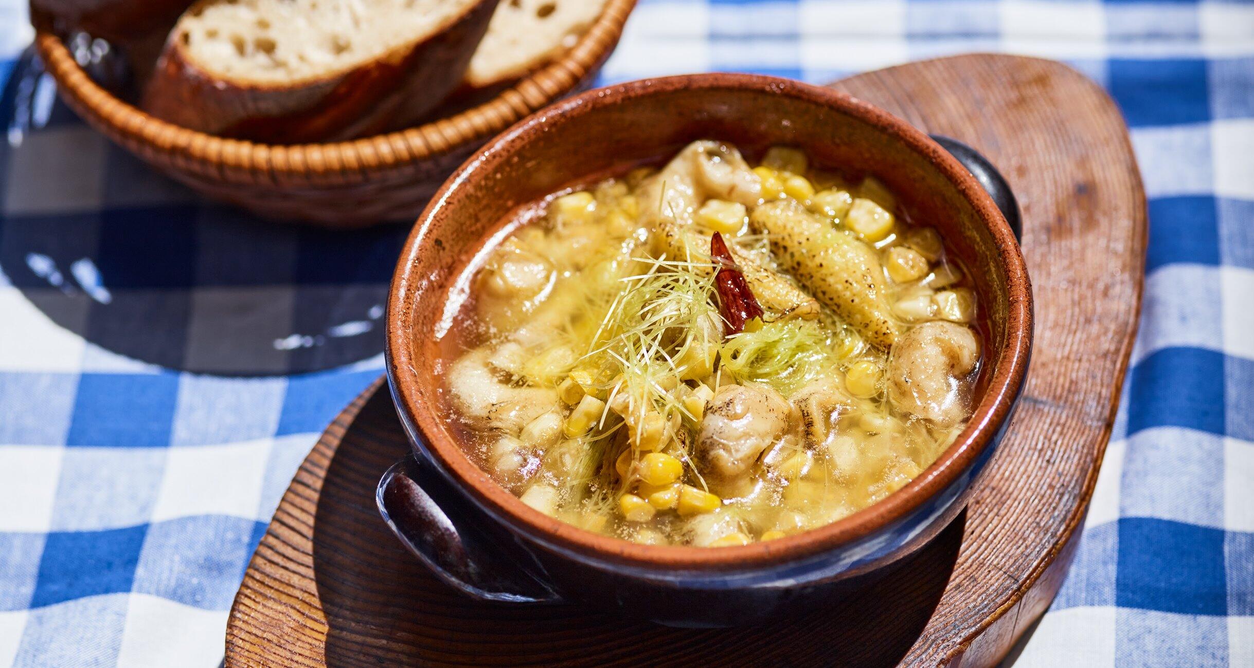 火にかけられる耐熱皿に先にヤングコーンを並べて焼き、こんがりさせるのは、おいしそうに見せるため。面倒な場合は、焼かずにそのまま入れてもかまわない。忘れずにパンを添えて、オイルに浸して楽しもう。