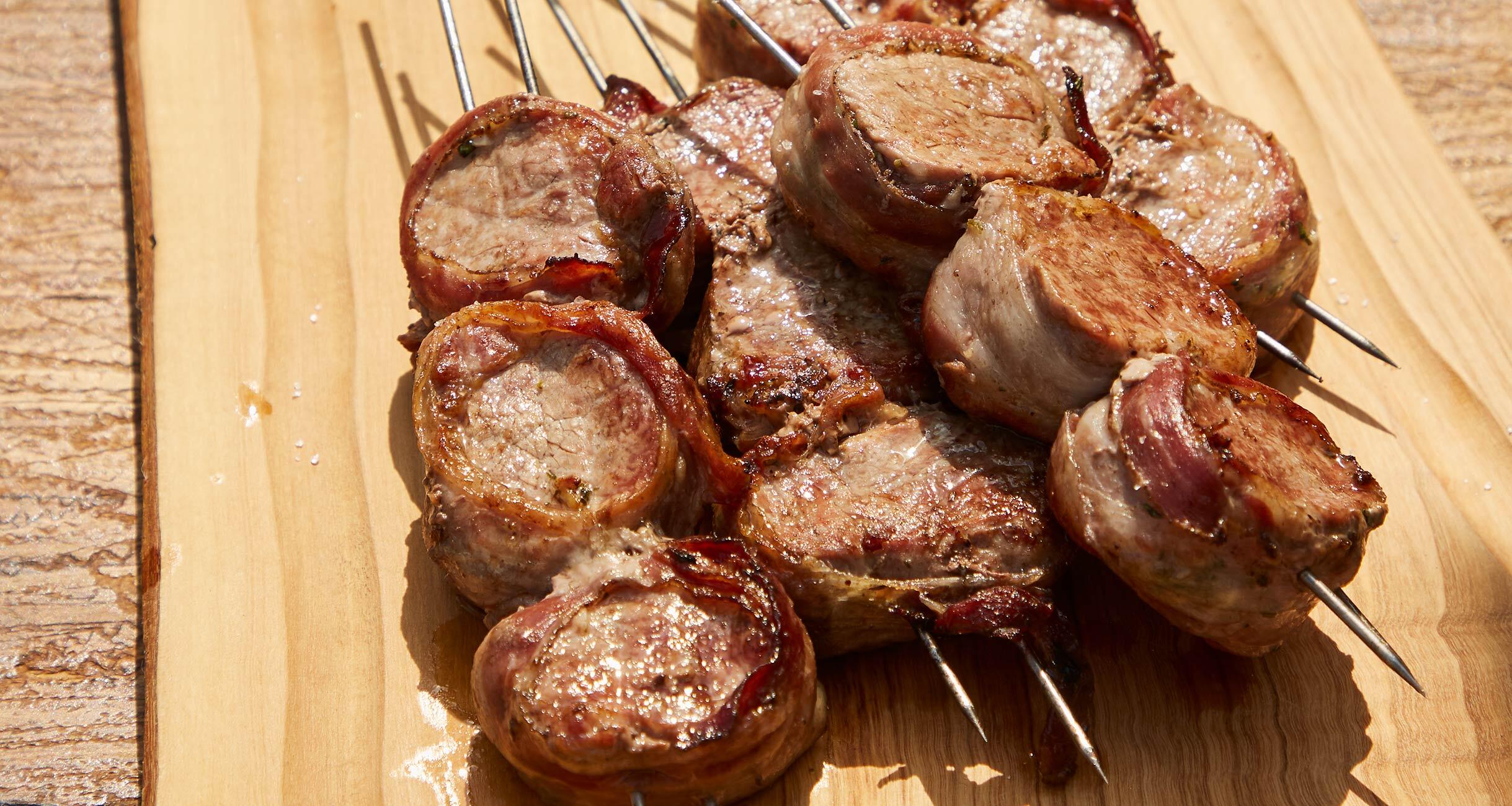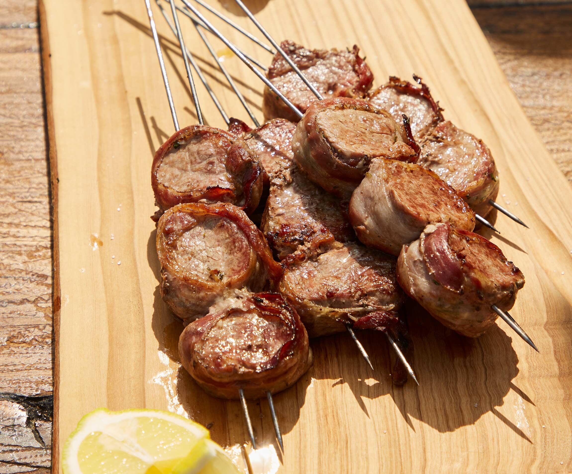 「メダリオーネ」という名前は、厚めにカットした豚ヒレ肉がメダルのような形状をしていることから。パンチェッタの巻き終わりを隠すようにして、肉がクルクル回らないように金串を2本刺すことで、きれいに焼ける。